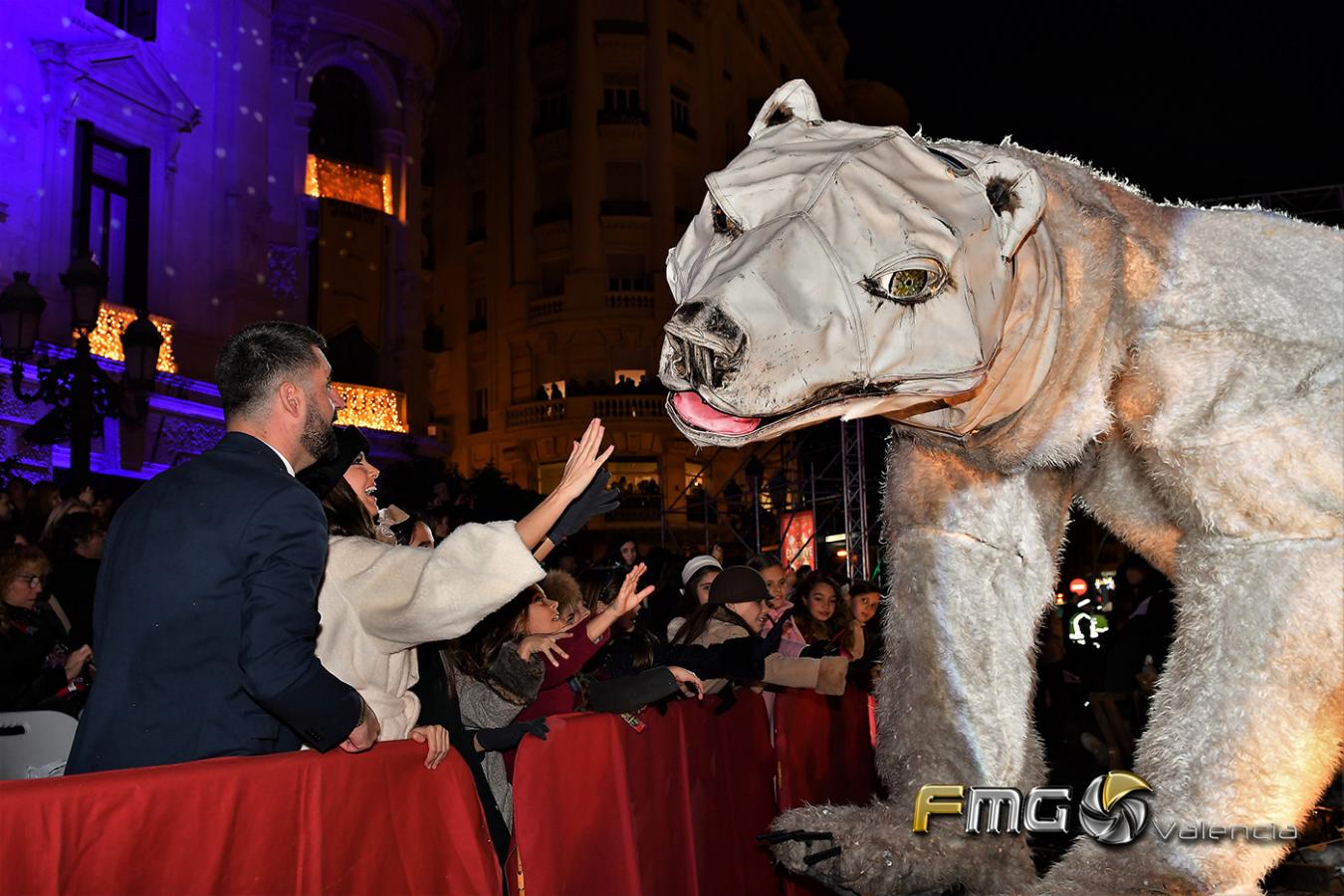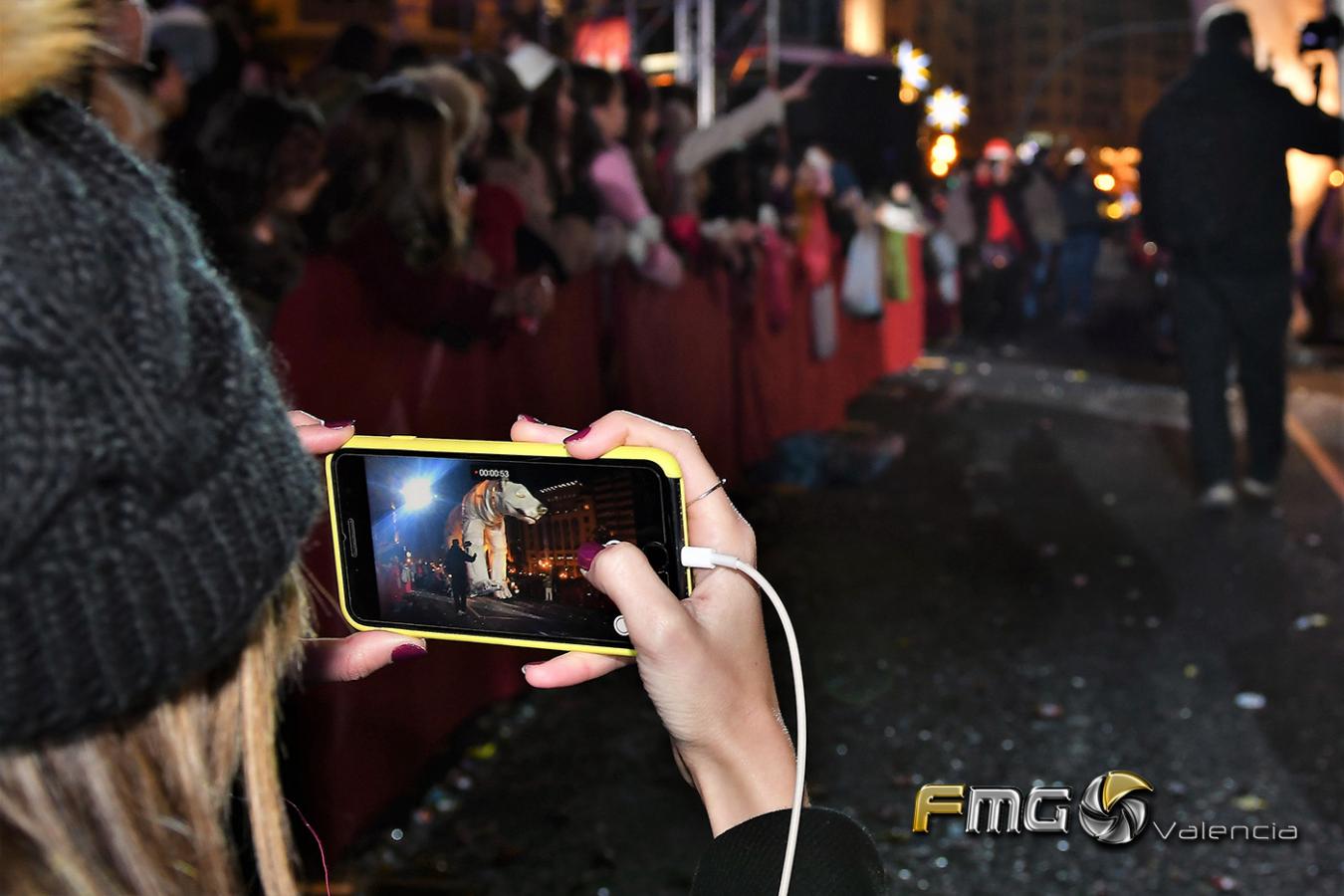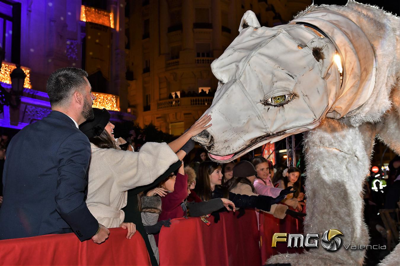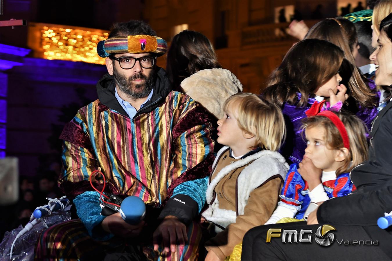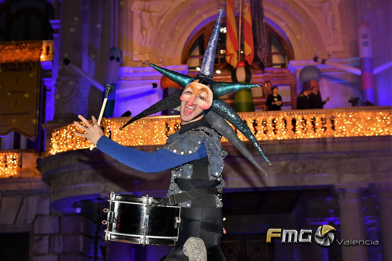 Fotos de la CABALGATA DE REYES VALENCIA 2019, sábado 5 de enero de 2019, a su llegada a la Plaza del Ayuntamiento. Con un gran desfile con grupos de animación, música y comparsas, se preparó una gran fiesta para dar la bienvenida a Melchor, Gaspar y Baltasar, con un final piromusical.