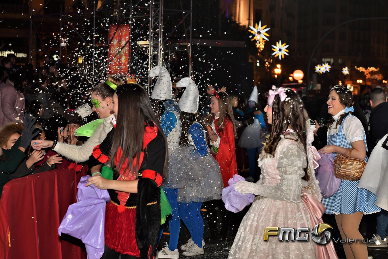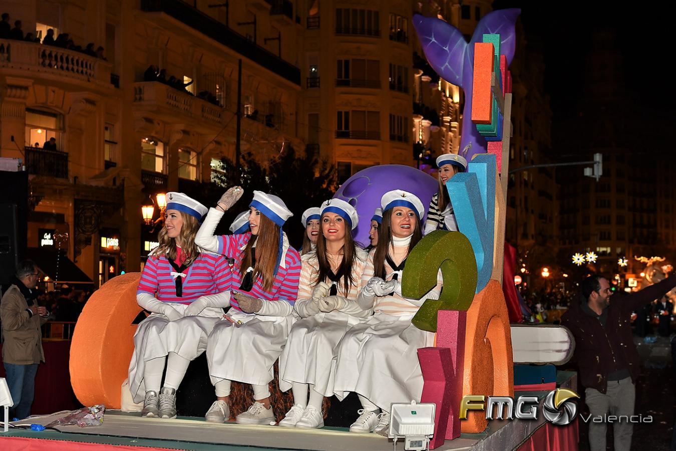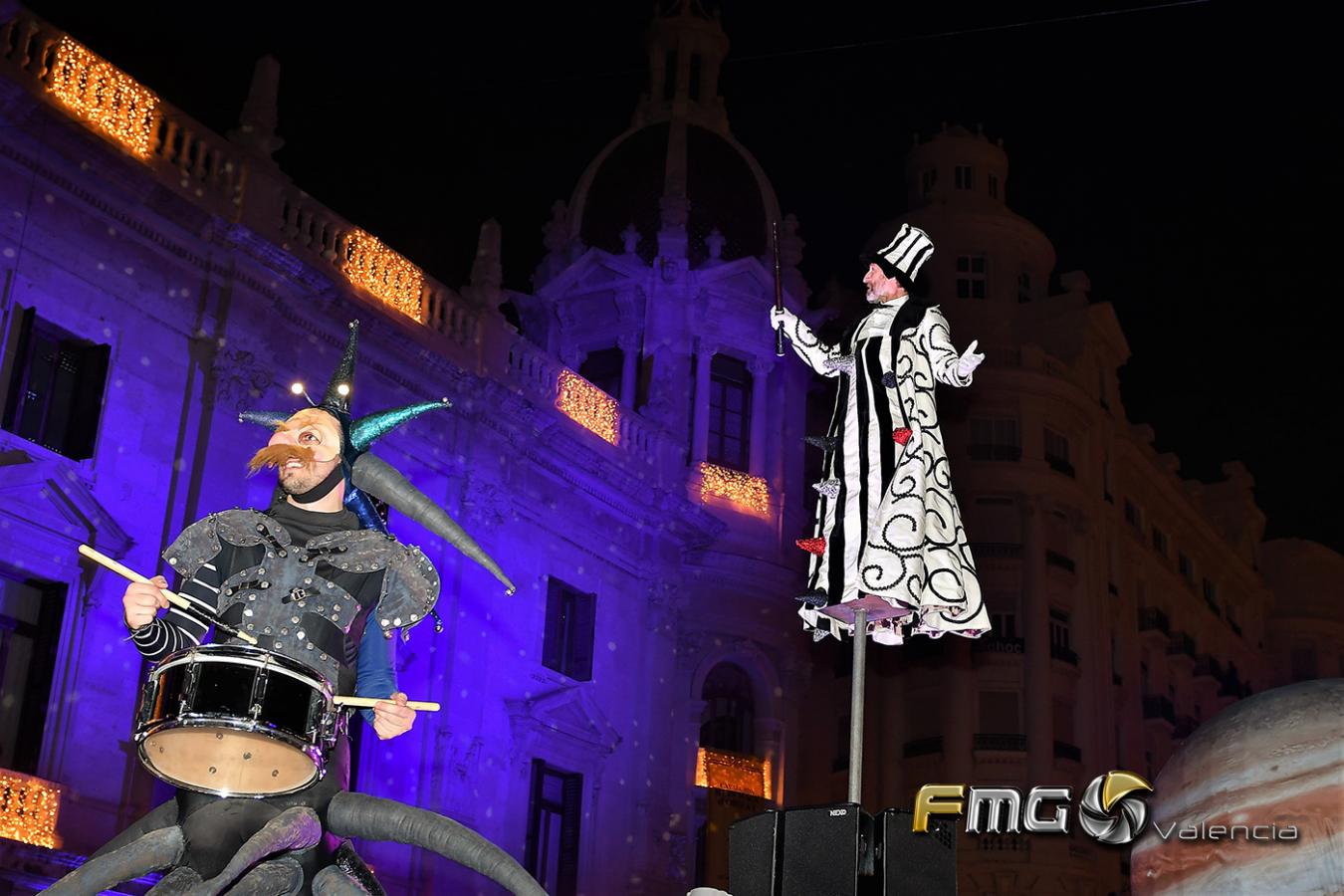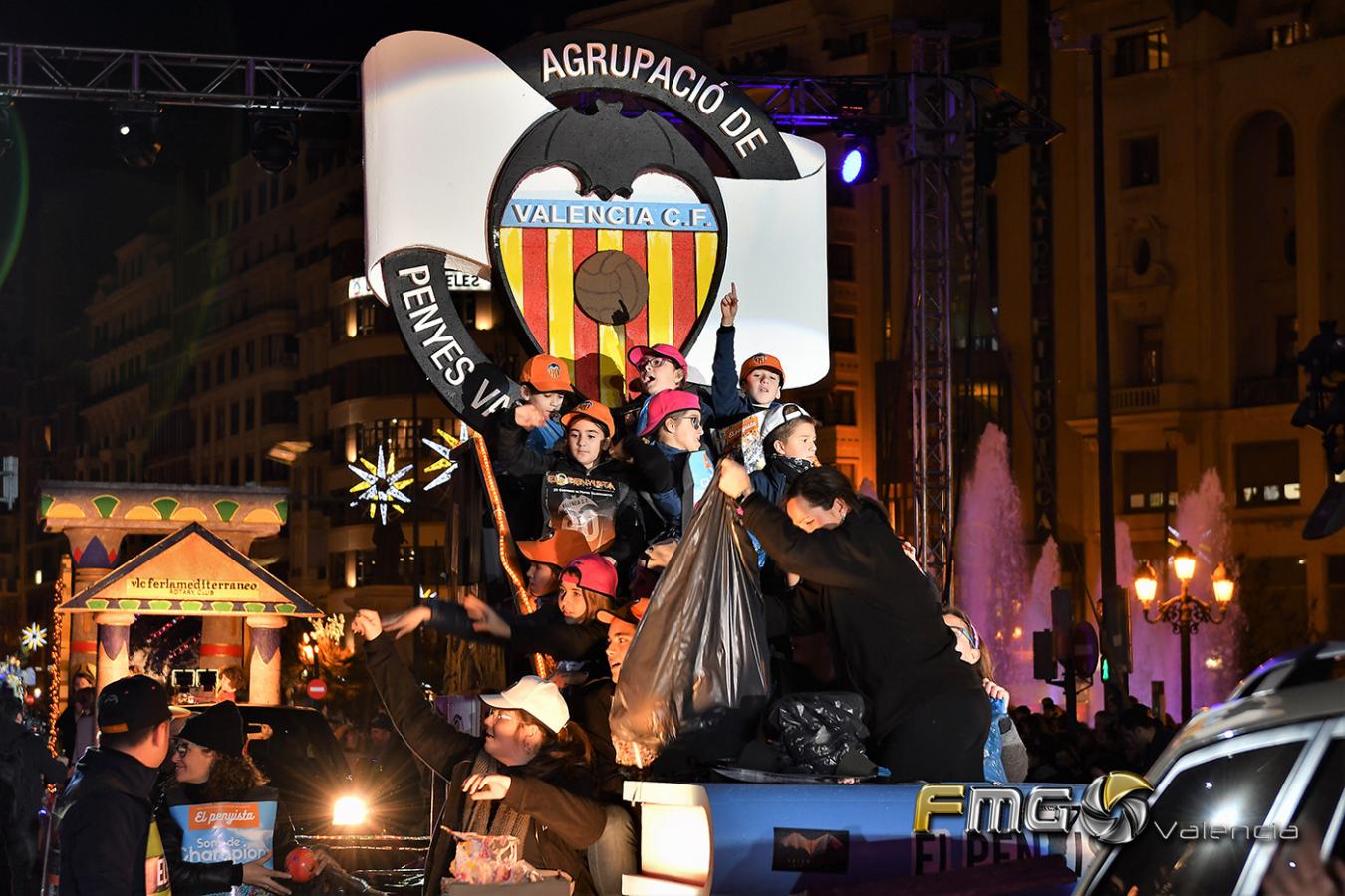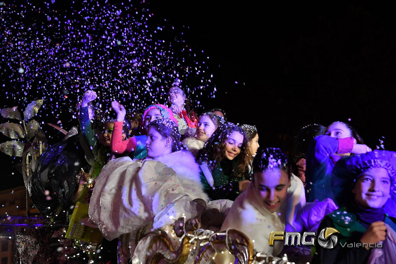 Fotos de la CABALGATA DE REYES VALENCIA 2019, sábado 5 de enero de 2019, a su llegada a la Plaza del Ayuntamiento. Con un gran desfile con grupos de animación, música y comparsas, se preparó una gran fiesta para dar la bienvenida a Melchor, Gaspar y Baltasar, con un final piromusical.