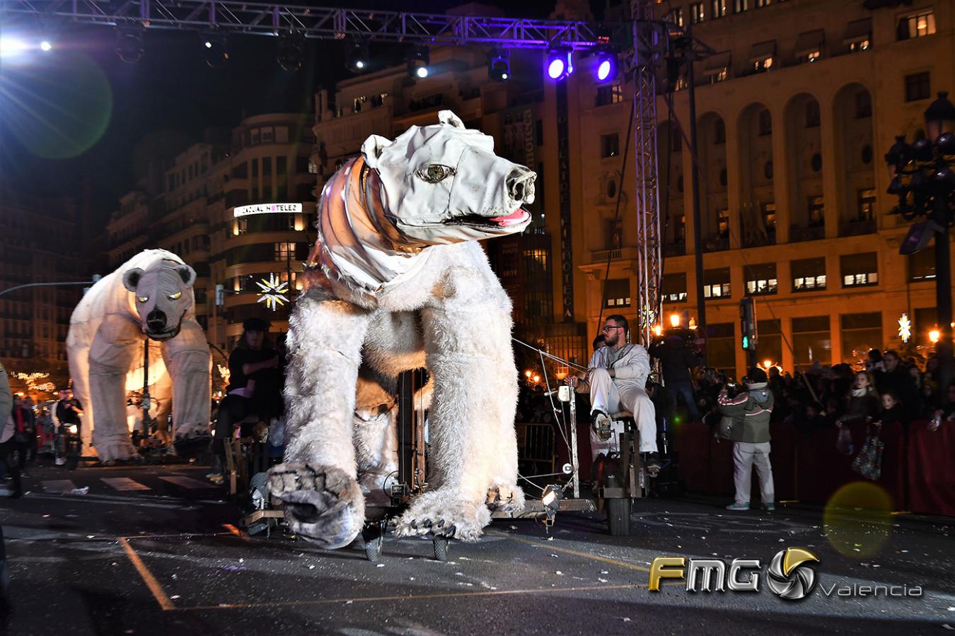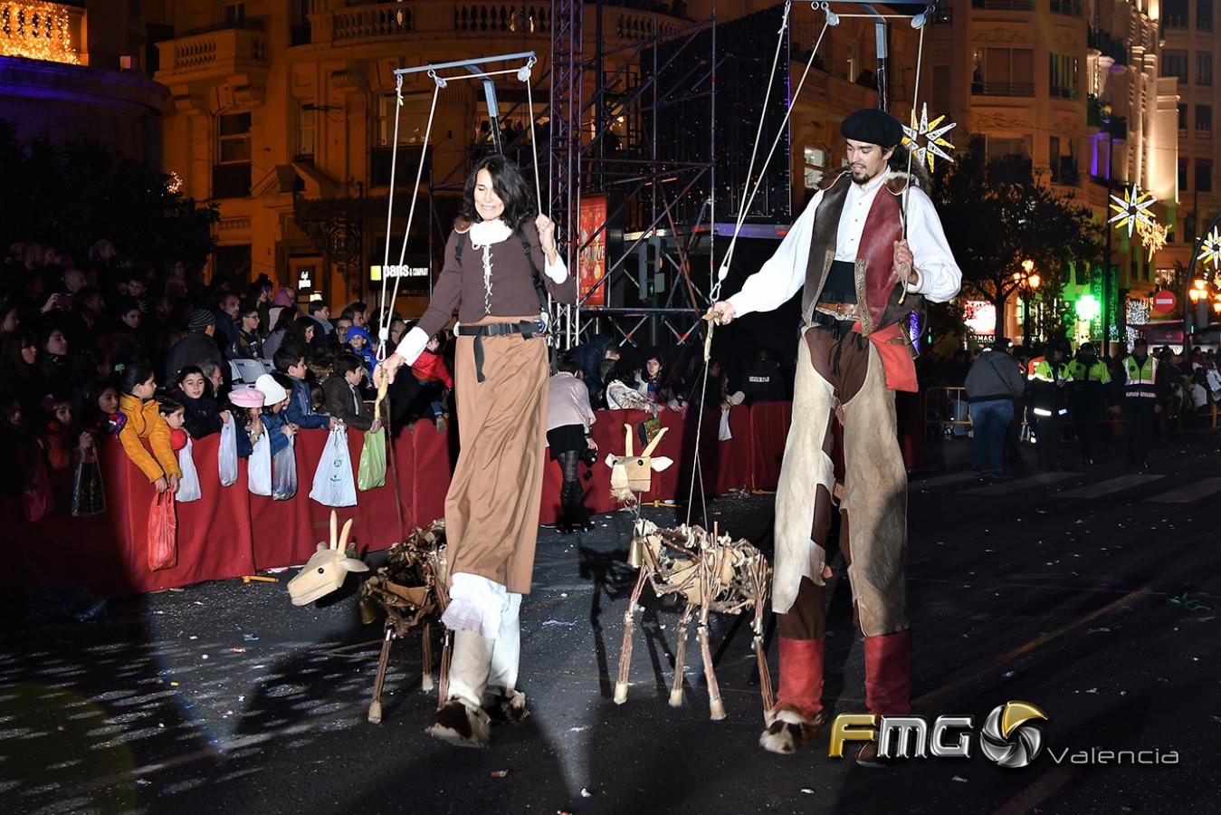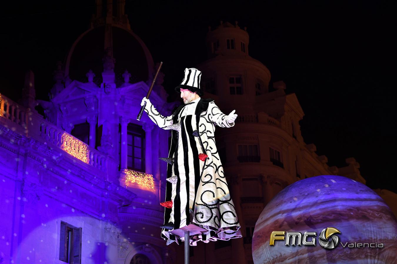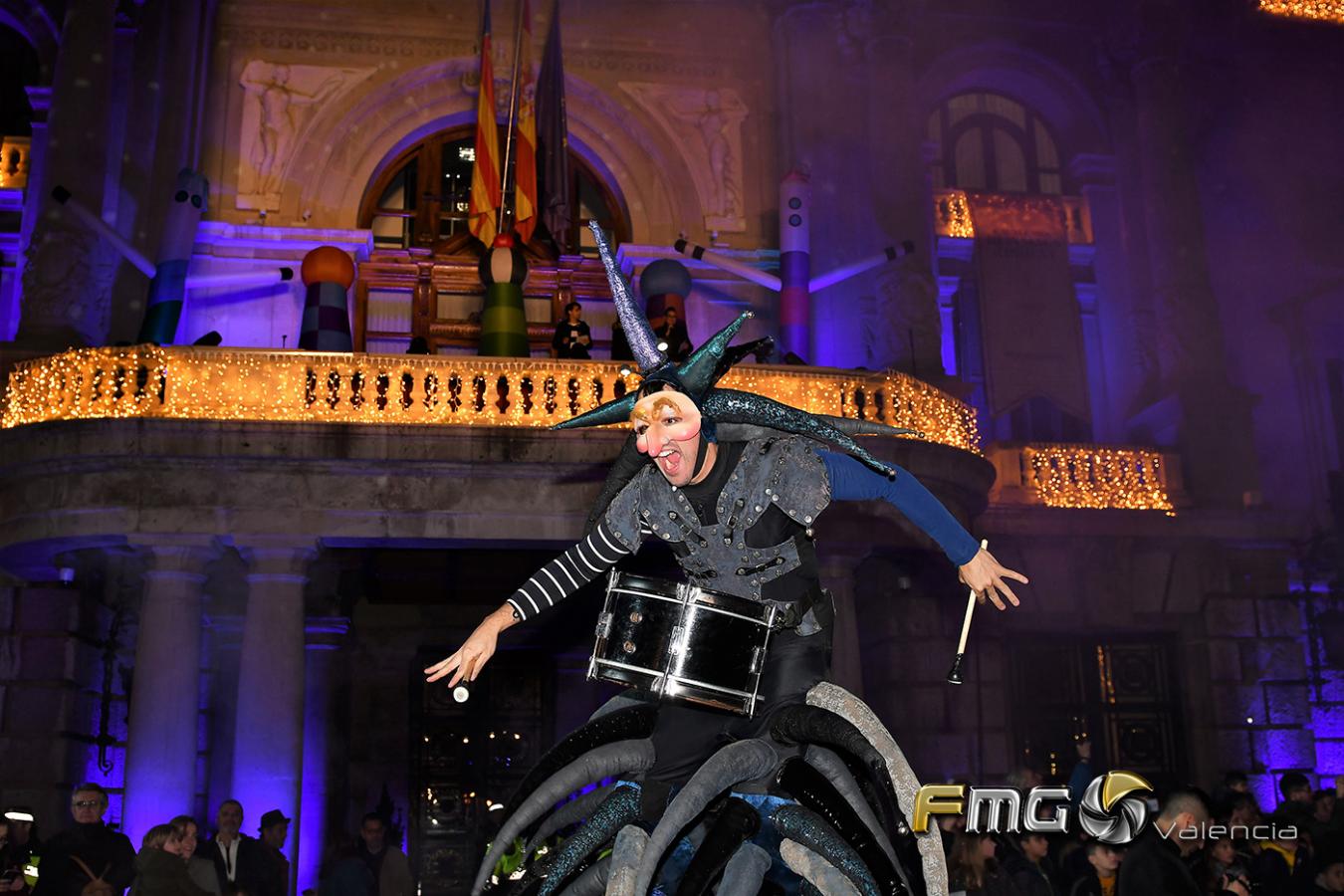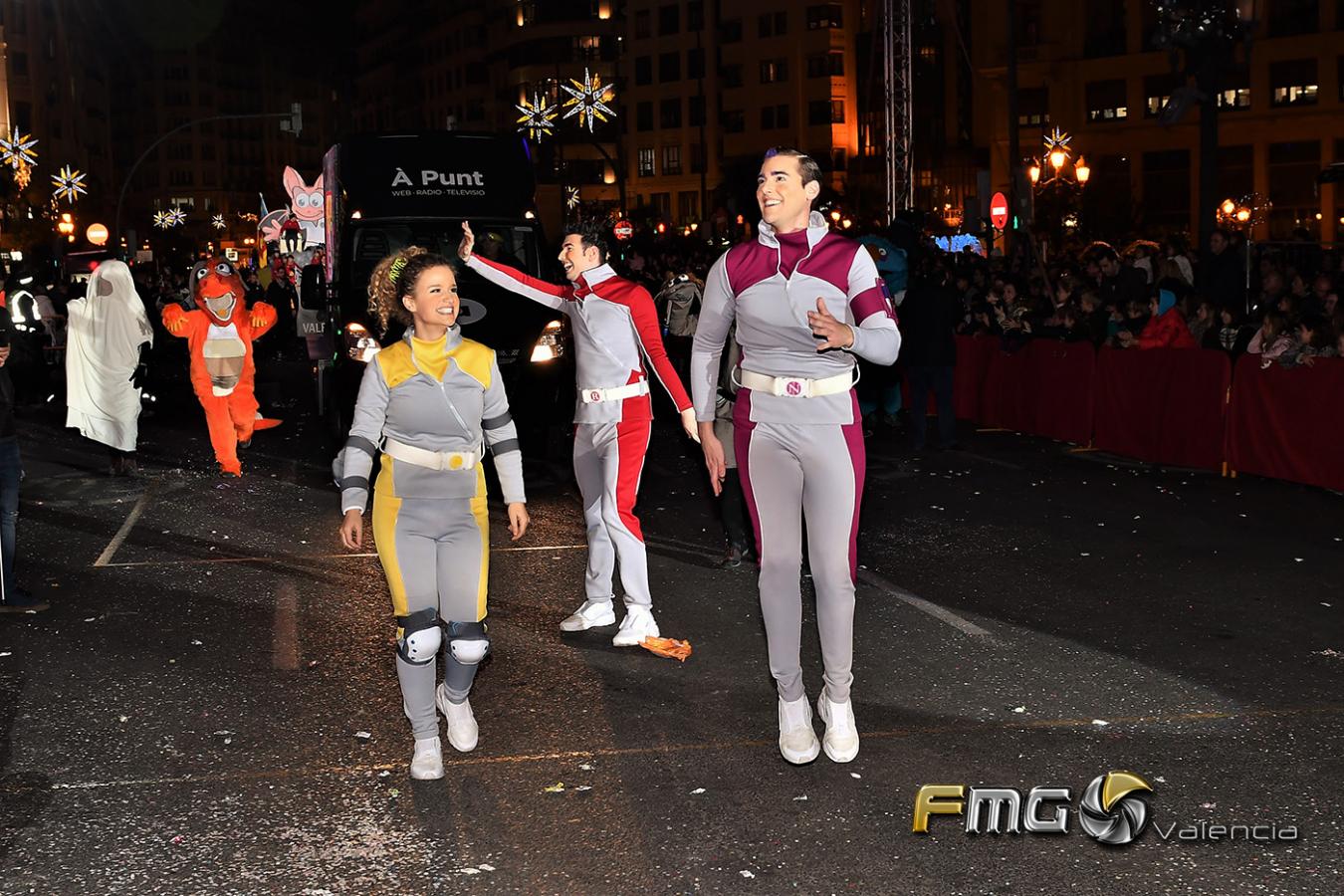 Fotos de la CABALGATA DE REYES VALENCIA 2019, sábado 5 de enero de 2019, a su llegada a la Plaza del Ayuntamiento. Con un gran desfile con grupos de animación, música y comparsas, se preparó una gran fiesta para dar la bienvenida a Melchor, Gaspar y Baltasar, con un final piromusical.