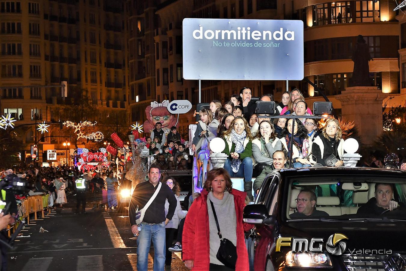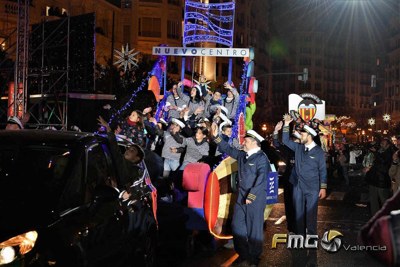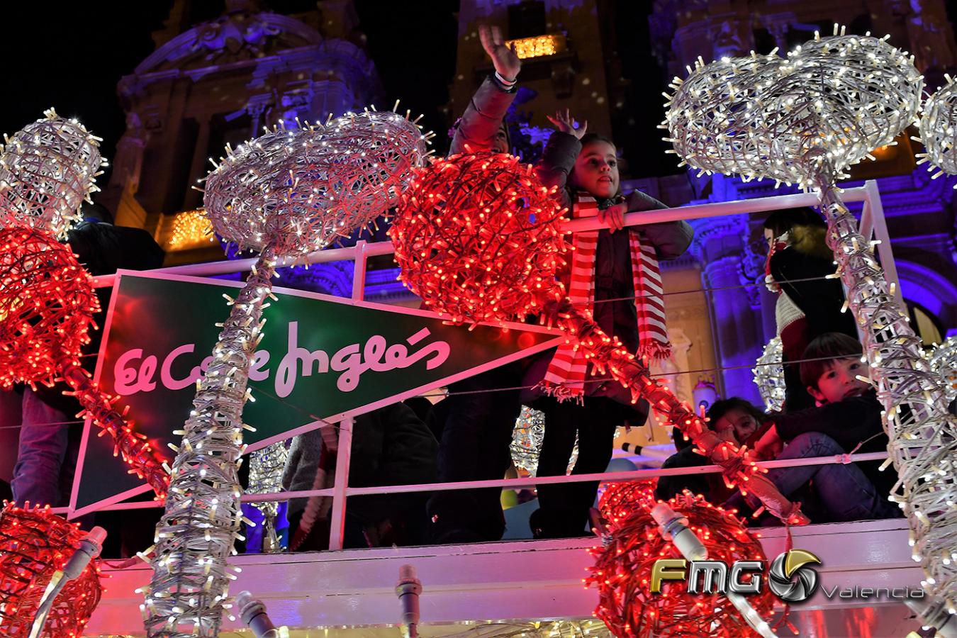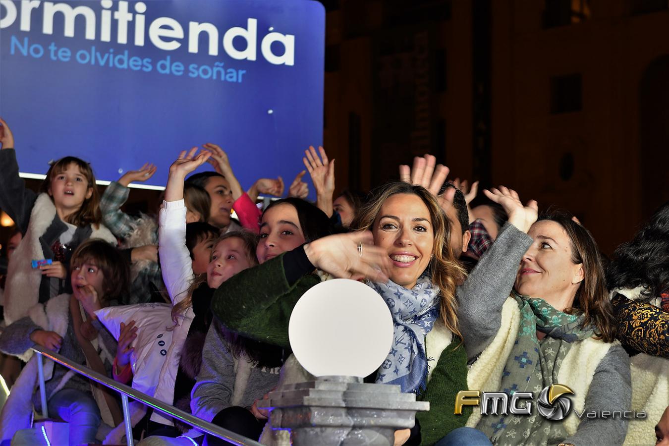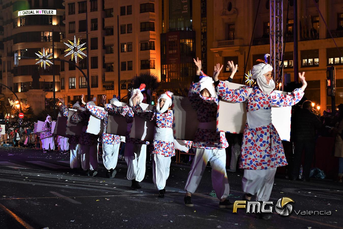 Fotos de la CABALGATA DE REYES VALENCIA 2019, sábado 5 de enero de 2019, a su llegada a la Plaza del Ayuntamiento. Con un gran desfile con grupos de animación, música y comparsas, se preparó una gran fiesta para dar la bienvenida a Melchor, Gaspar y Baltasar, con un final piromusical.
