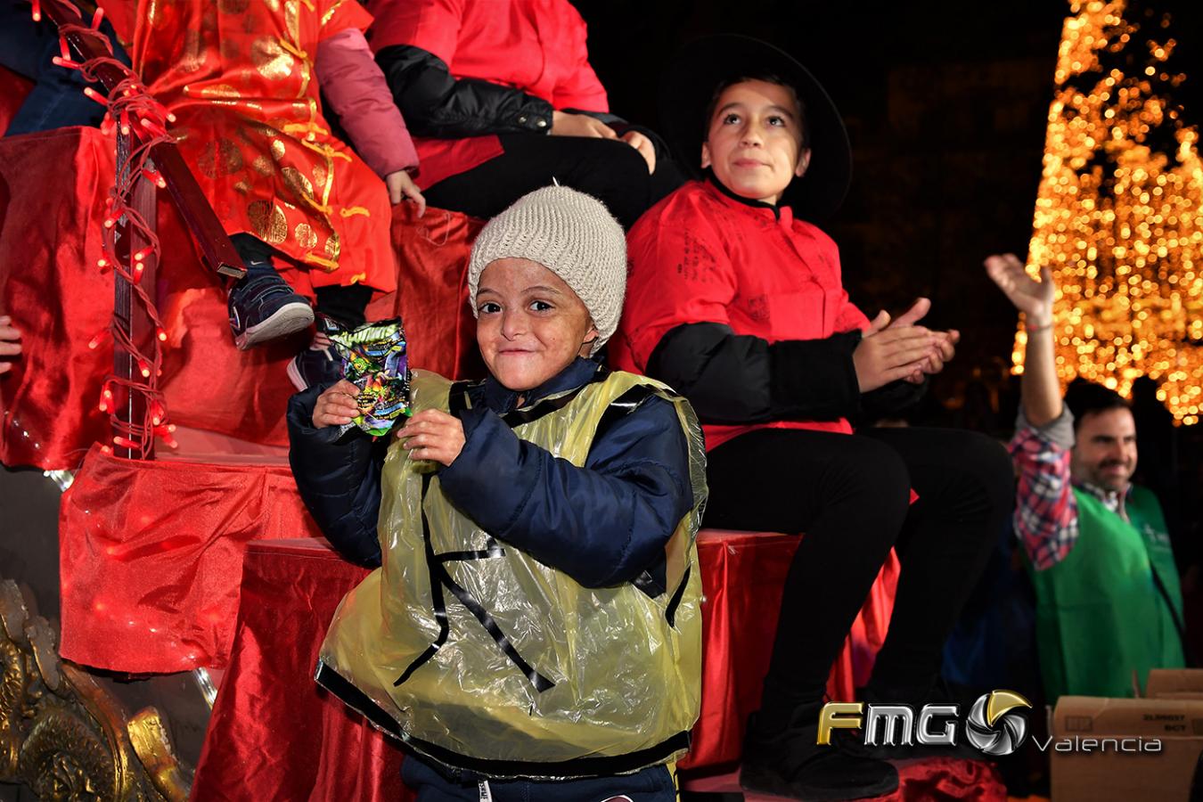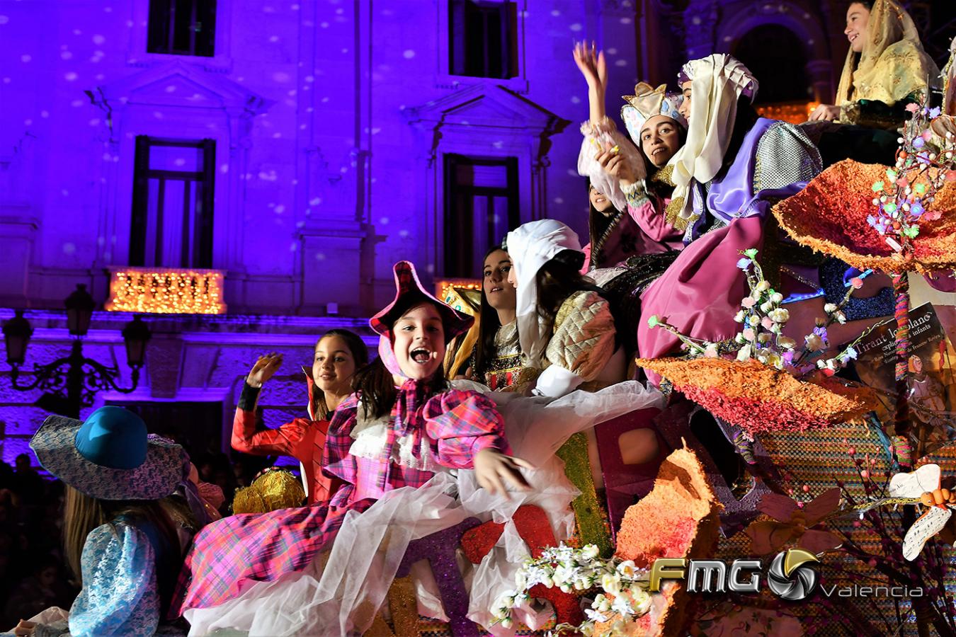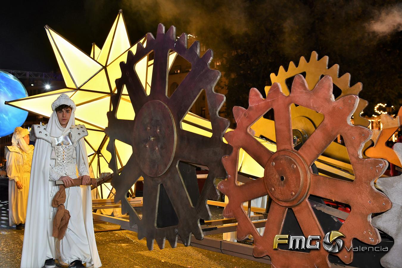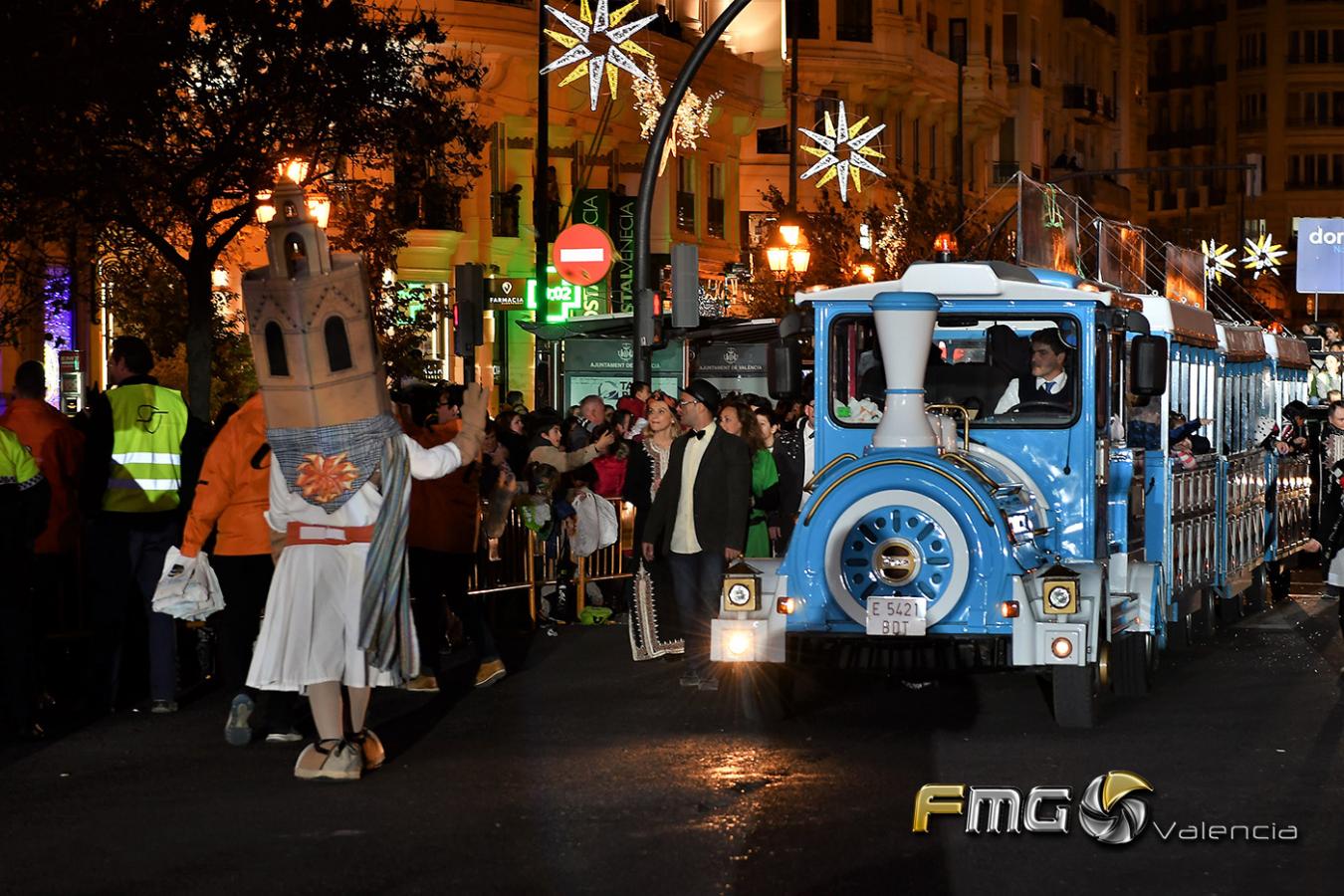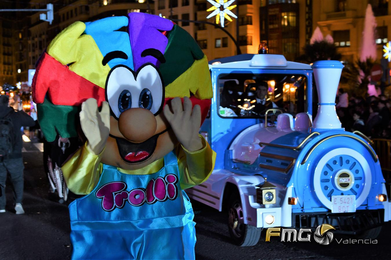 Fotos de la CABALGATA DE REYES VALENCIA 2019, sábado 5 de enero de 2019, a su llegada a la Plaza del Ayuntamiento. Con un gran desfile con grupos de animación, música y comparsas, se preparó una gran fiesta para dar la bienvenida a Melchor, Gaspar y Baltasar, con un final piromusical.