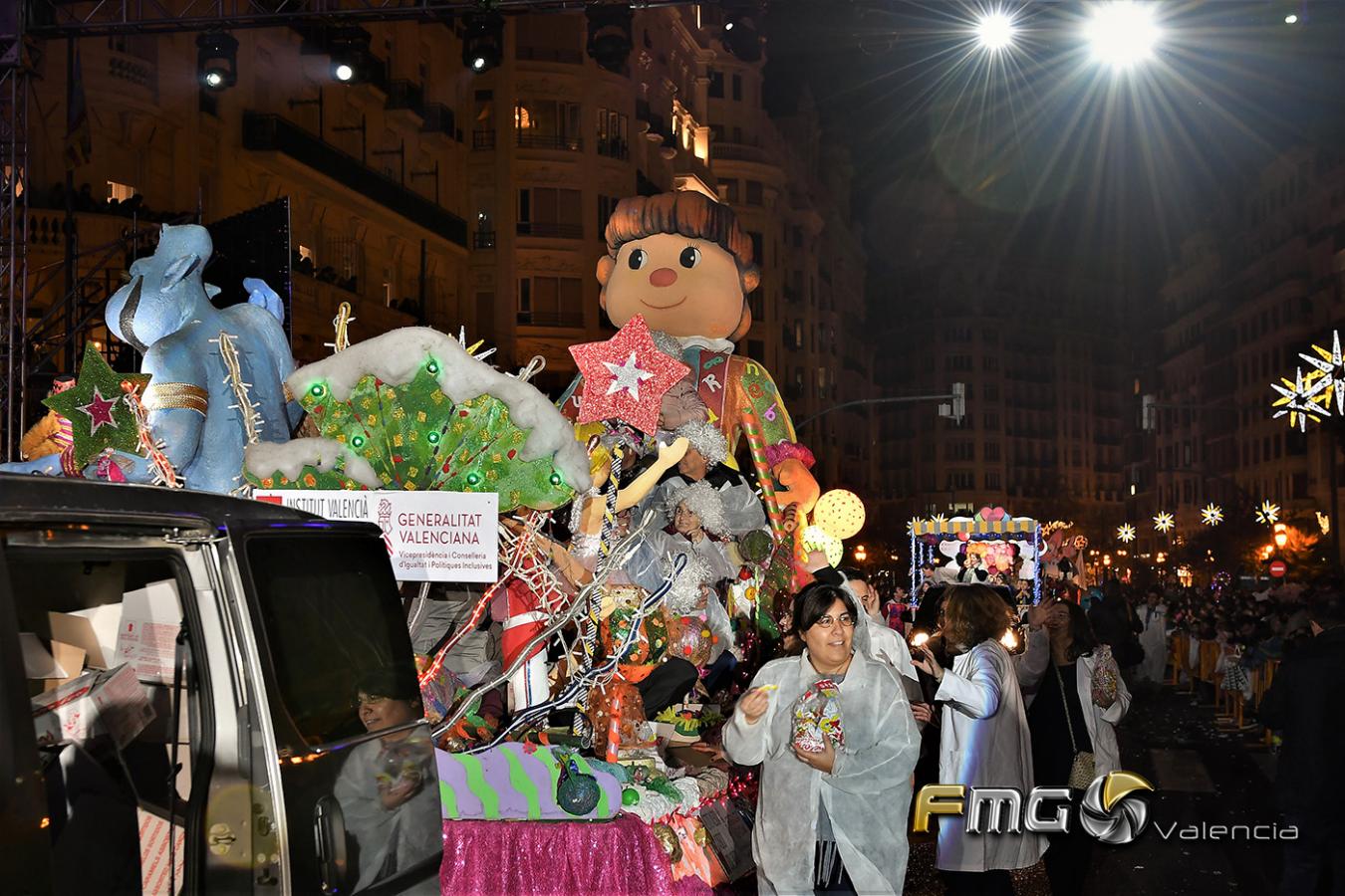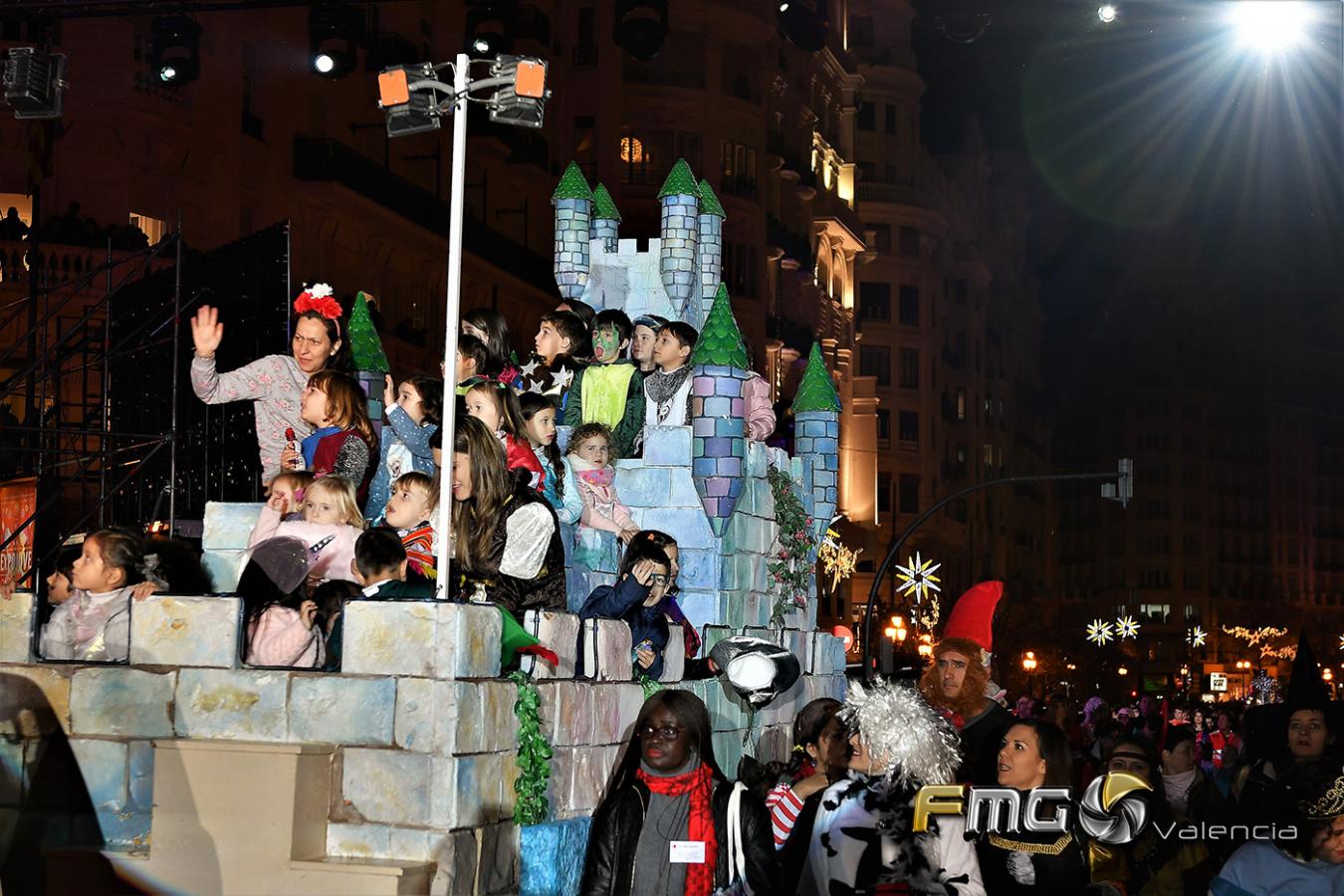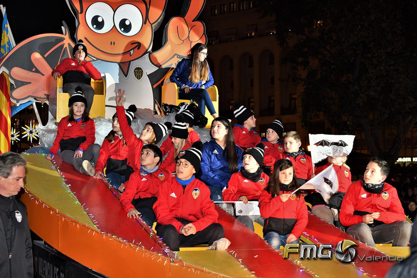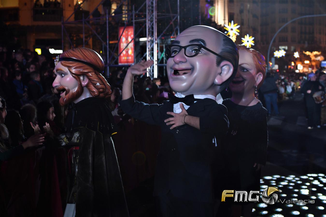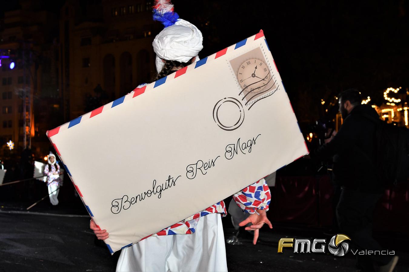 Fotos de la CABALGATA DE REYES VALENCIA 2019, sábado 5 de enero de 2019, a su llegada a la Plaza del Ayuntamiento. Con un gran desfile con grupos de animación, música y comparsas, se preparó una gran fiesta para dar la bienvenida a Melchor, Gaspar y Baltasar, con un final piromusical.