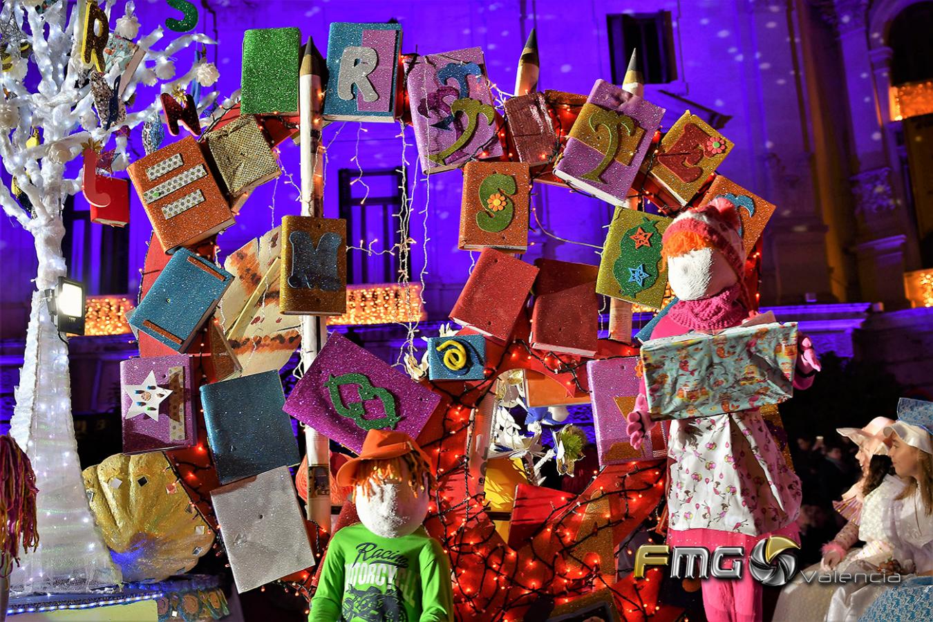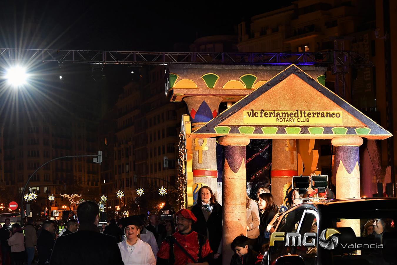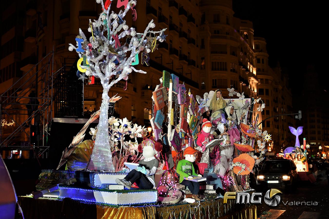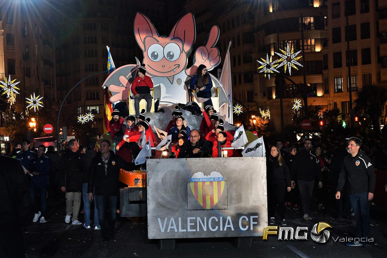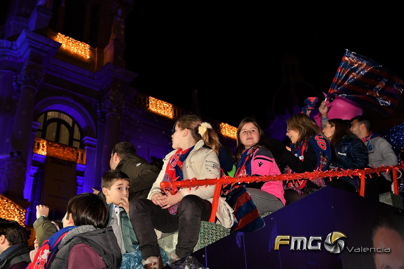 Fotos de la CABALGATA DE REYES VALENCIA 2019, sábado 5 de enero de 2019, a su llegada a la Plaza del Ayuntamiento. Con un gran desfile con grupos de animación, música y comparsas, se preparó una gran fiesta para dar la bienvenida a Melchor, Gaspar y Baltasar, con un final piromusical.