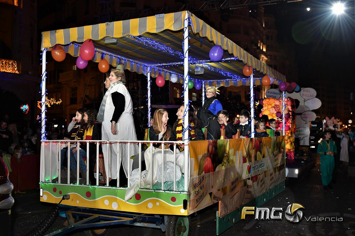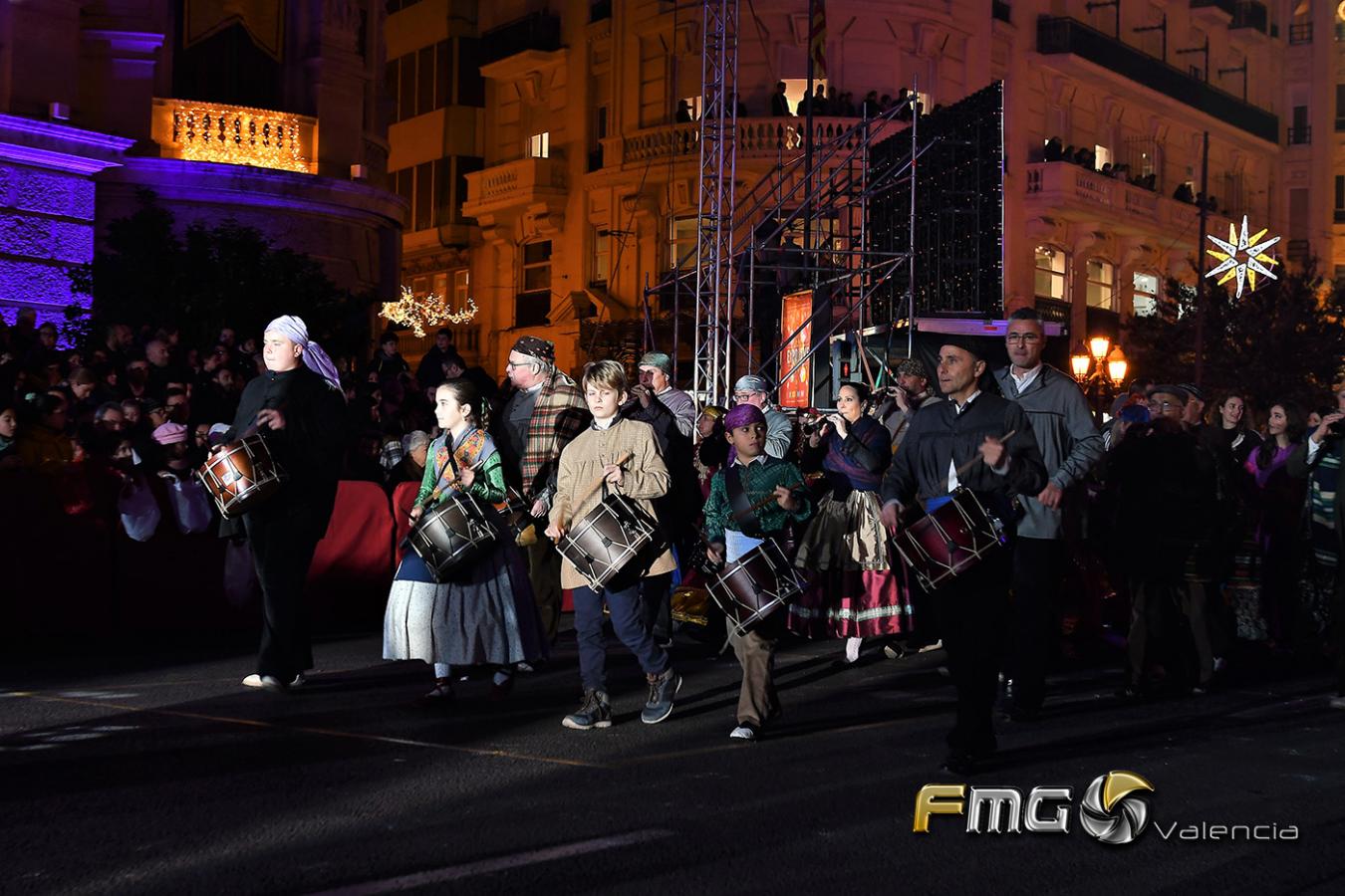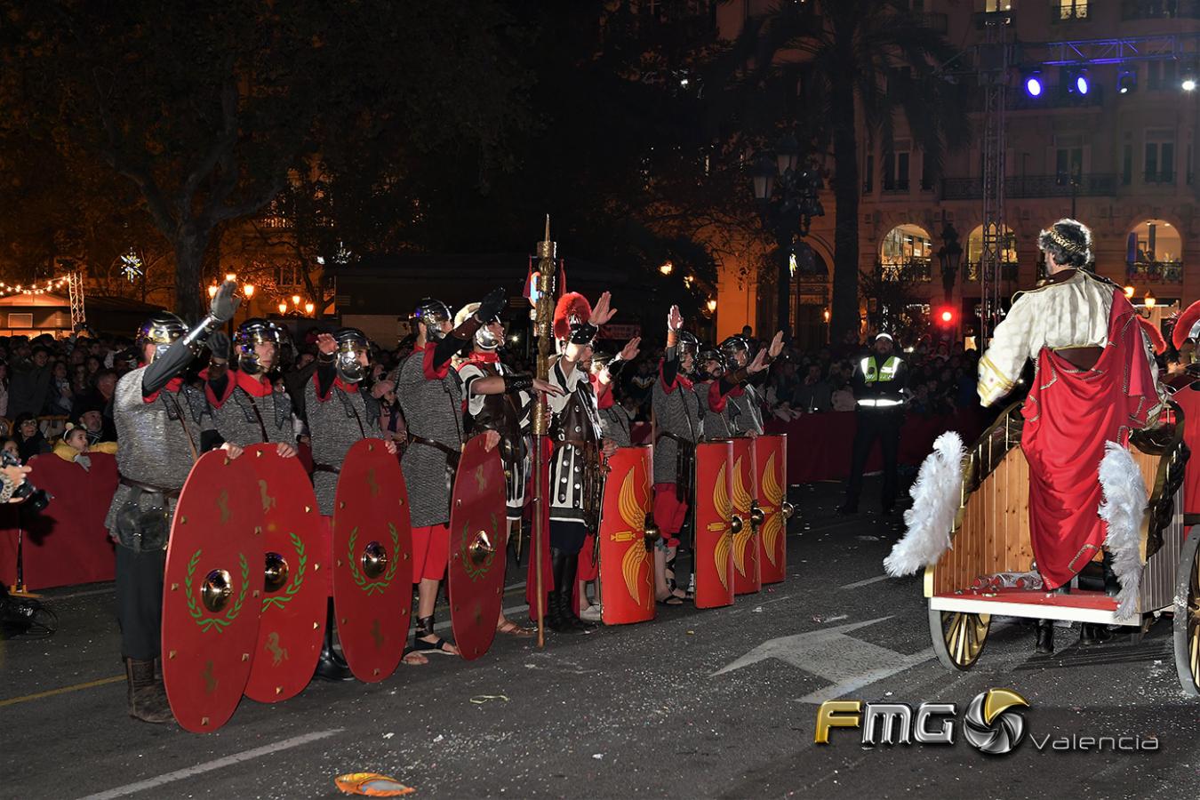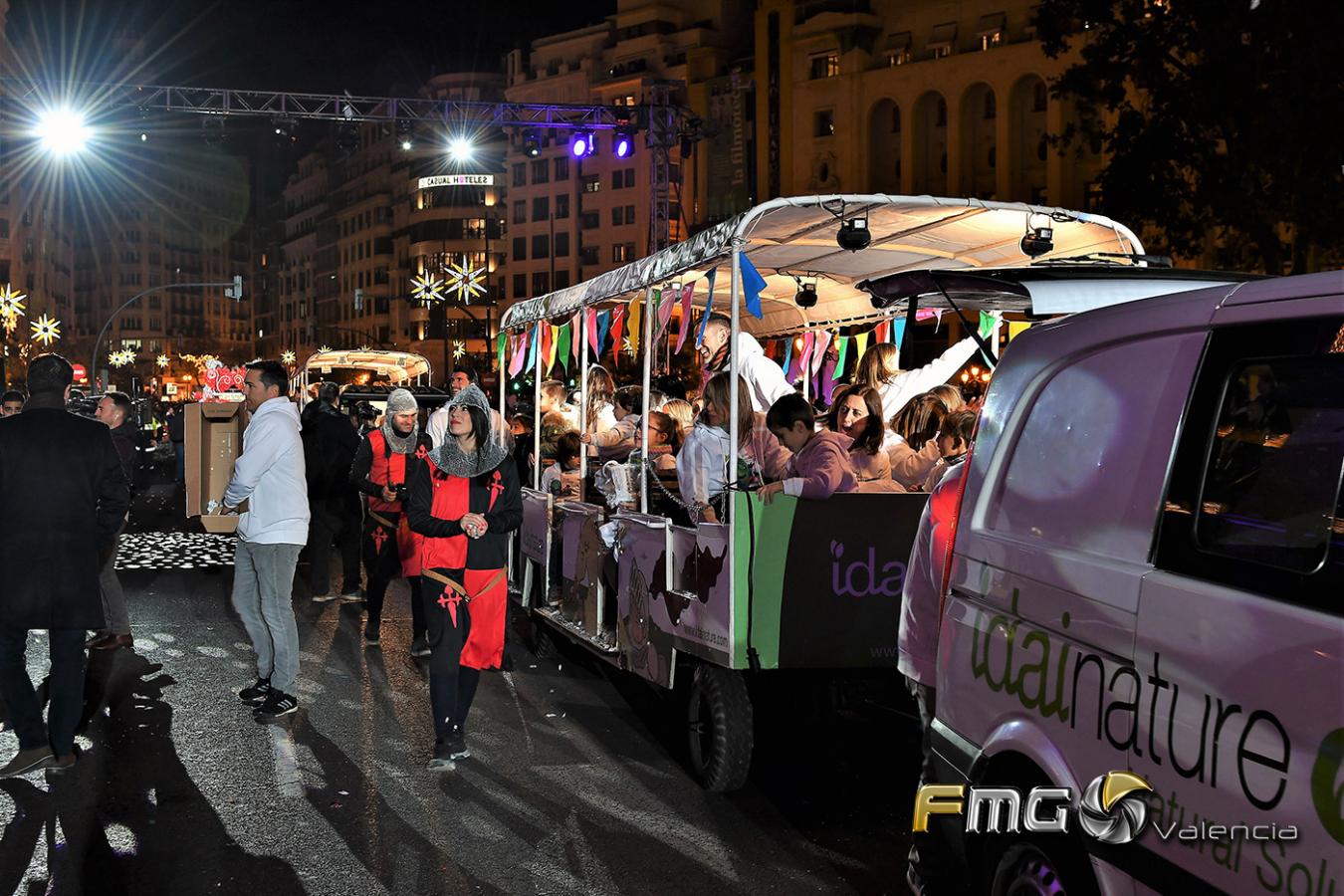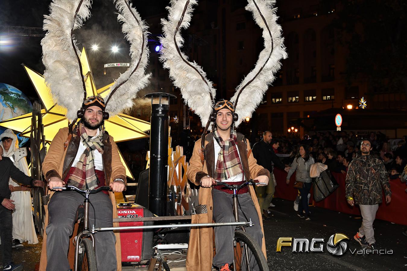 Fotos de la CABALGATA DE REYES VALENCIA 2019, sábado 5 de enero de 2019, a su llegada a la Plaza del Ayuntamiento. Con un gran desfile con grupos de animación, música y comparsas, se preparó una gran fiesta para dar la bienvenida a Melchor, Gaspar y Baltasar, con un final piromusical.