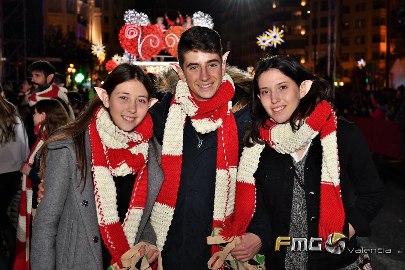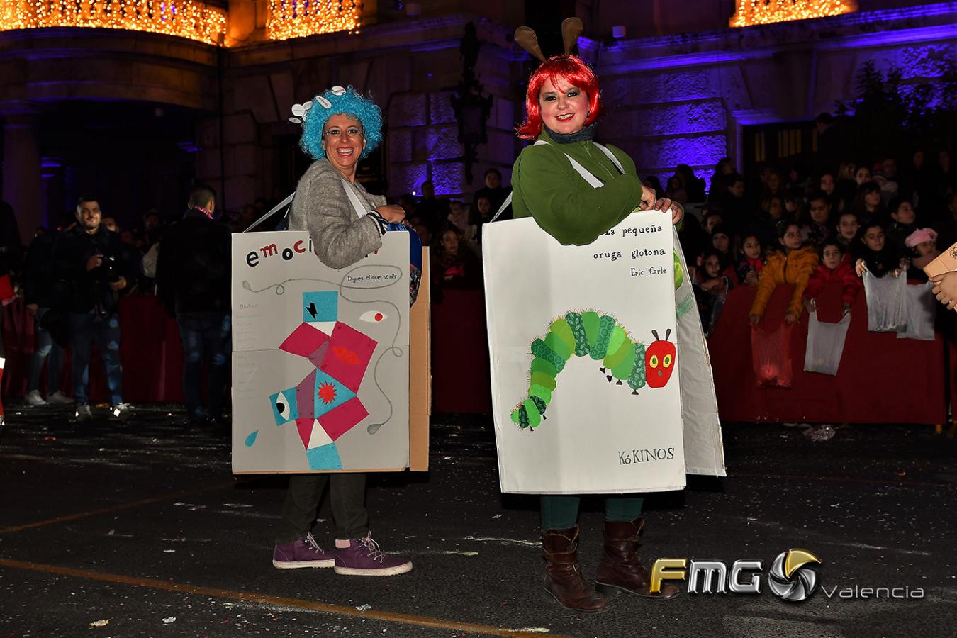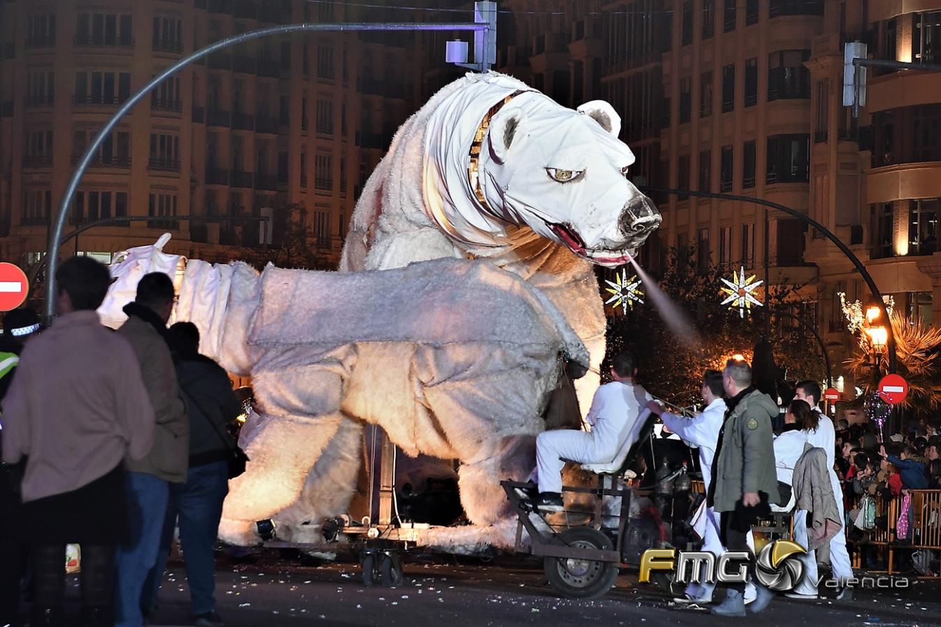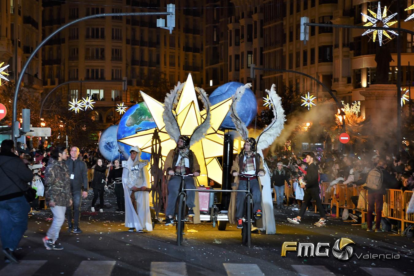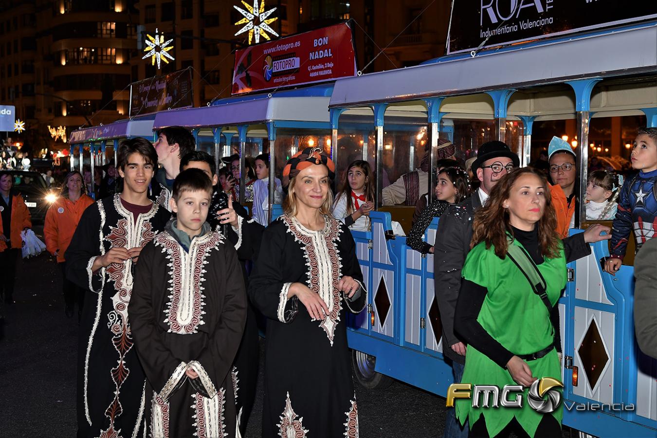 Fotos de la CABALGATA DE REYES VALENCIA 2019, sábado 5 de enero de 2019, a su llegada a la Plaza del Ayuntamiento. Con un gran desfile con grupos de animación, música y comparsas, se preparó una gran fiesta para dar la bienvenida a Melchor, Gaspar y Baltasar, con un final piromusical.