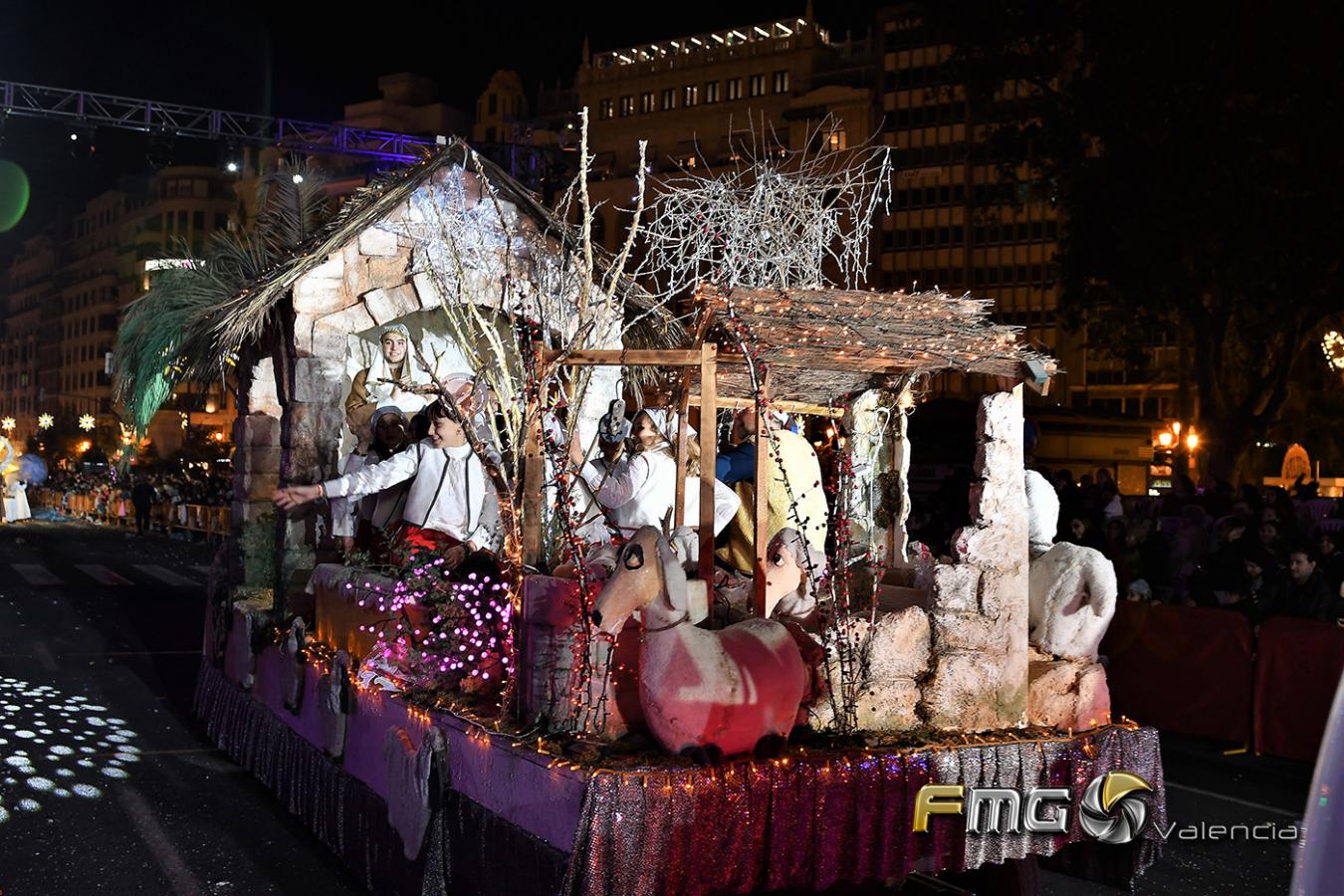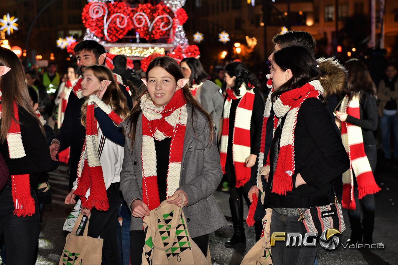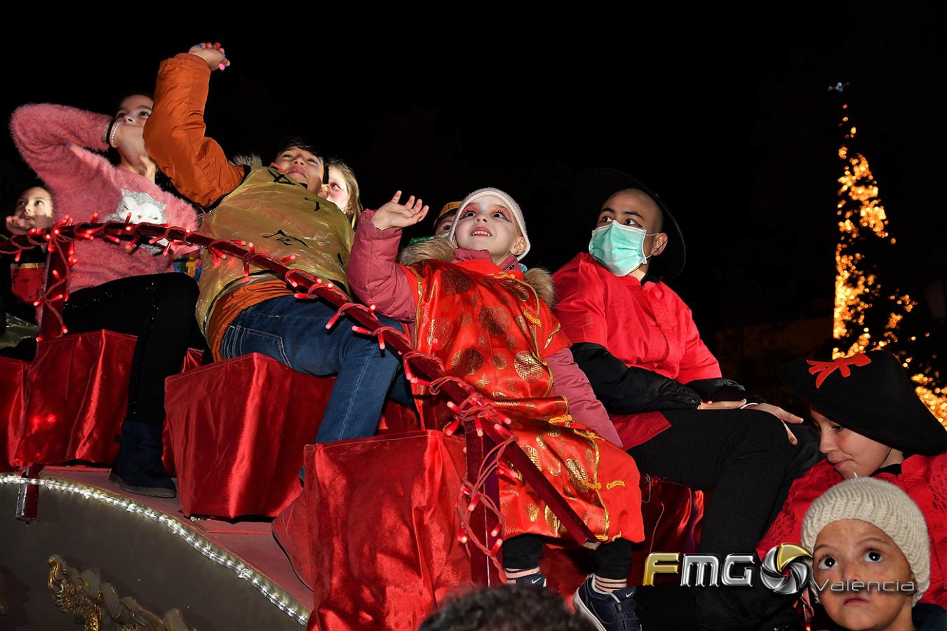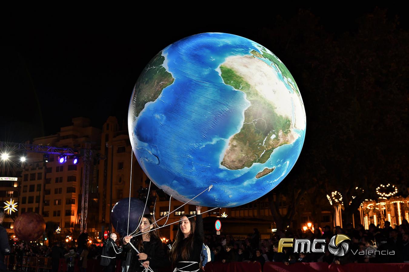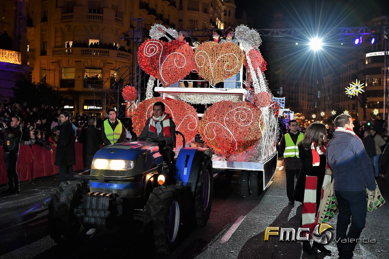 Fotos de la CABALGATA DE REYES VALENCIA 2019, sábado 5 de enero de 2019, a su llegada a la Plaza del Ayuntamiento. Con un gran desfile con grupos de animación, música y comparsas, se preparó una gran fiesta para dar la bienvenida a Melchor, Gaspar y Baltasar, con un final piromusical.