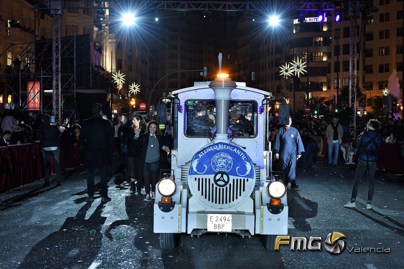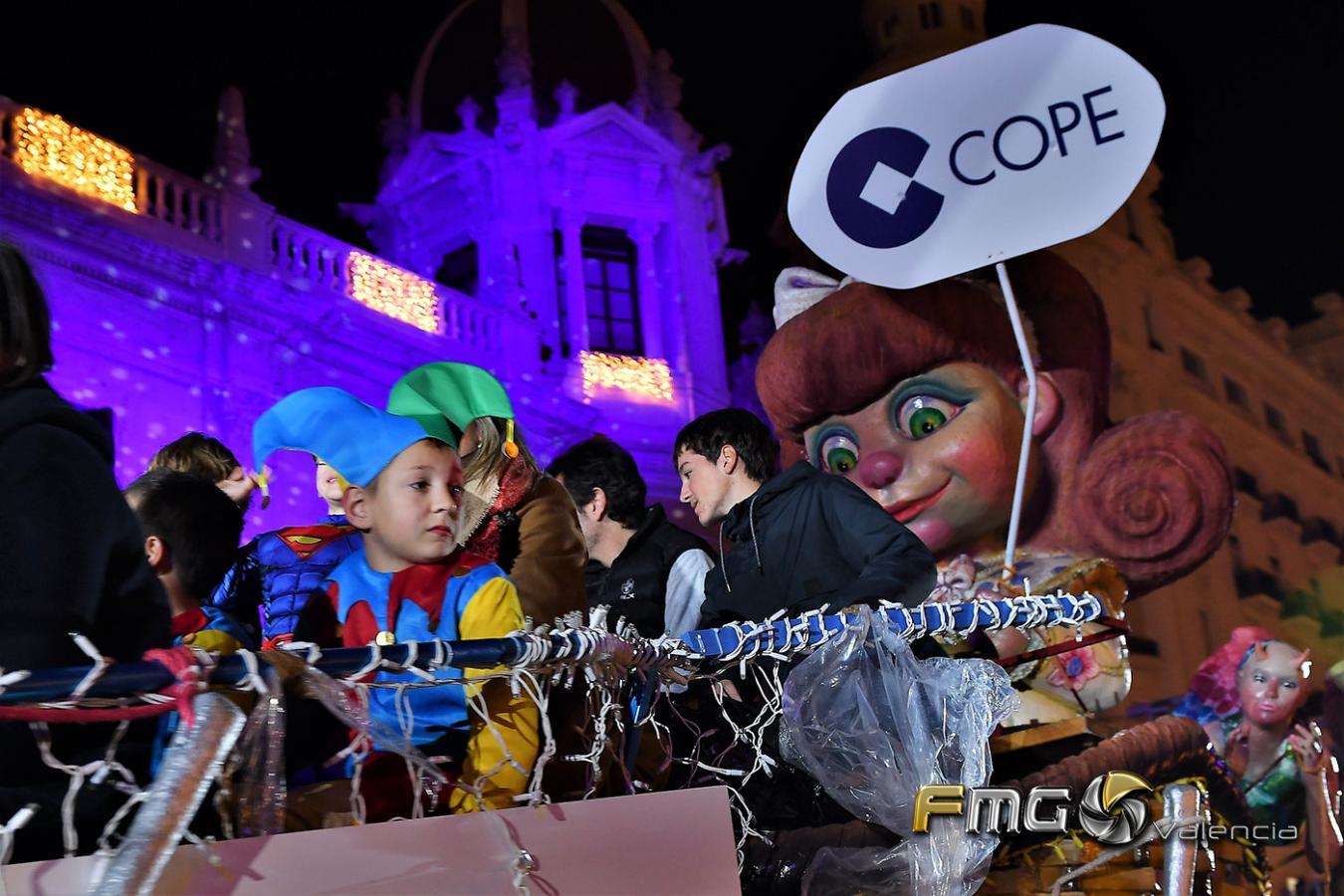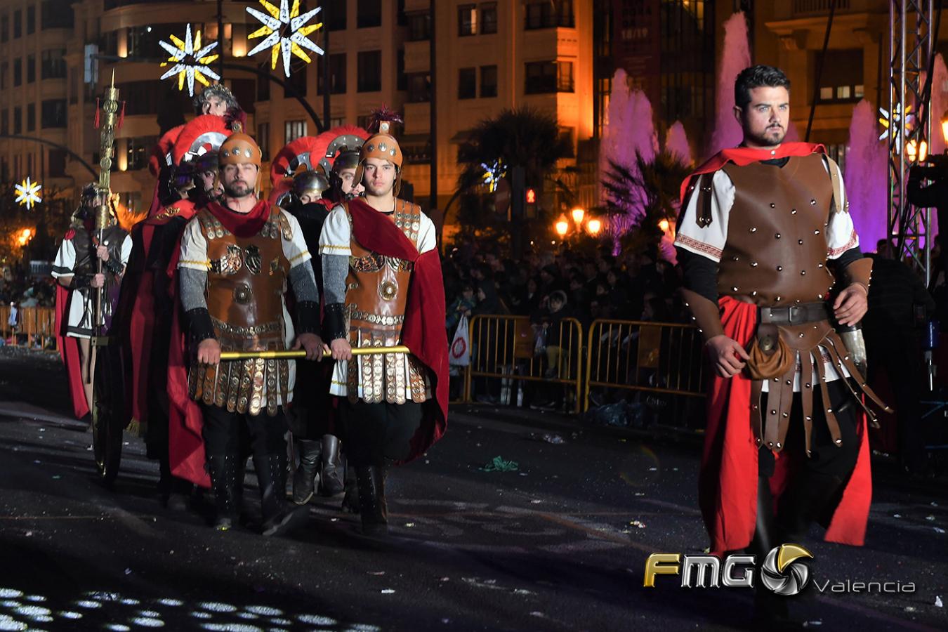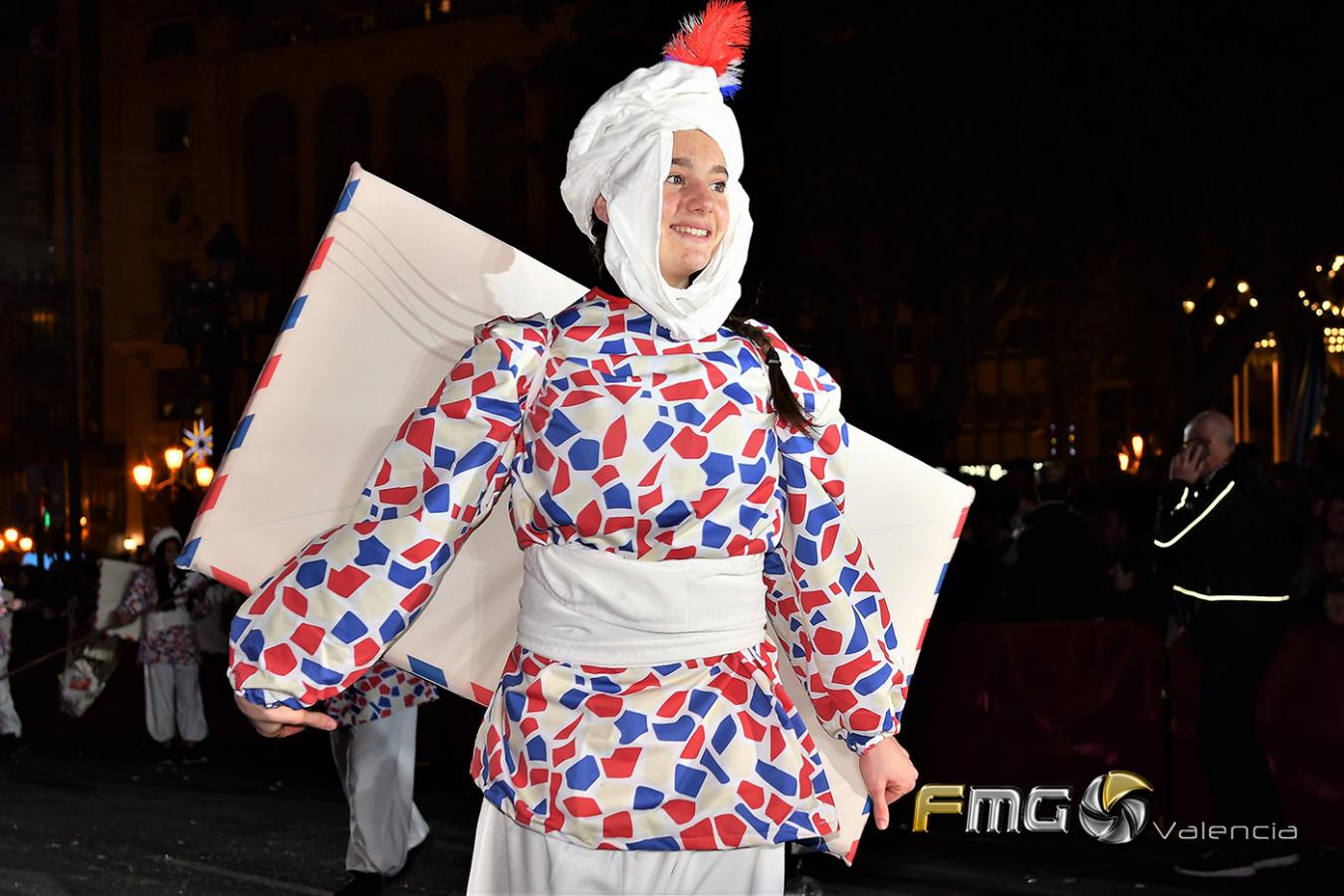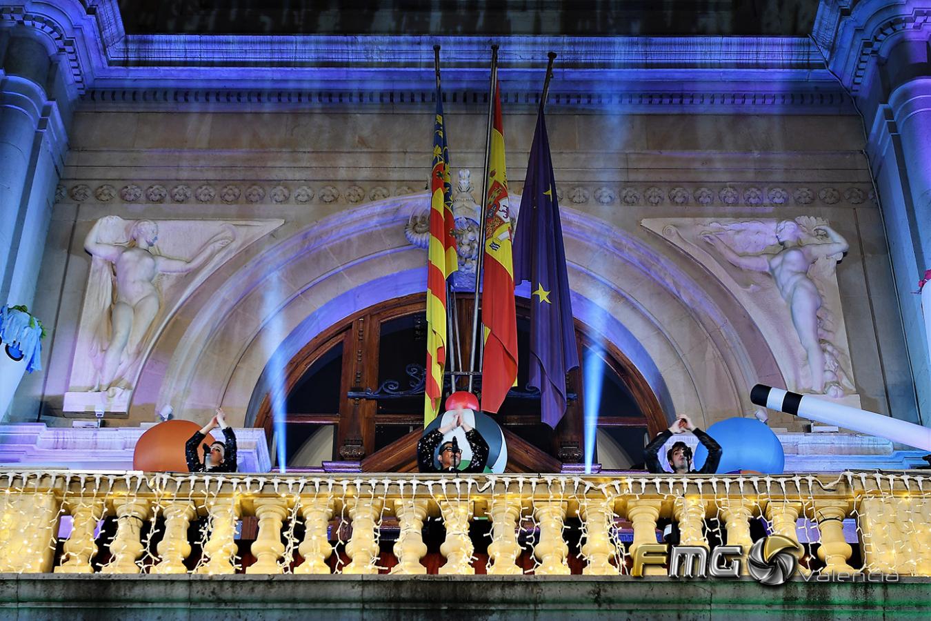 Fotos de la CABALGATA DE REYES VALENCIA 2019, sábado 5 de enero de 2019, a su llegada a la Plaza del Ayuntamiento. Con un gran desfile con grupos de animación, música y comparsas, se preparó una gran fiesta para dar la bienvenida a Melchor, Gaspar y Baltasar, con un final piromusical.