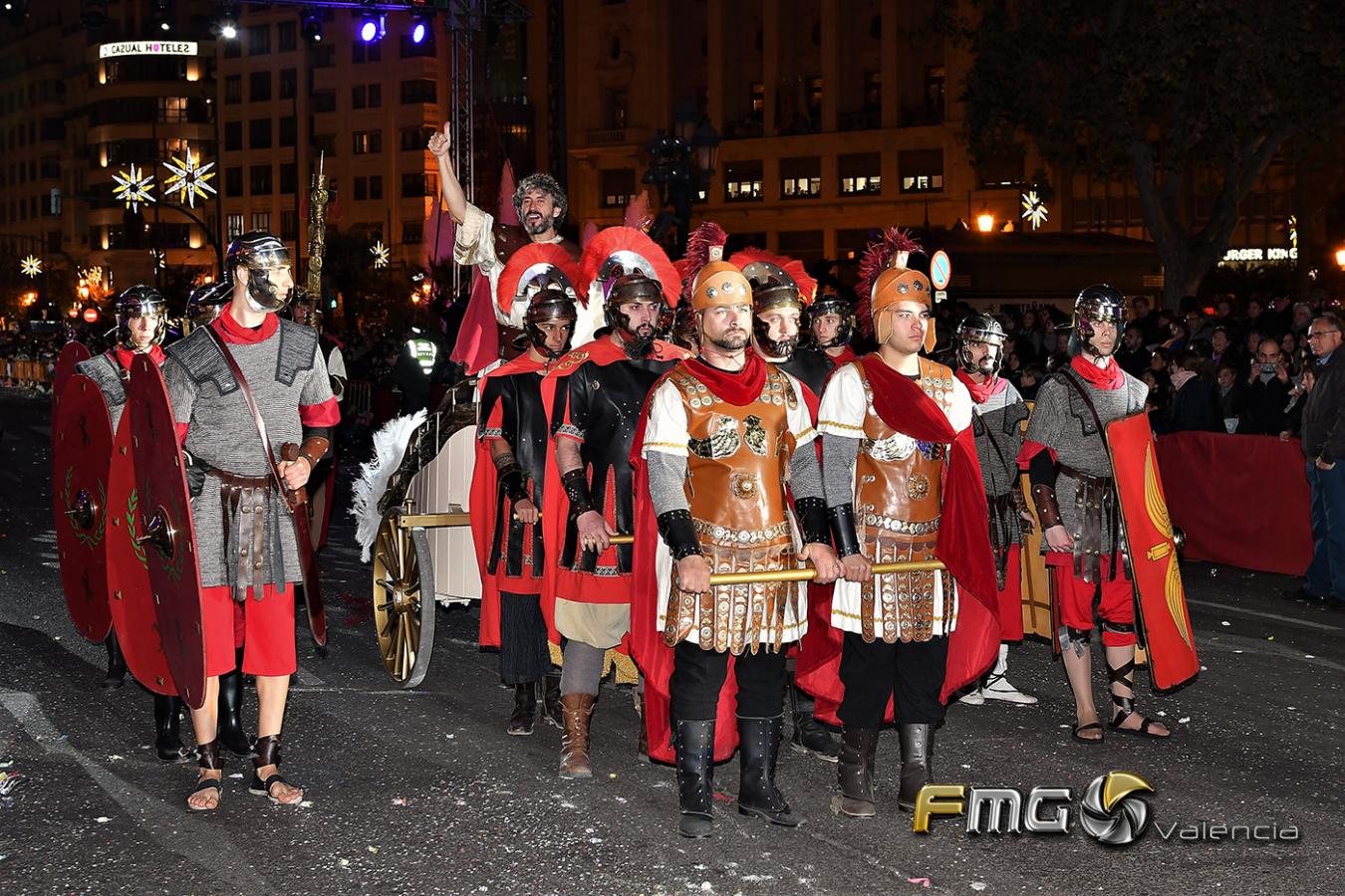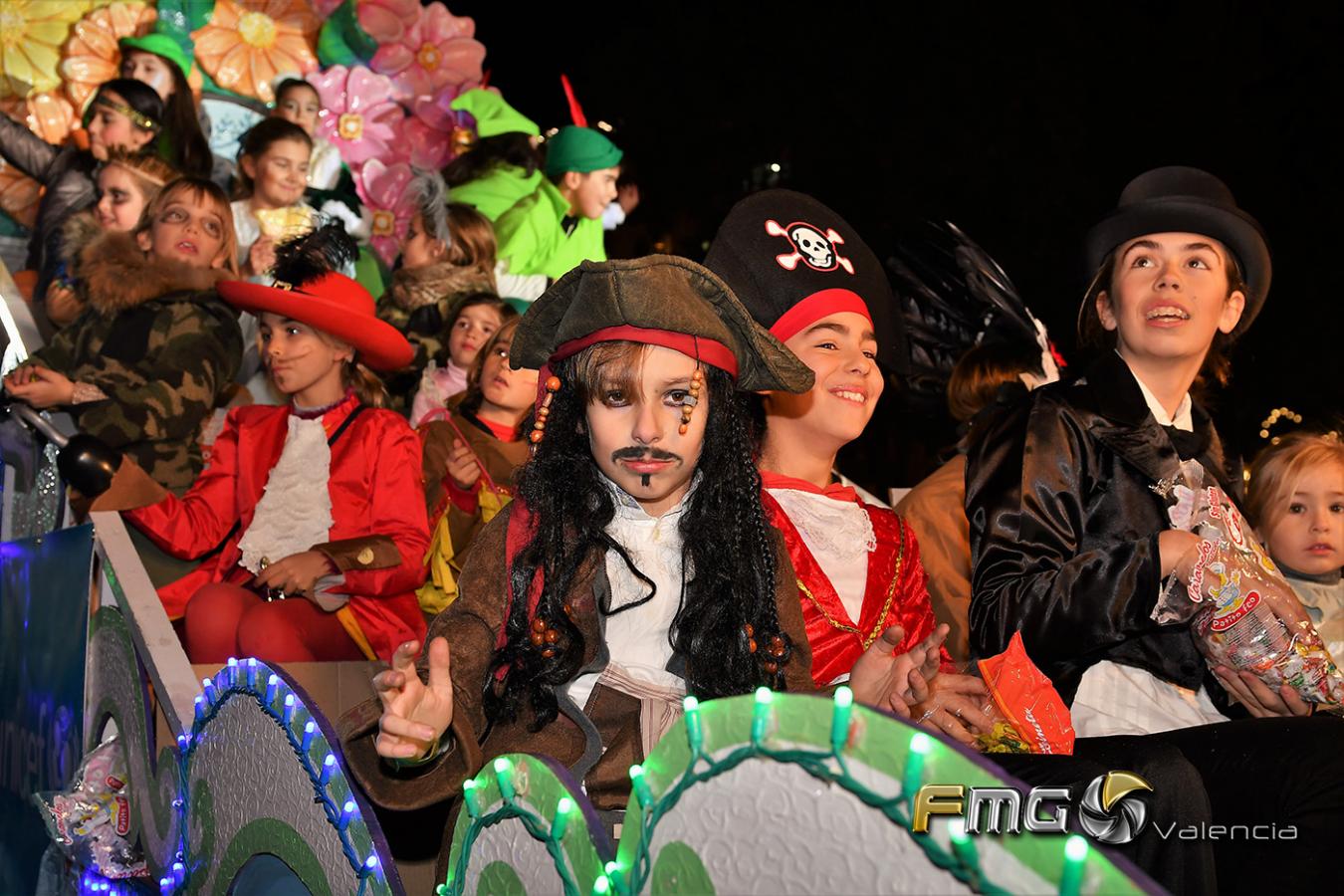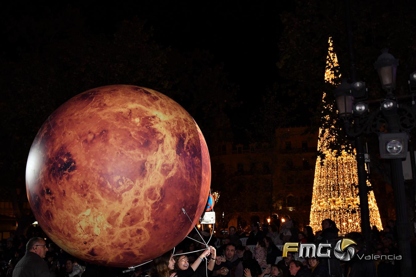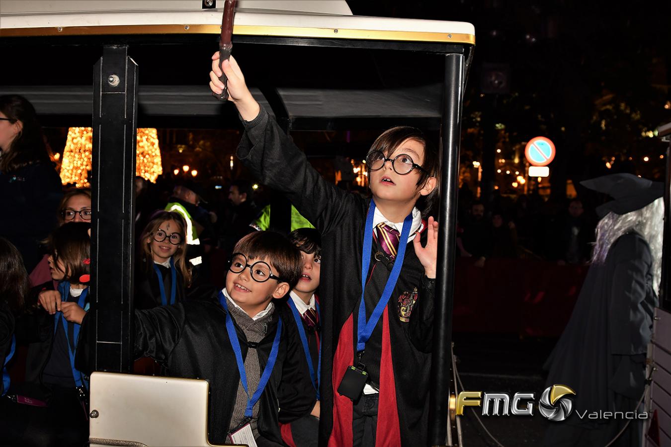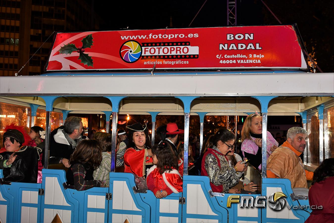 Fotos de la CABALGATA DE REYES VALENCIA 2019, sábado 5 de enero de 2019, a su llegada a la Plaza del Ayuntamiento. Con un gran desfile con grupos de animación, música y comparsas, se preparó una gran fiesta para dar la bienvenida a Melchor, Gaspar y Baltasar, con un final piromusical.