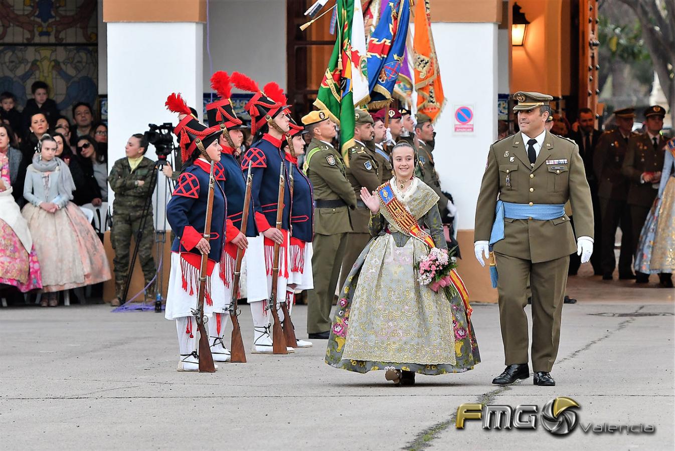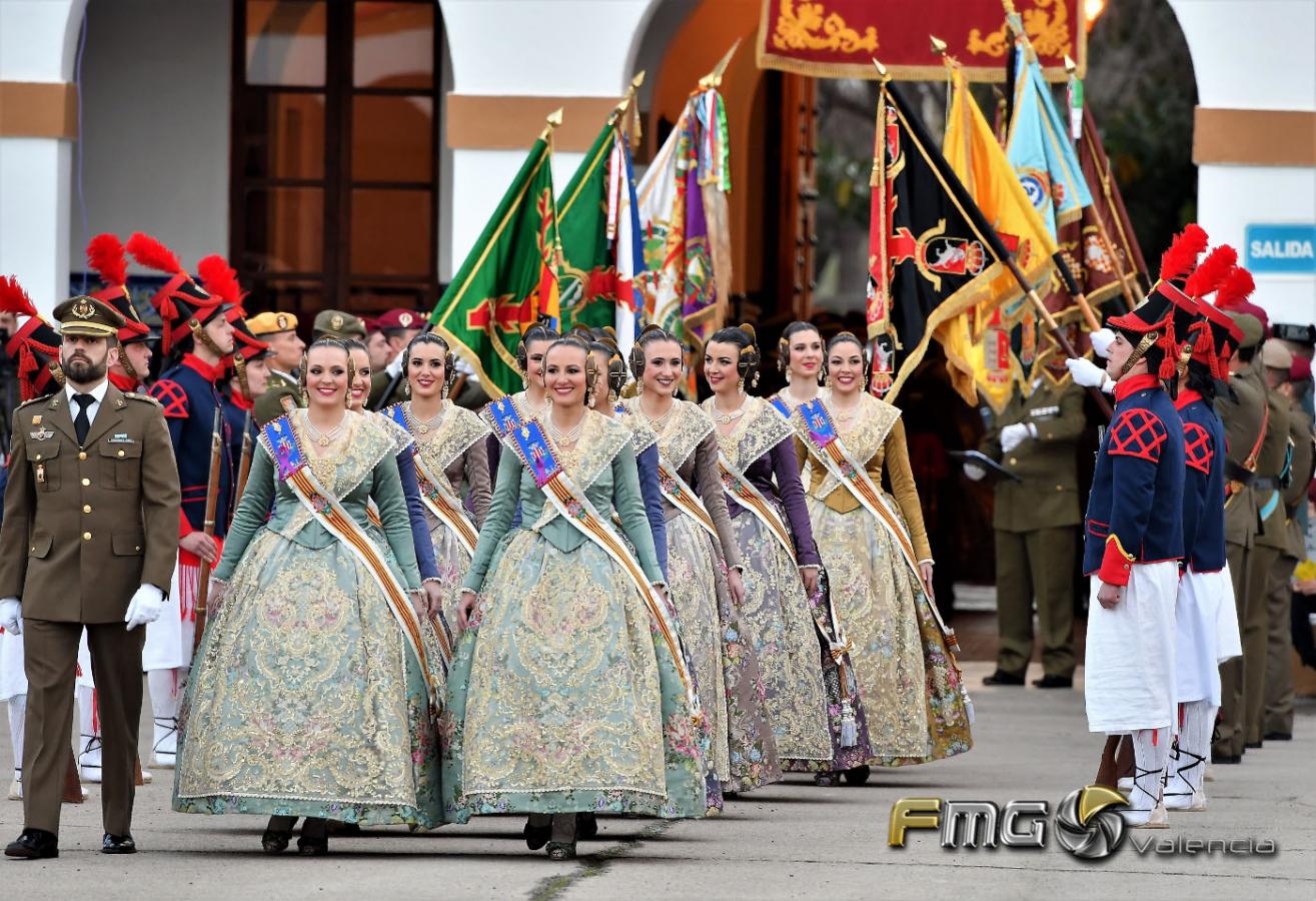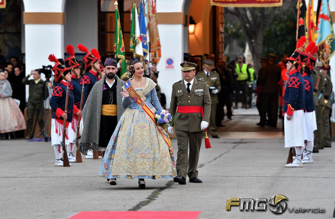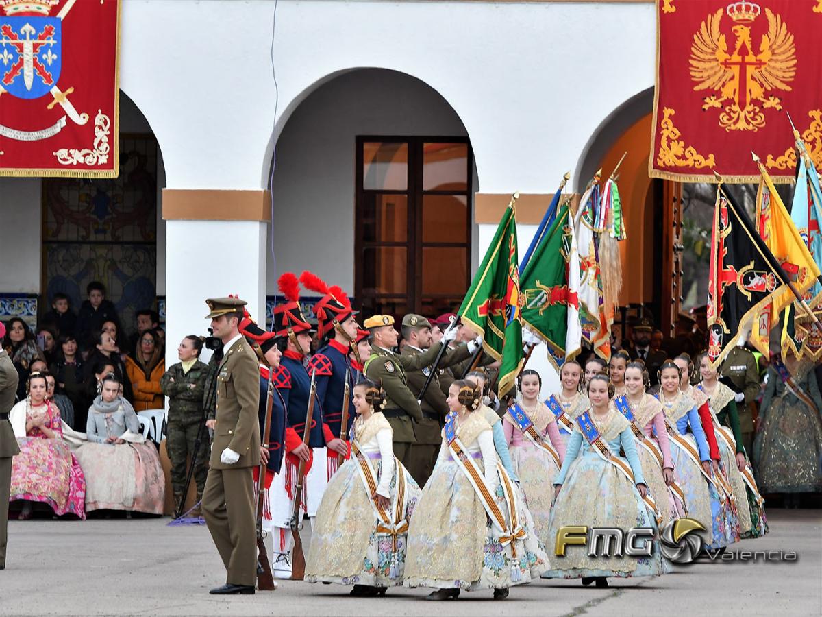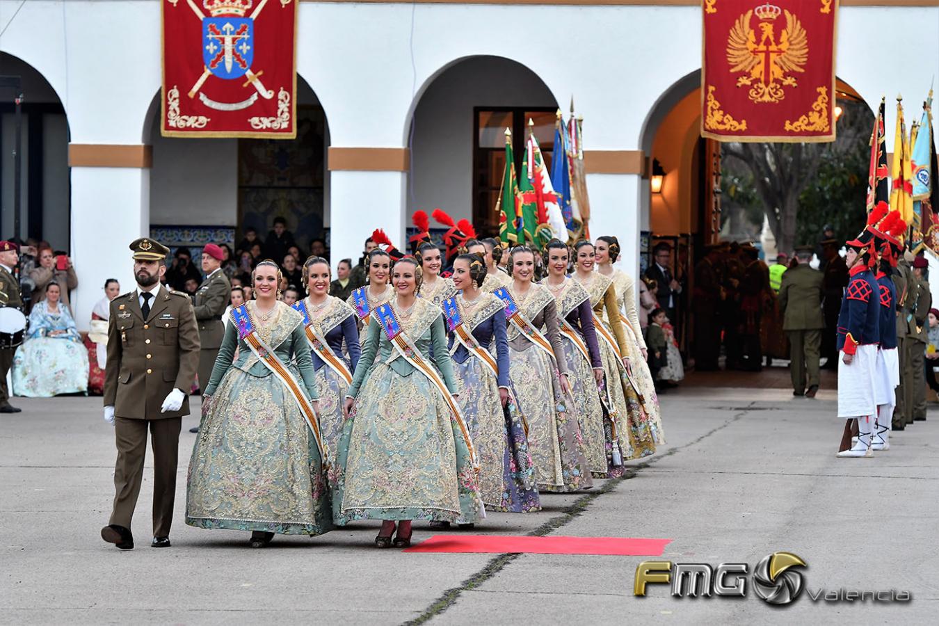 La Fallera Mayor y Fallera Mayor Infantil con sus respectivas Cortes de Honor, fueron recibidas en el patio de armas del acuartelamiento, donde formaron una representación de hombres y mujeres de diferentes unidades del Ejército de Tierra ubicadas en Valencia, además de personal de la Unidad Militar de Emergencias, 6ª Zona de la Guardia Civil, Comandancia de Marina y Ejército del Aire,