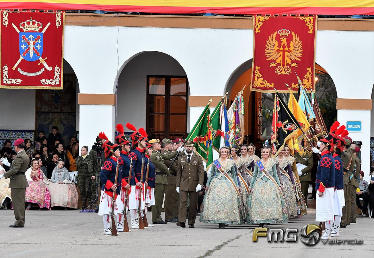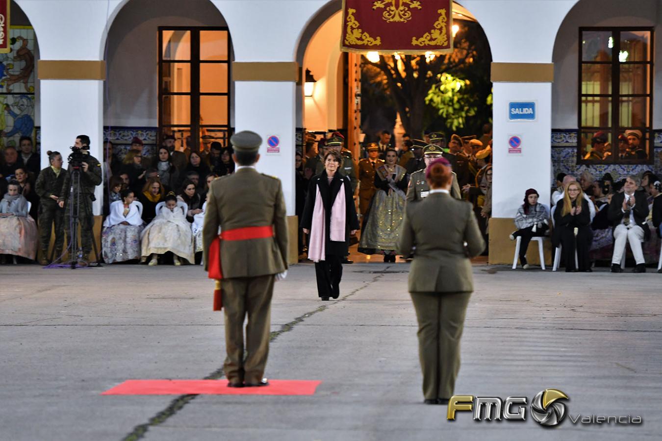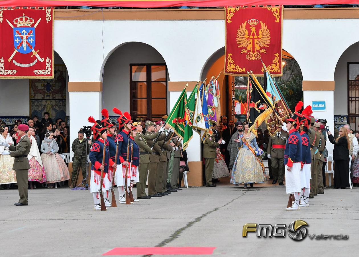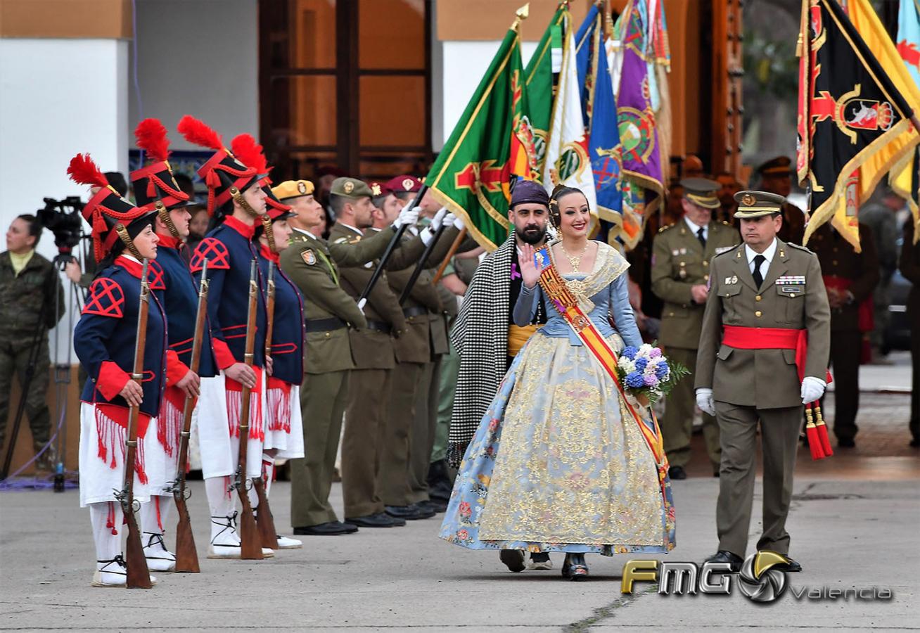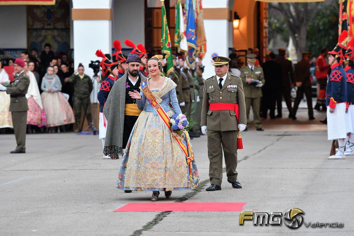La Fallera Mayor y Fallera Mayor Infantil con sus respectivas Cortes de Honor, fueron recibidas en el patio de armas del acuartelamiento, donde formaron una representación de hombres y mujeres de diferentes unidades del Ejército de Tierra ubicadas en Valencia, además de personal de la Unidad Militar de Emergencias, 6ª Zona de la Guardia Civil, Comandancia de Marina y Ejército del Aire,