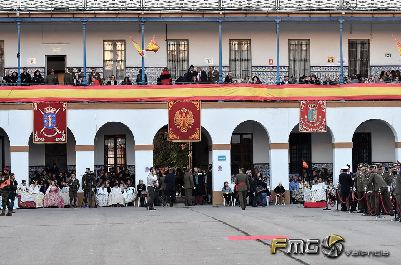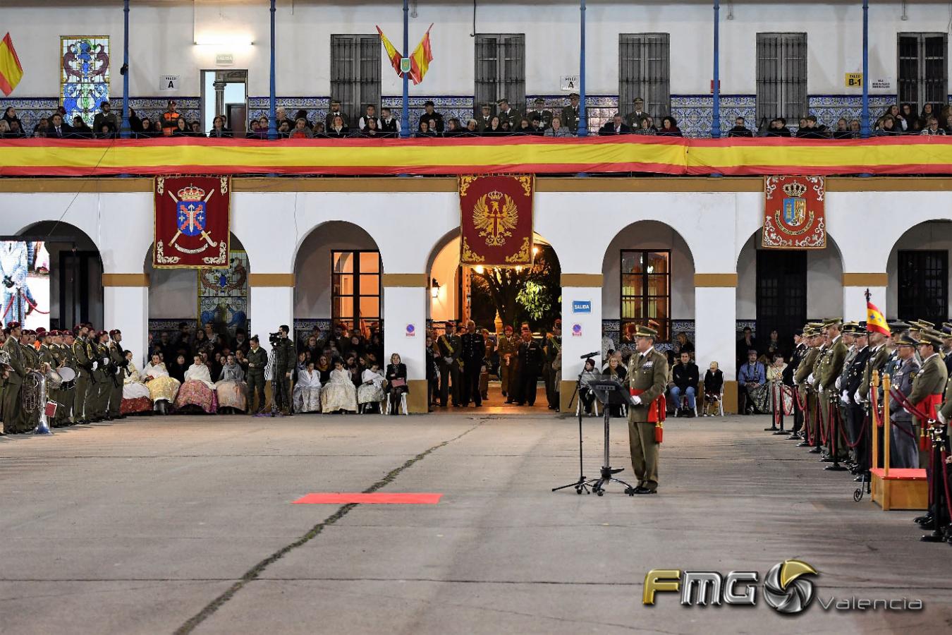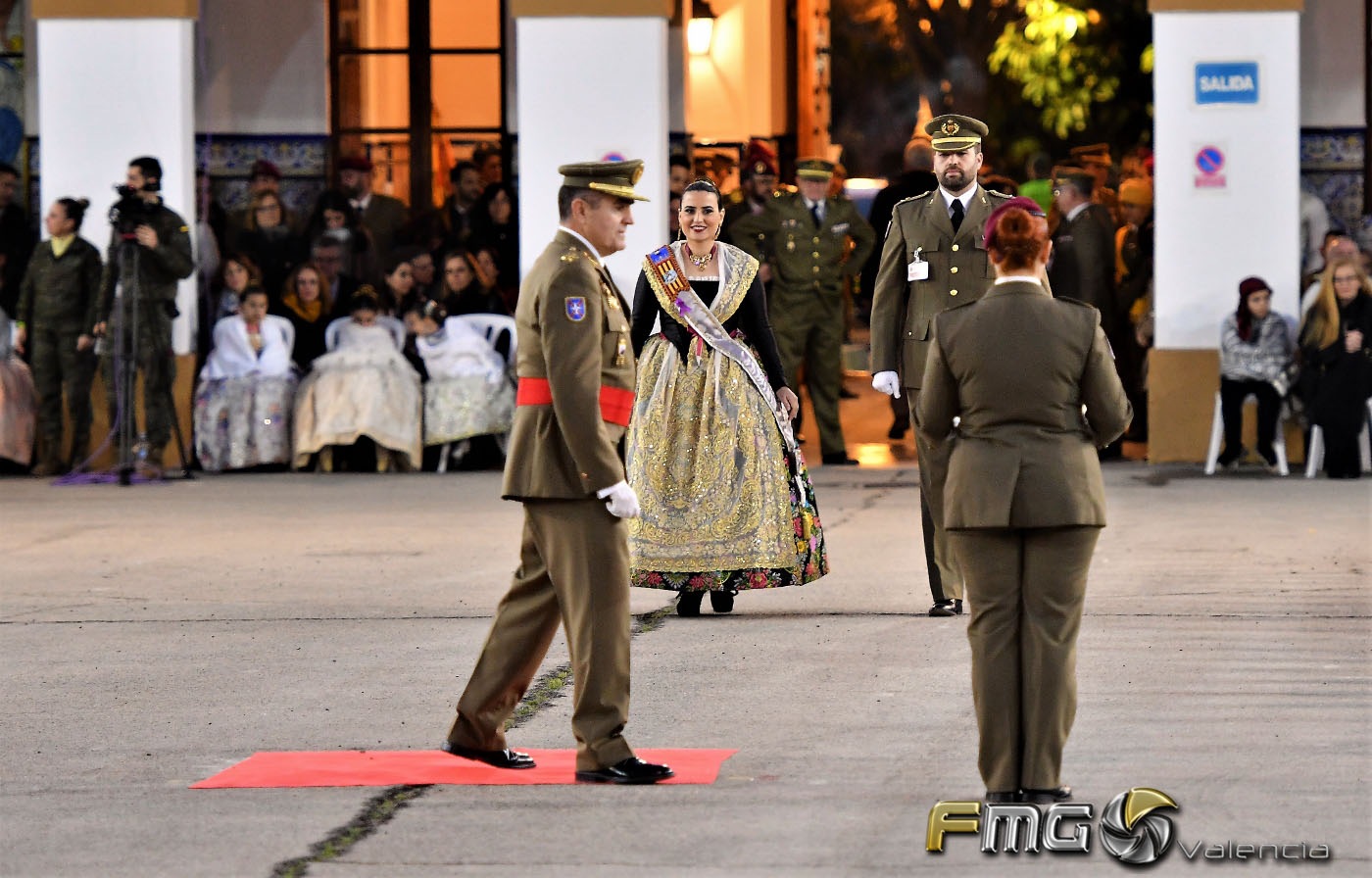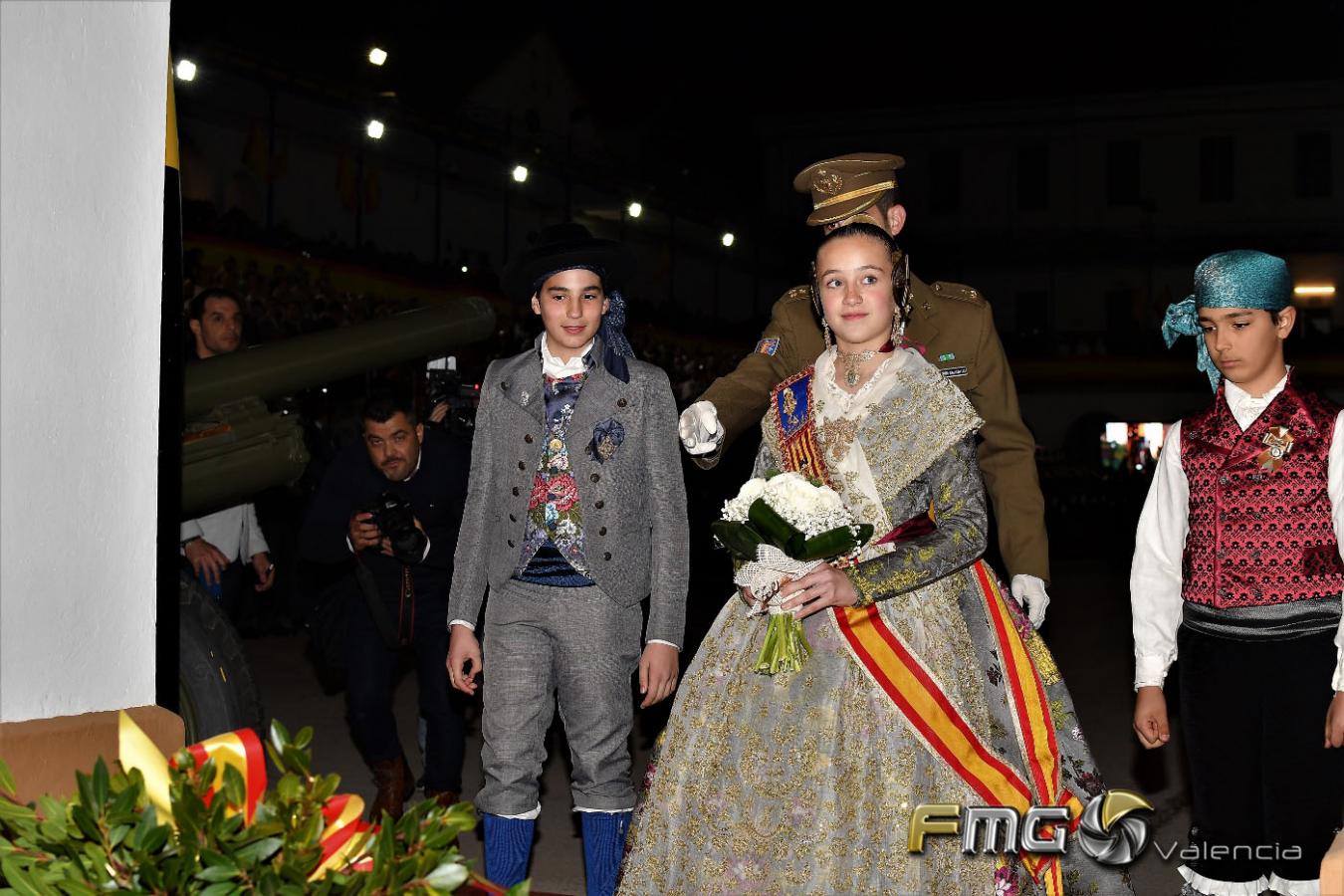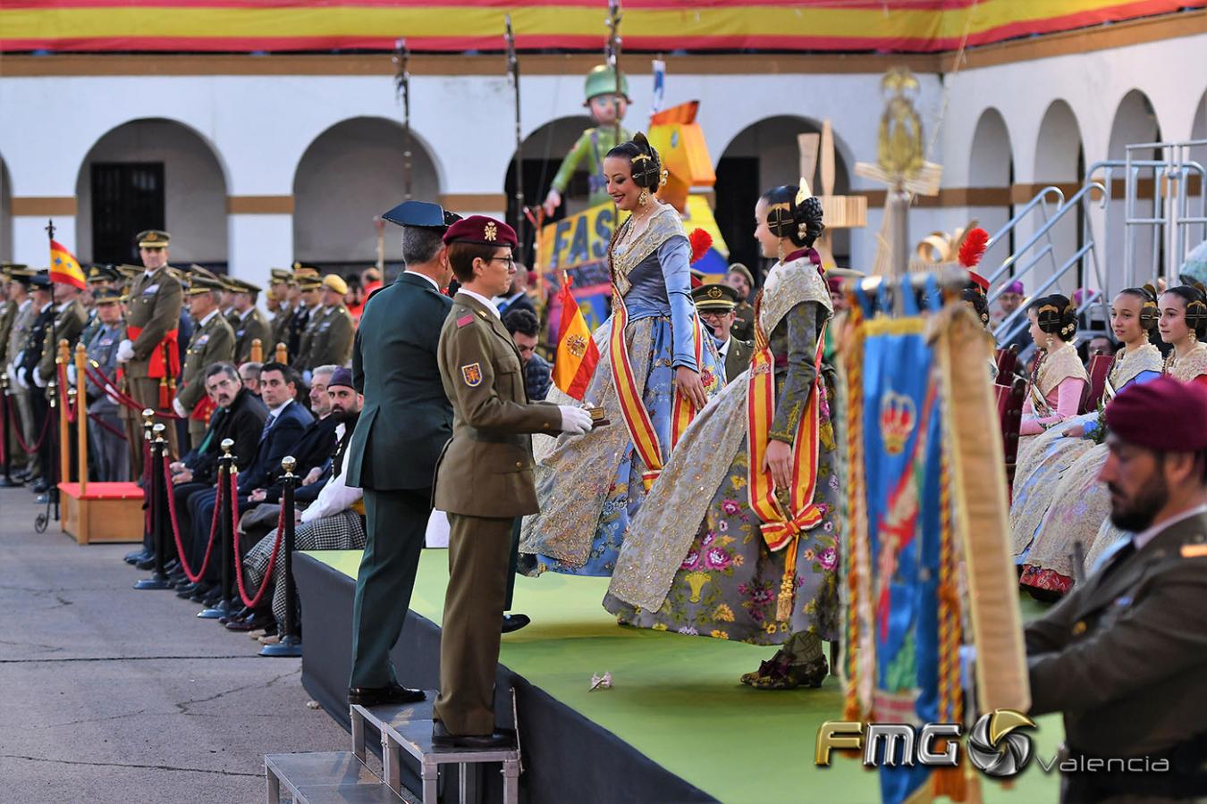 La Fallera Mayor y Fallera Mayor Infantil con sus respectivas Cortes de Honor, fueron recibidas en el patio de armas del acuartelamiento, donde formaron una representación de hombres y mujeres de diferentes unidades del Ejército de Tierra ubicadas en Valencia, además de personal de la Unidad Militar de Emergencias, 6ª Zona de la Guardia Civil, Comandancia de Marina y Ejército del Aire,