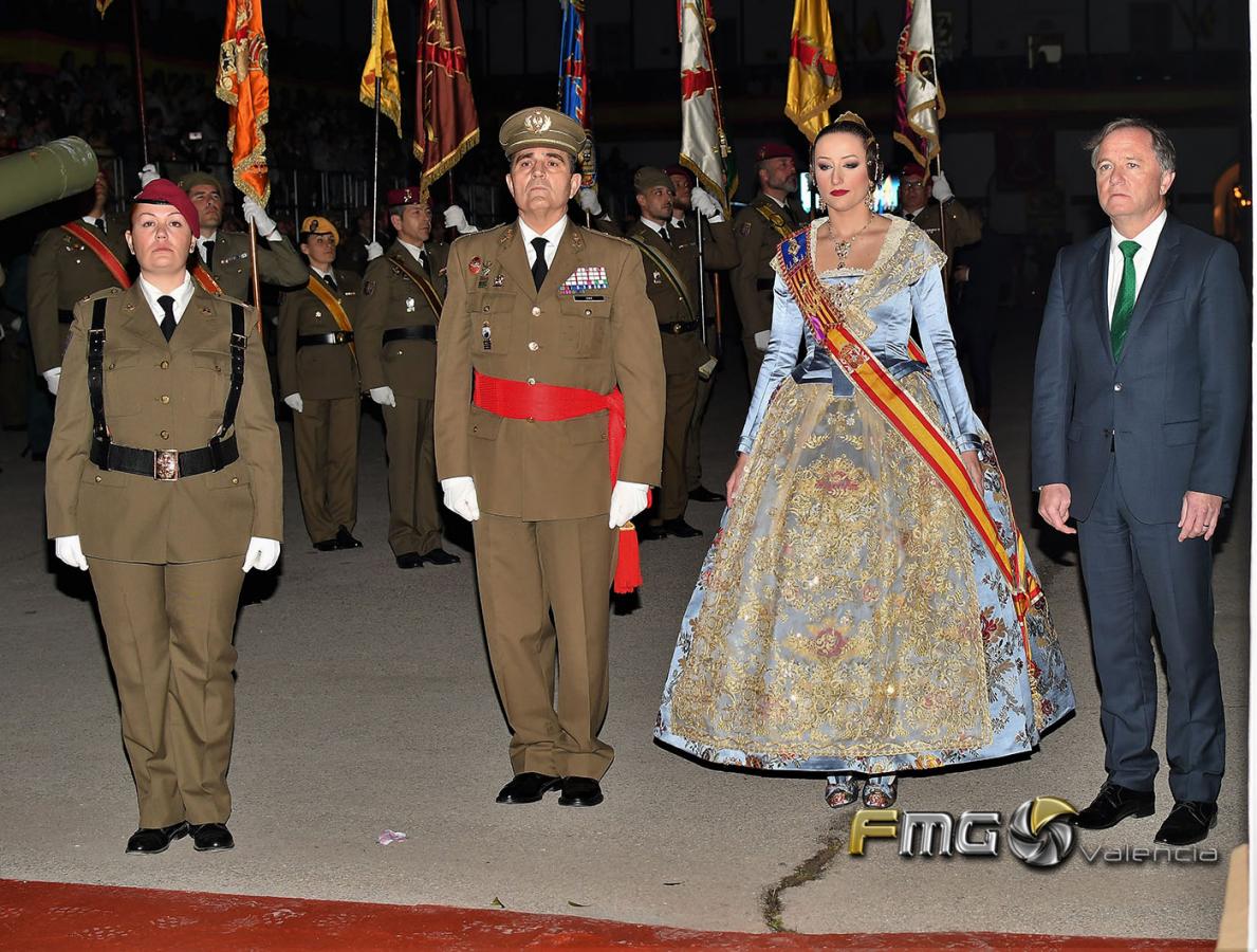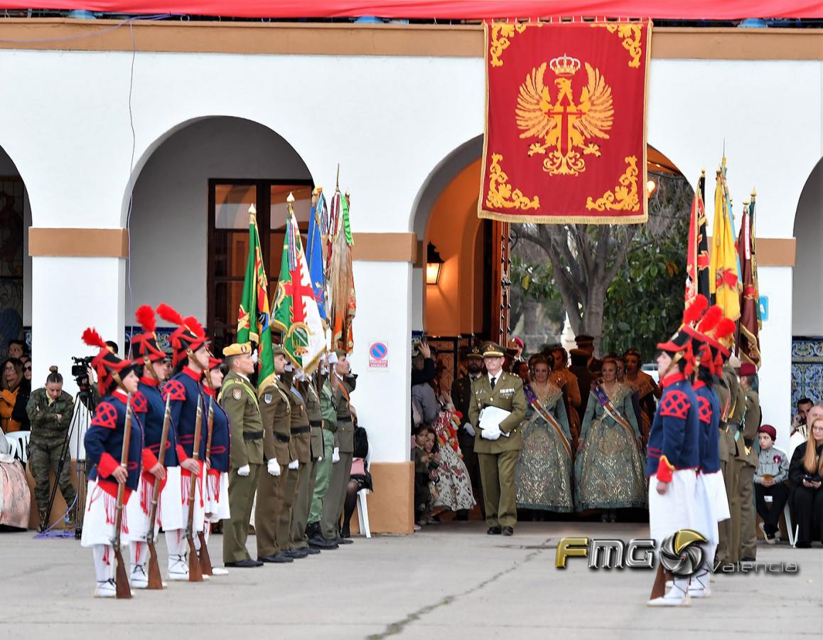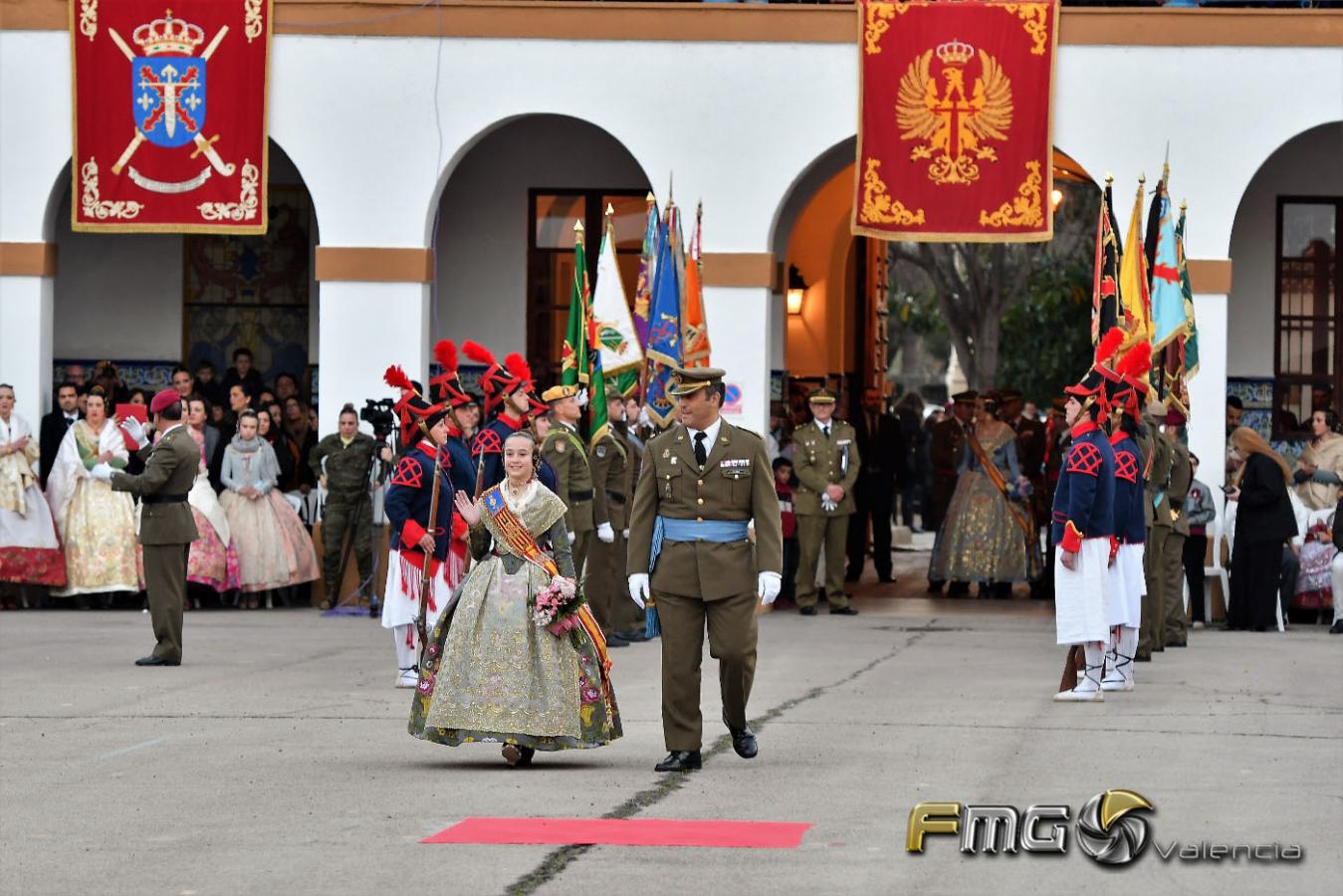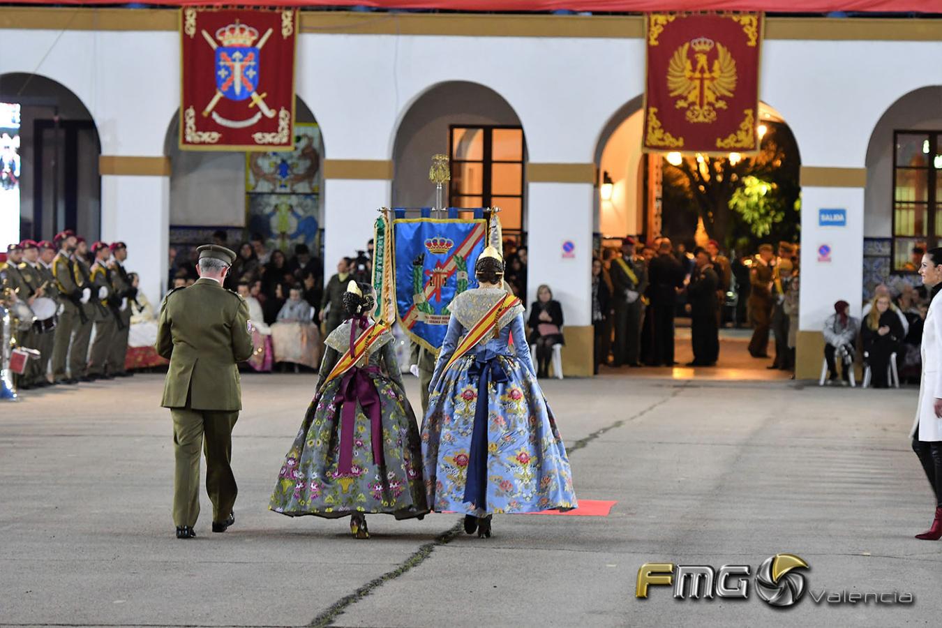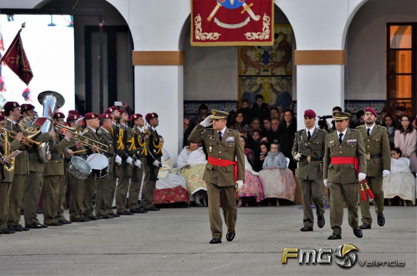 La Fallera Mayor y Fallera Mayor Infantil con sus respectivas Cortes de Honor, fueron recibidas en el patio de armas del acuartelamiento, donde formaron una representación de hombres y mujeres de diferentes unidades del Ejército de Tierra ubicadas en Valencia, además de personal de la Unidad Militar de Emergencias, 6ª Zona de la Guardia Civil, Comandancia de Marina y Ejército del Aire,