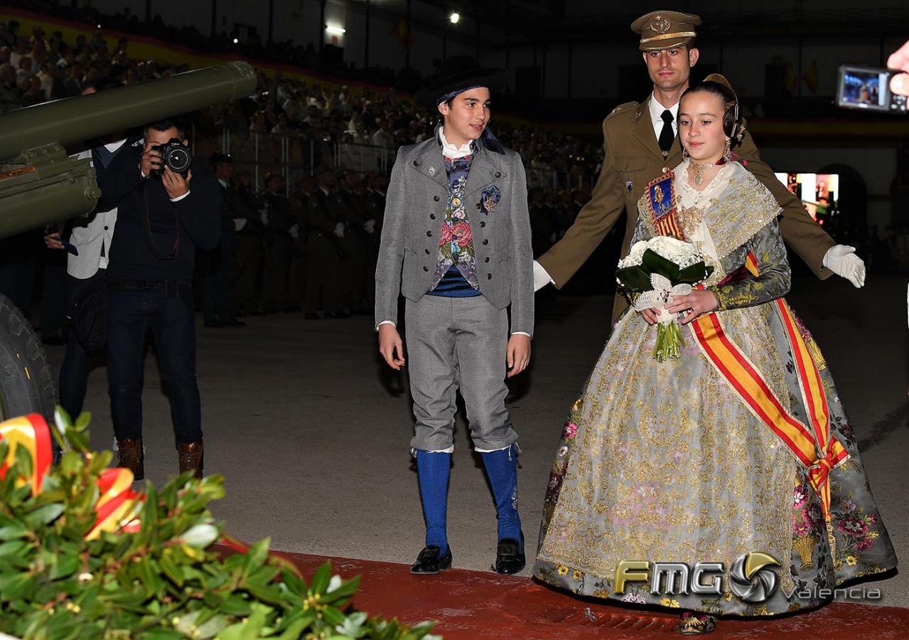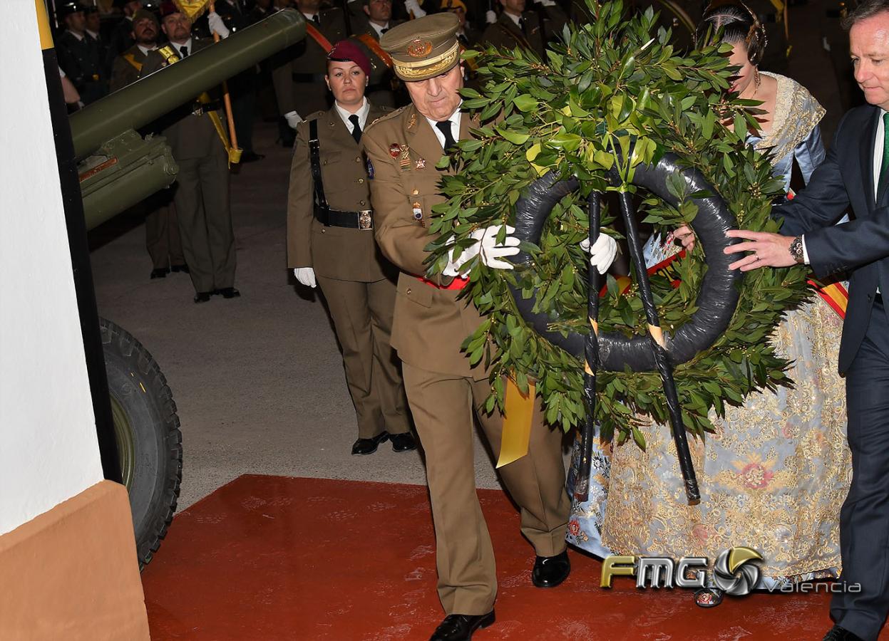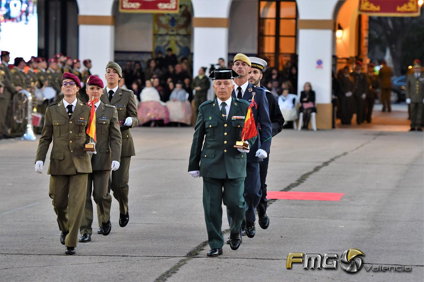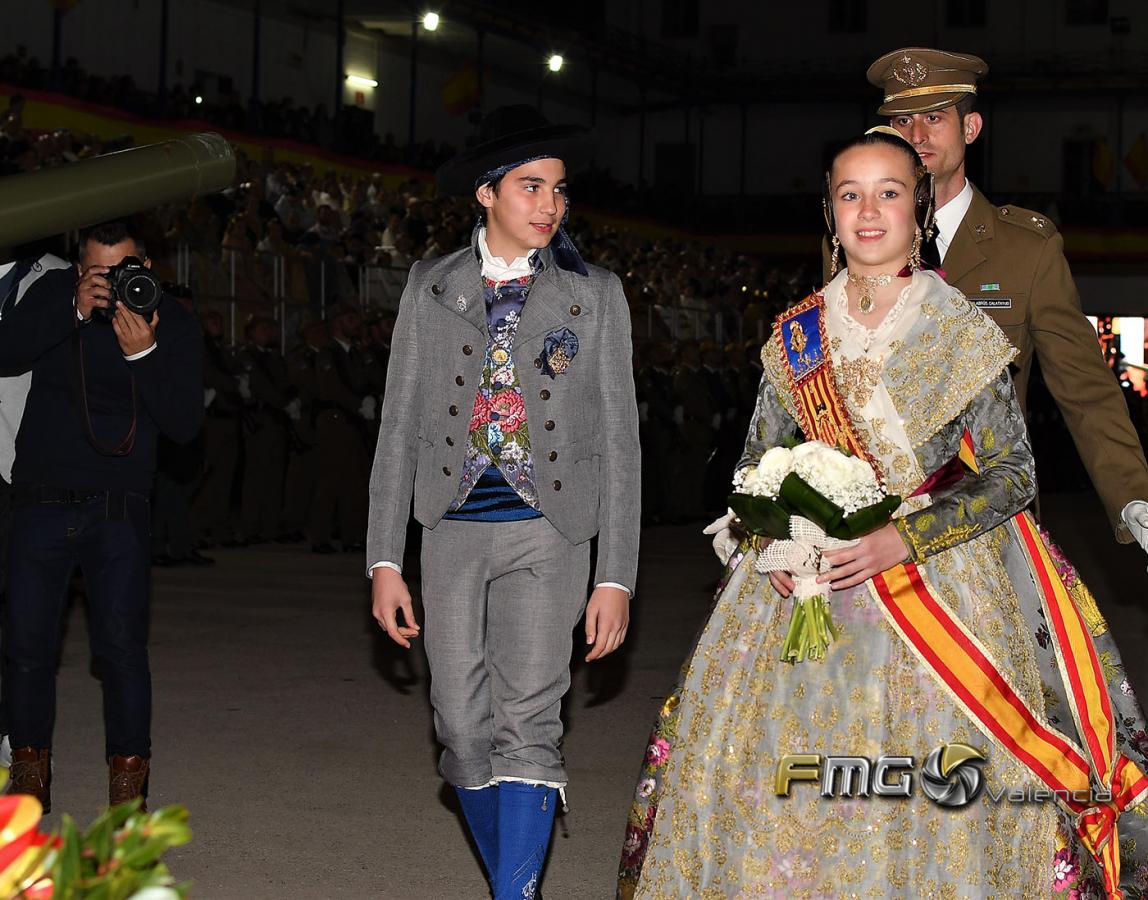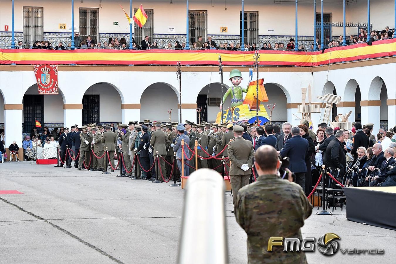 La Fallera Mayor y Fallera Mayor Infantil con sus respectivas Cortes de Honor, fueron recibidas en el patio de armas del acuartelamiento, donde formaron una representación de hombres y mujeres de diferentes unidades del Ejército de Tierra ubicadas en Valencia, además de personal de la Unidad Militar de Emergencias, 6ª Zona de la Guardia Civil, Comandancia de Marina y Ejército del Aire,