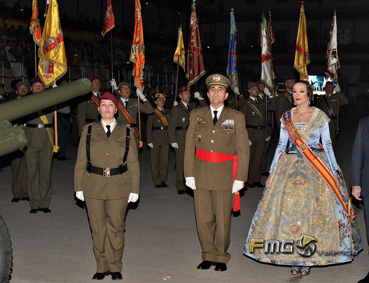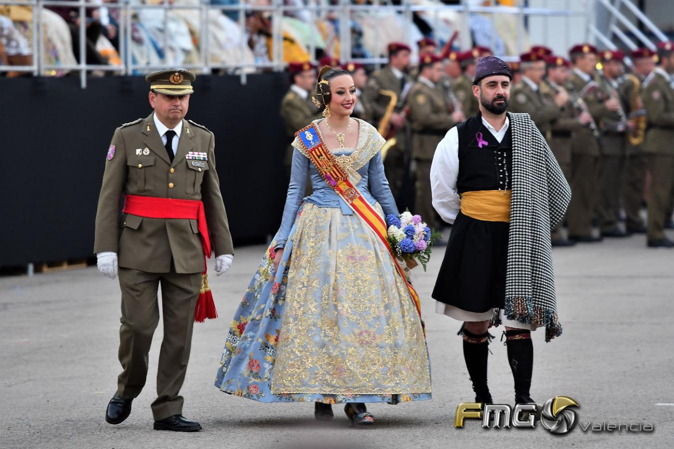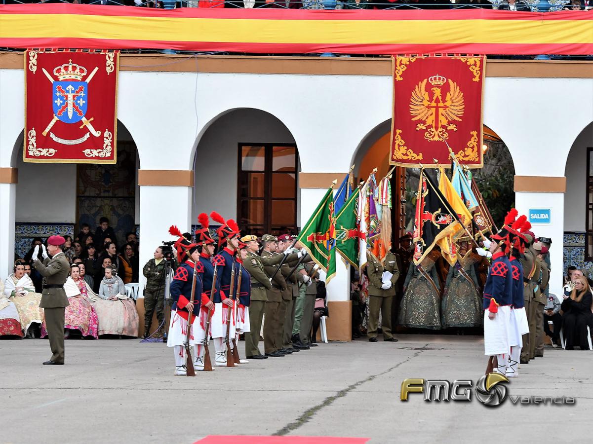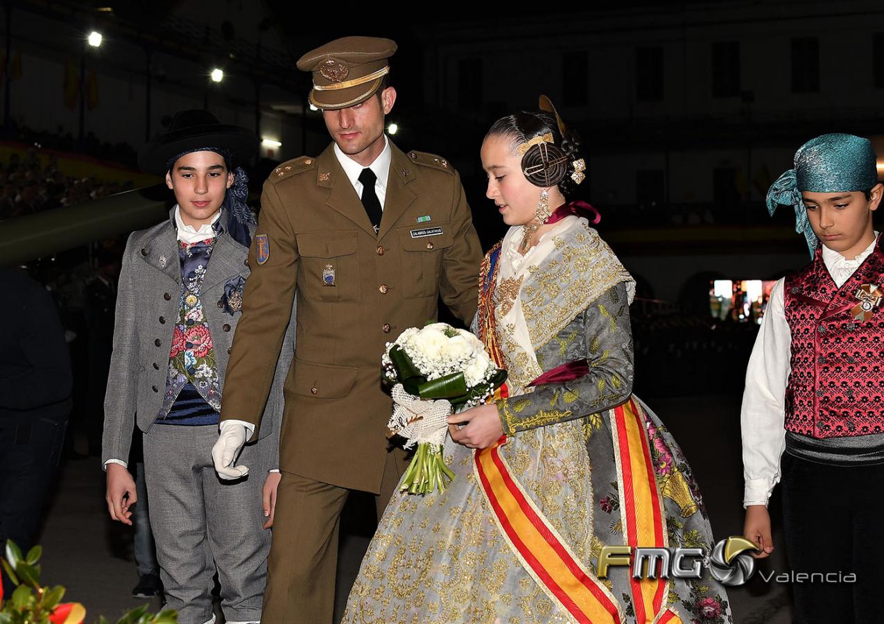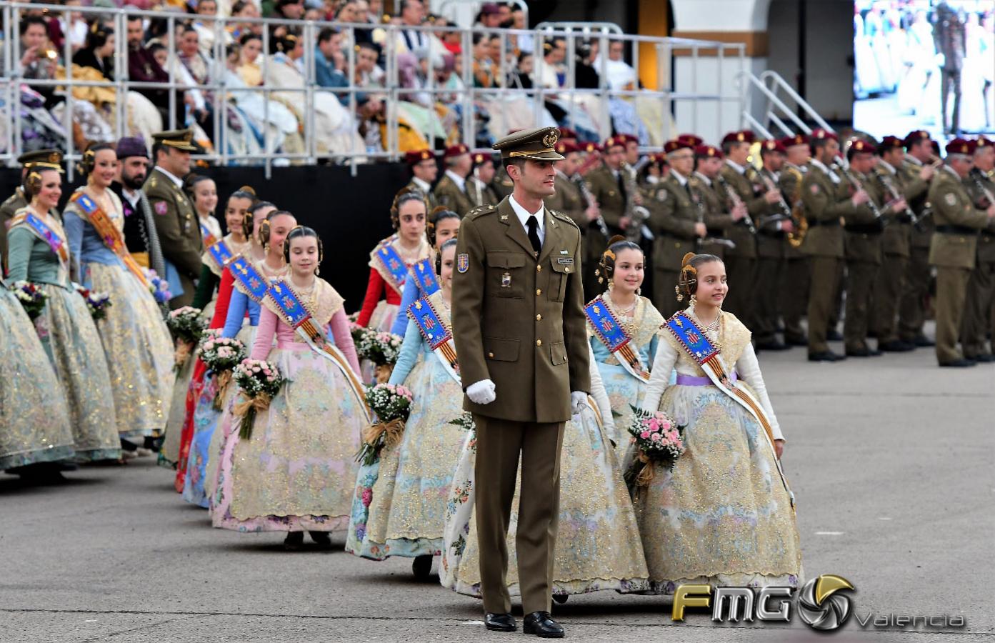 La Fallera Mayor y Fallera Mayor Infantil con sus respectivas Cortes de Honor, fueron recibidas en el patio de armas del acuartelamiento, donde formaron una representación de hombres y mujeres de diferentes unidades del Ejército de Tierra ubicadas en Valencia, además de personal de la Unidad Militar de Emergencias, 6ª Zona de la Guardia Civil, Comandancia de Marina y Ejército del Aire,