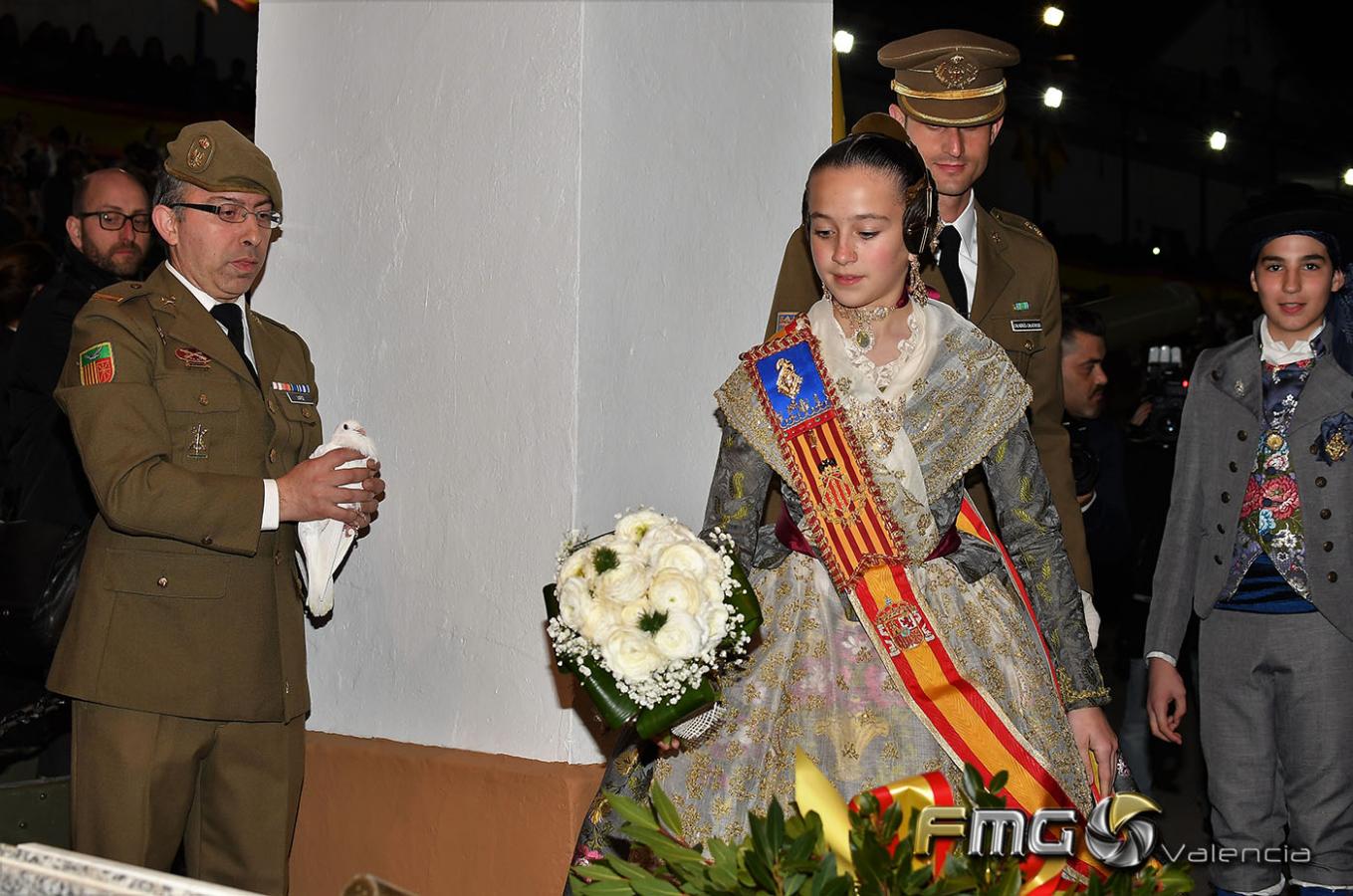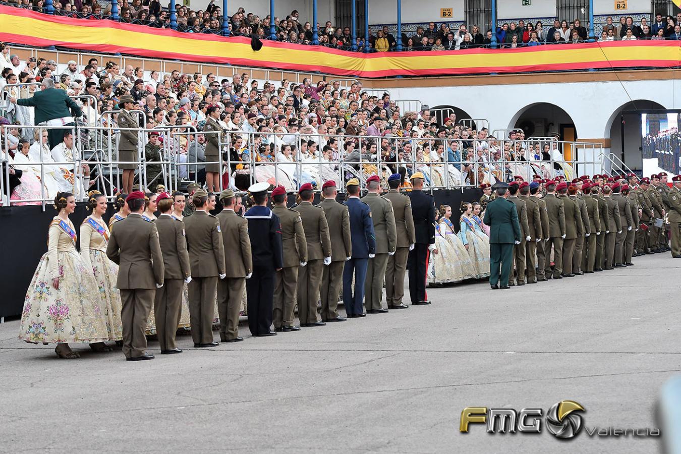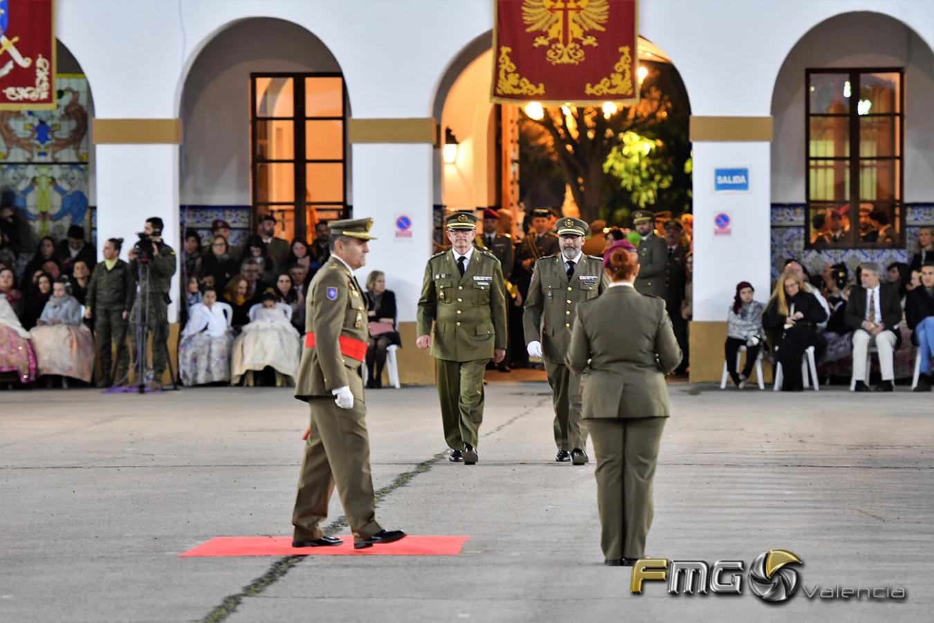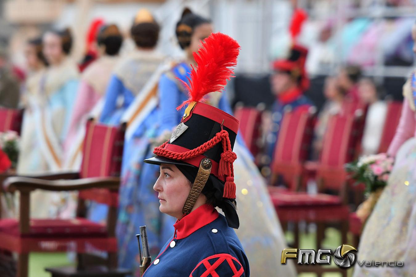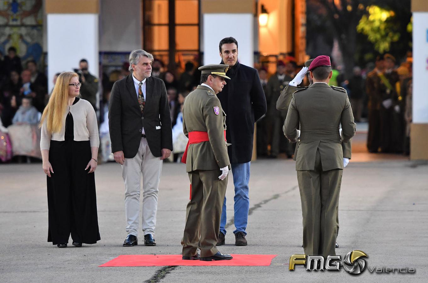 La Fallera Mayor y Fallera Mayor Infantil con sus respectivas Cortes de Honor, fueron recibidas en el patio de armas del acuartelamiento, donde formaron una representación de hombres y mujeres de diferentes unidades del Ejército de Tierra ubicadas en Valencia, además de personal de la Unidad Militar de Emergencias, 6ª Zona de la Guardia Civil, Comandancia de Marina y Ejército del Aire,