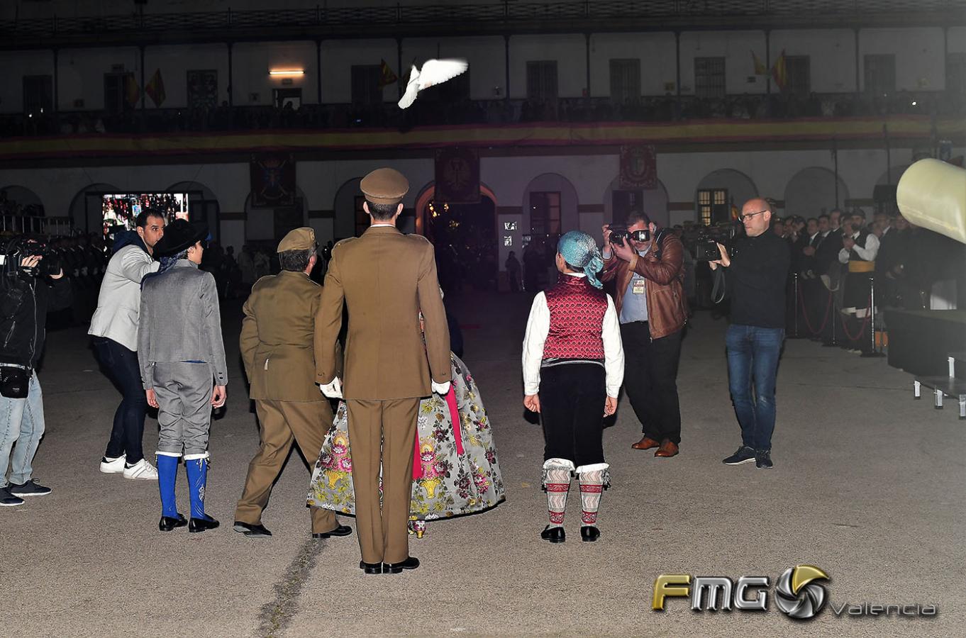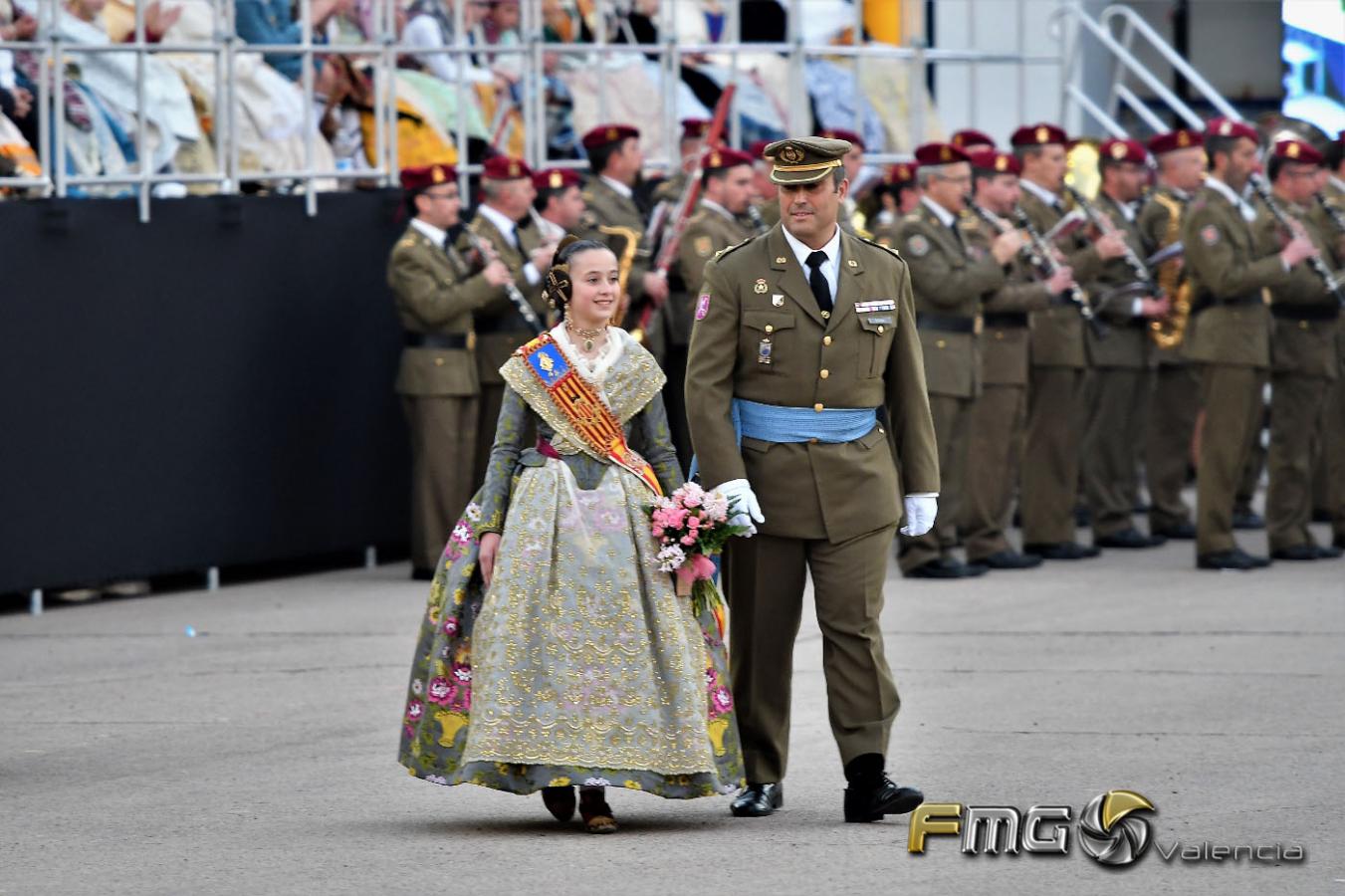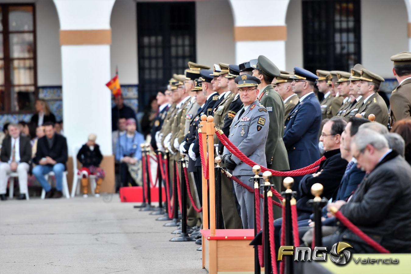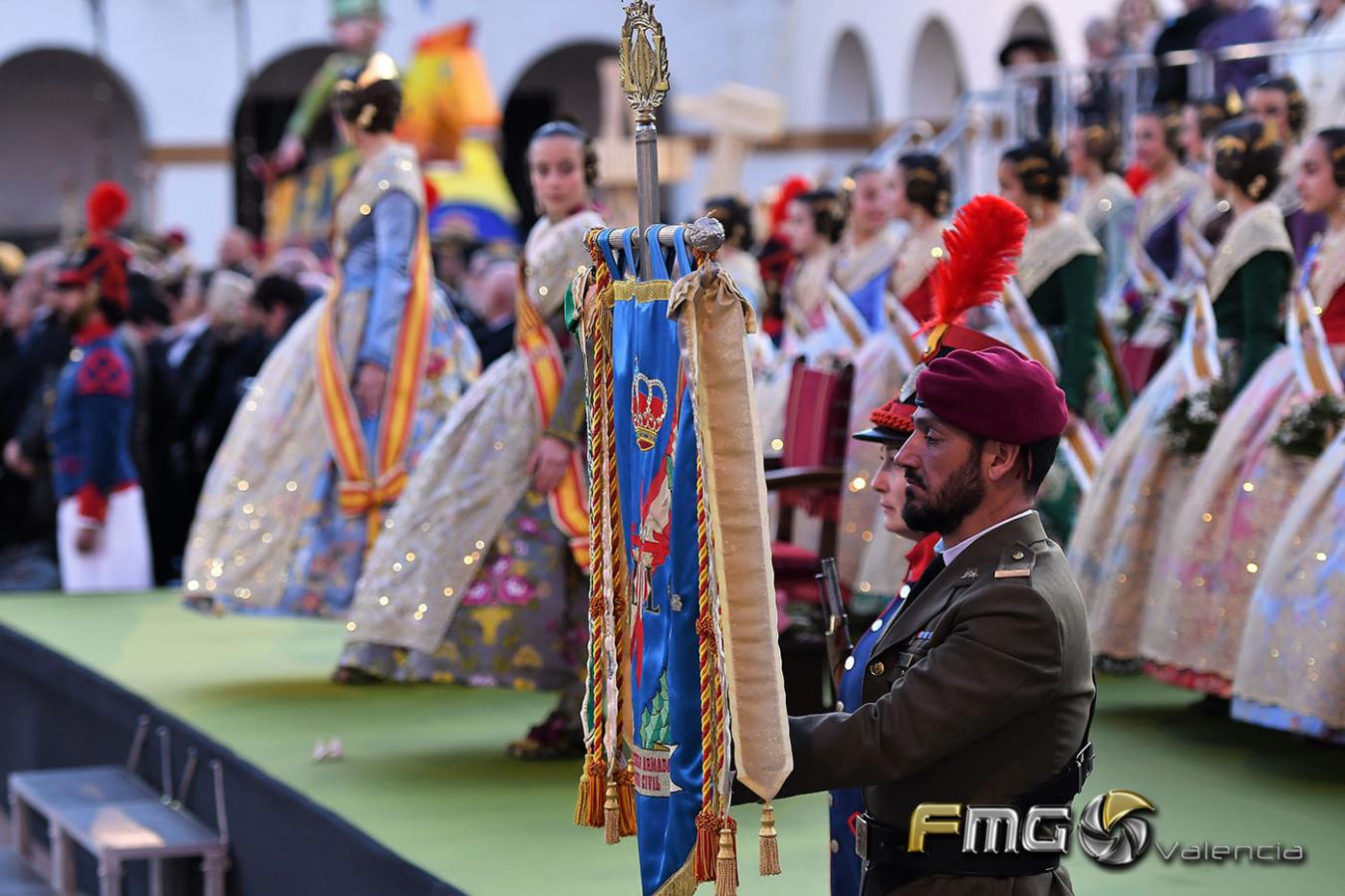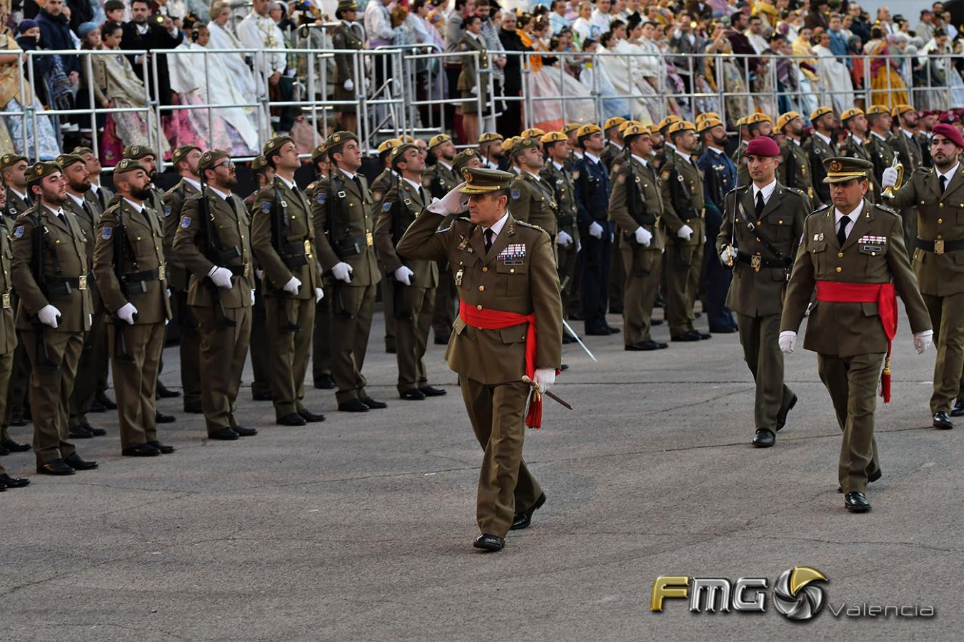 La Fallera Mayor y Fallera Mayor Infantil con sus respectivas Cortes de Honor, fueron recibidas en el patio de armas del acuartelamiento, donde formaron una representación de hombres y mujeres de diferentes unidades del Ejército de Tierra ubicadas en Valencia, además de personal de la Unidad Militar de Emergencias, 6ª Zona de la Guardia Civil, Comandancia de Marina y Ejército del Aire,