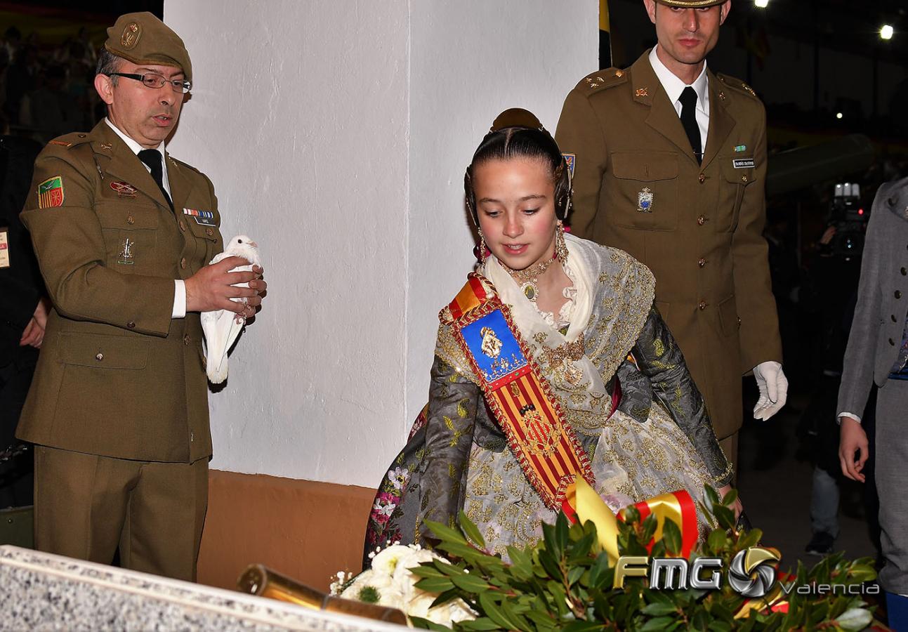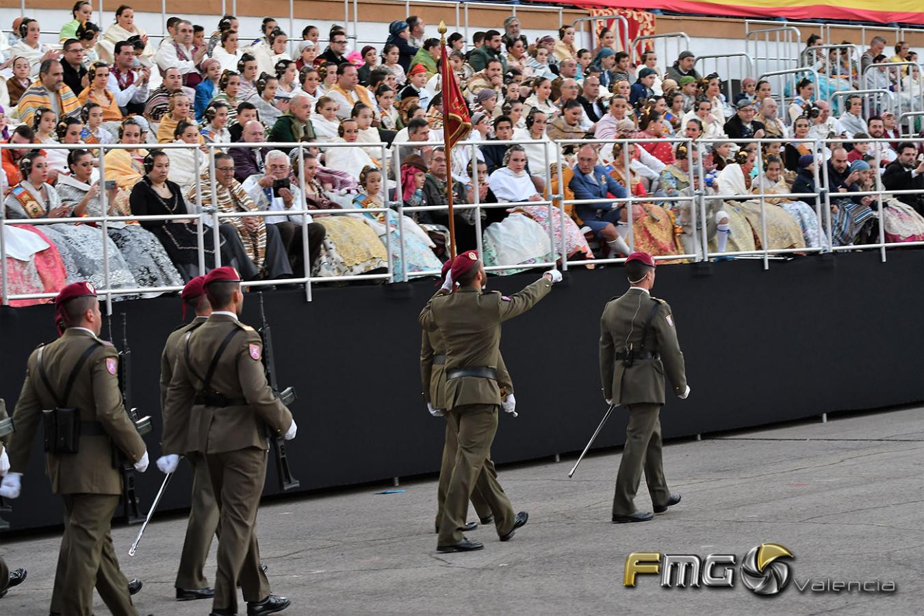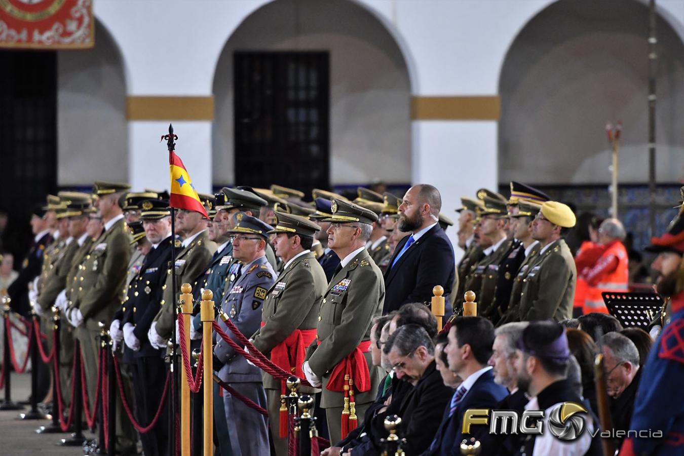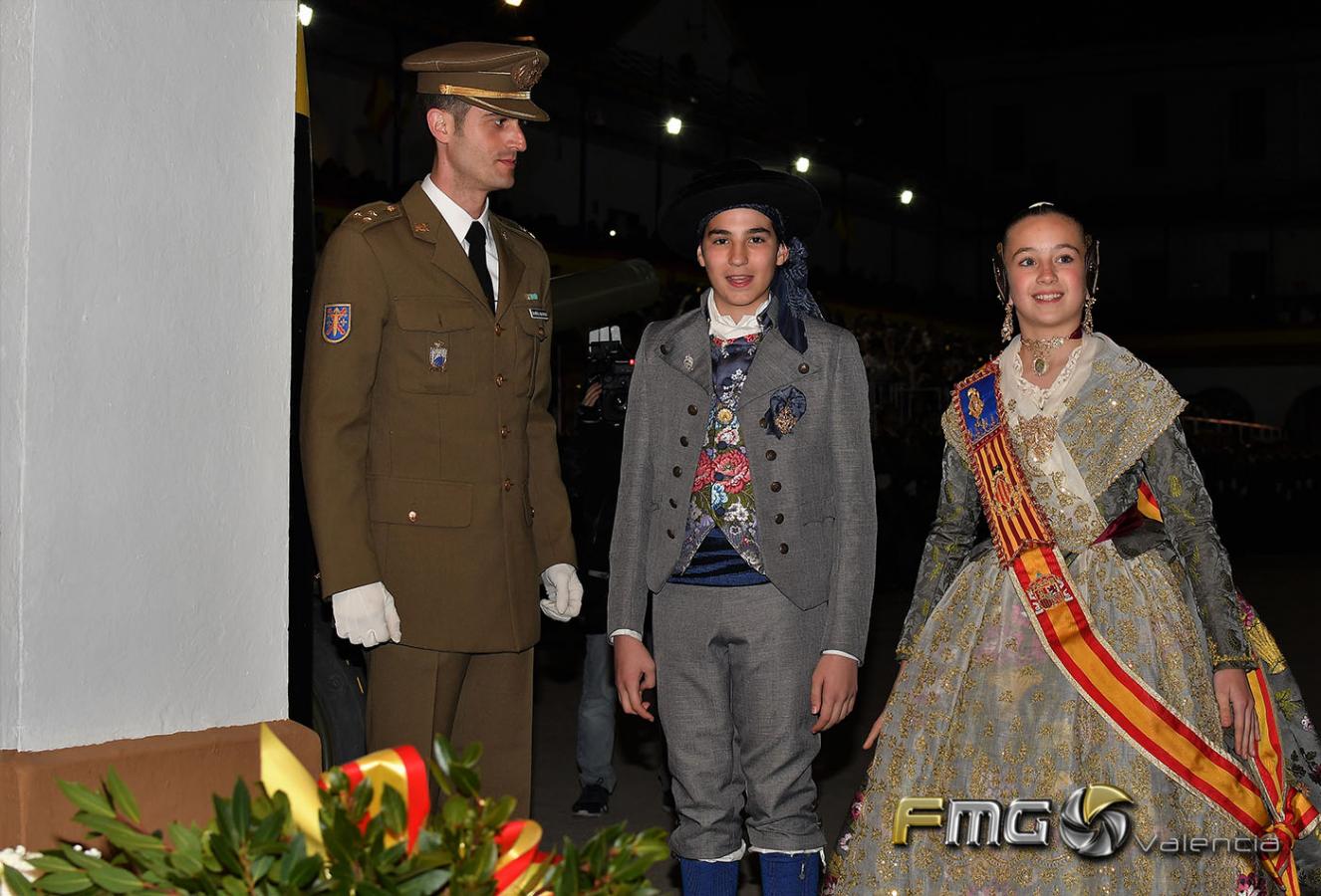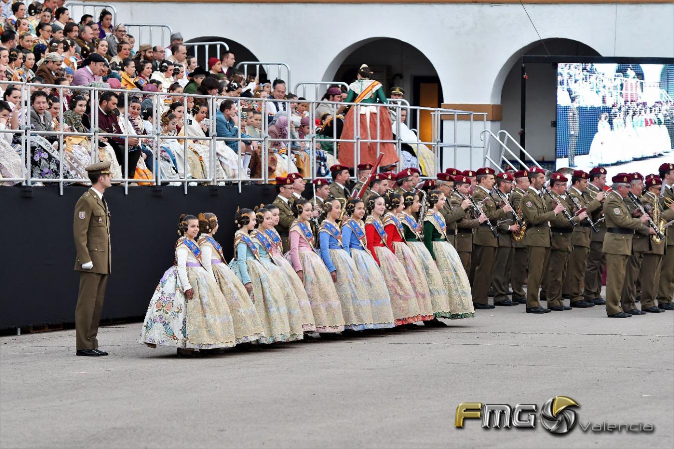 La Fallera Mayor y Fallera Mayor Infantil con sus respectivas Cortes de Honor, fueron recibidas en el patio de armas del acuartelamiento, donde formaron una representación de hombres y mujeres de diferentes unidades del Ejército de Tierra ubicadas en Valencia, además de personal de la Unidad Militar de Emergencias, 6ª Zona de la Guardia Civil, Comandancia de Marina y Ejército del Aire,