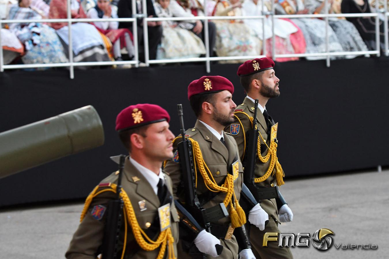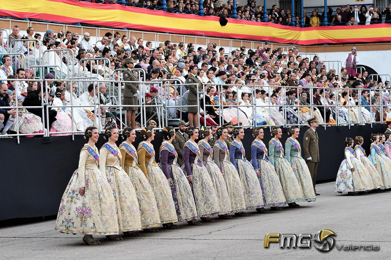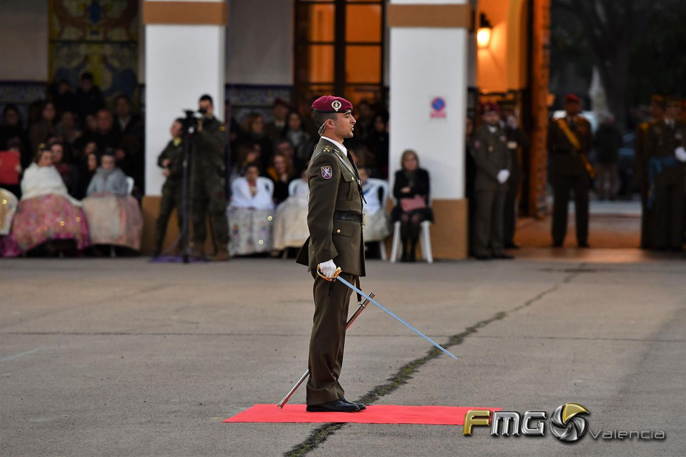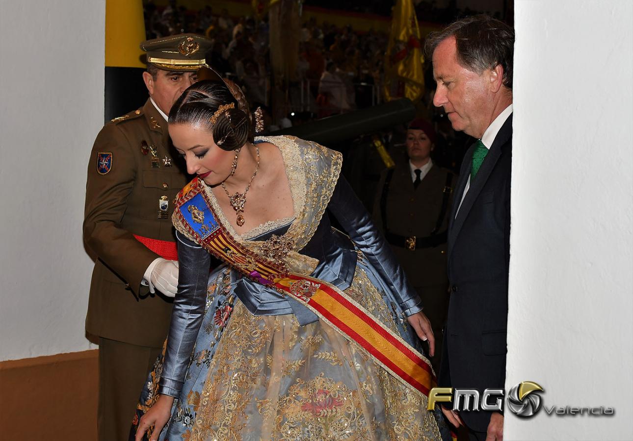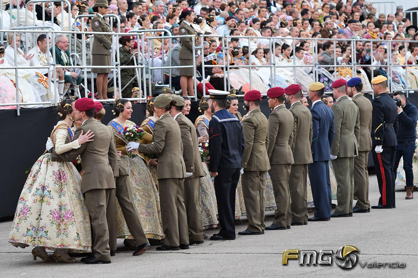 La Fallera Mayor y Fallera Mayor Infantil con sus respectivas Cortes de Honor, fueron recibidas en el patio de armas del acuartelamiento, donde formaron una representación de hombres y mujeres de diferentes unidades del Ejército de Tierra ubicadas en Valencia, además de personal de la Unidad Militar de Emergencias, 6ª Zona de la Guardia Civil, Comandancia de Marina y Ejército del Aire,