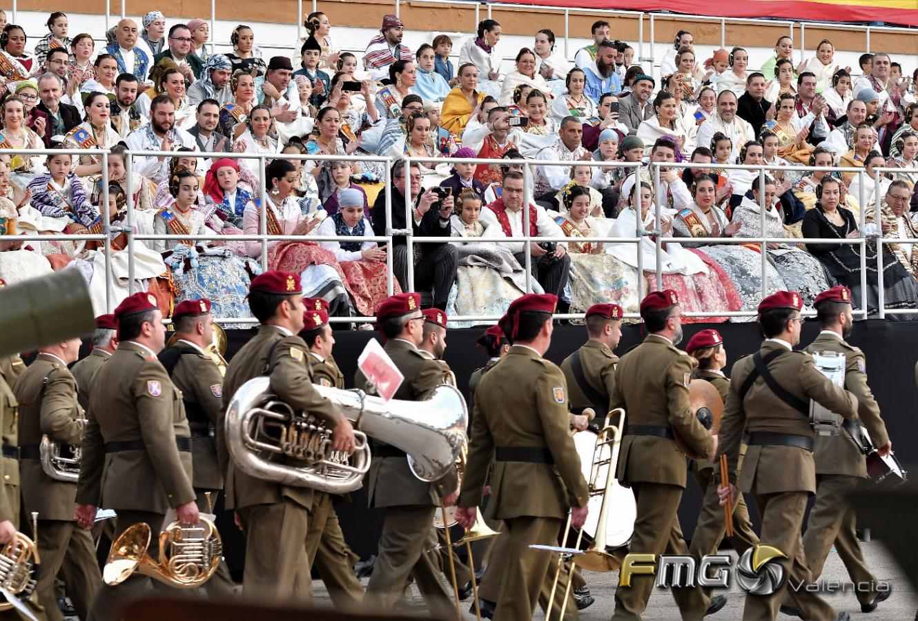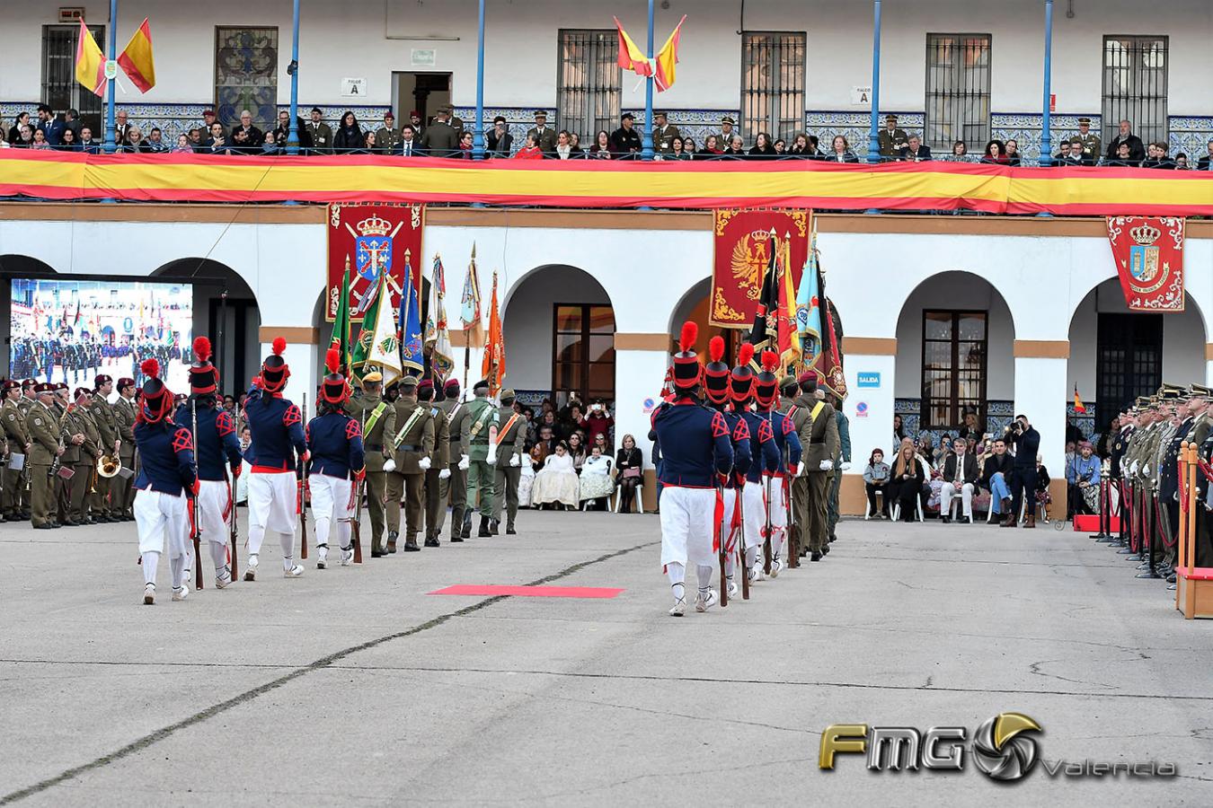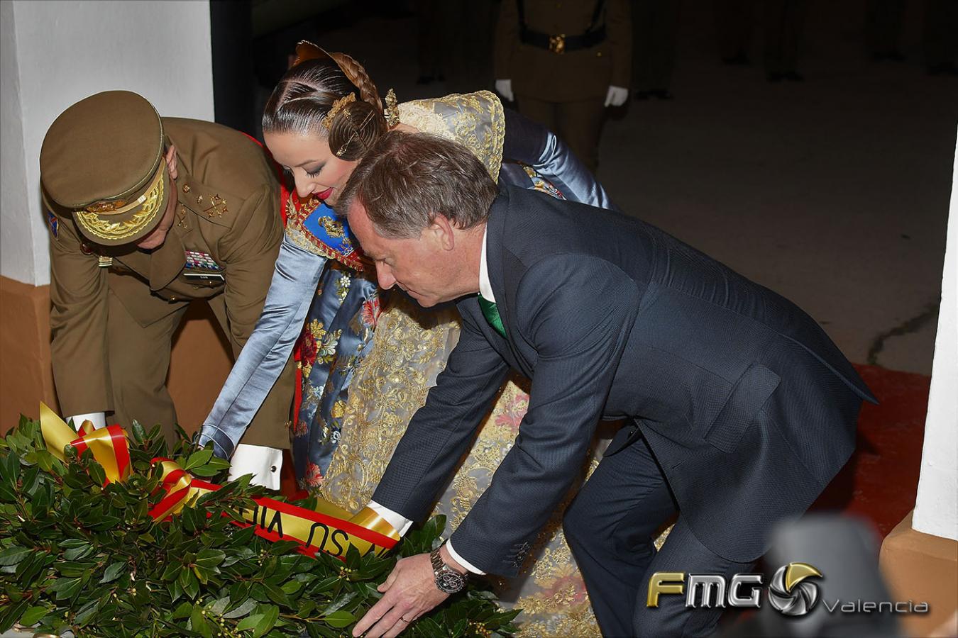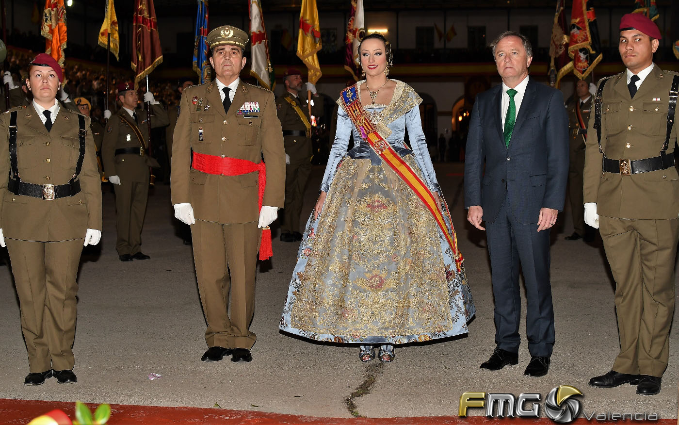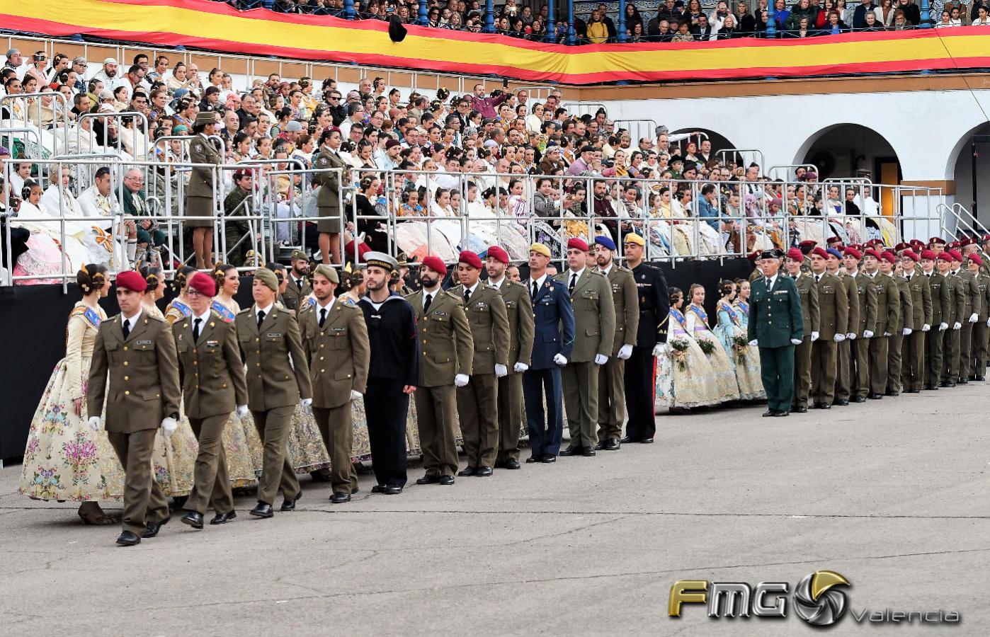 La Fallera Mayor y Fallera Mayor Infantil con sus respectivas Cortes de Honor, fueron recibidas en el patio de armas del acuartelamiento, donde formaron una representación de hombres y mujeres de diferentes unidades del Ejército de Tierra ubicadas en Valencia, además de personal de la Unidad Militar de Emergencias, 6ª Zona de la Guardia Civil, Comandancia de Marina y Ejército del Aire,