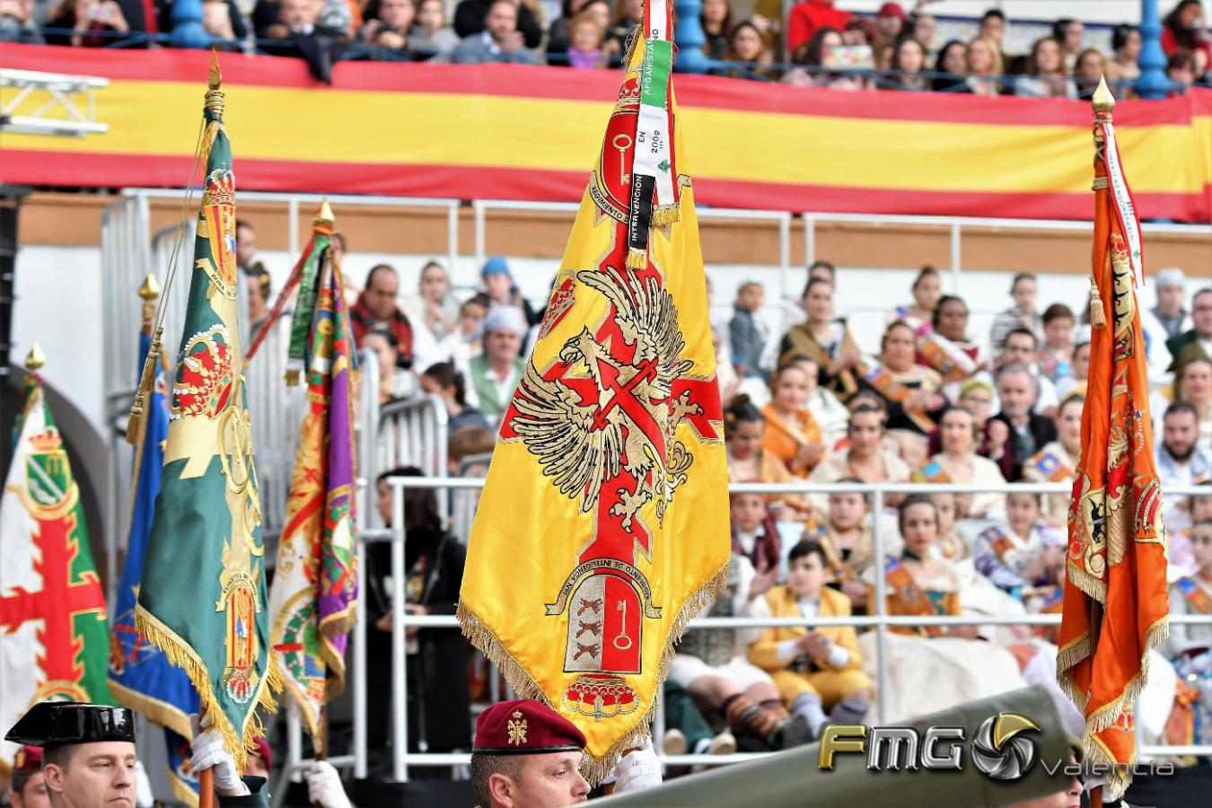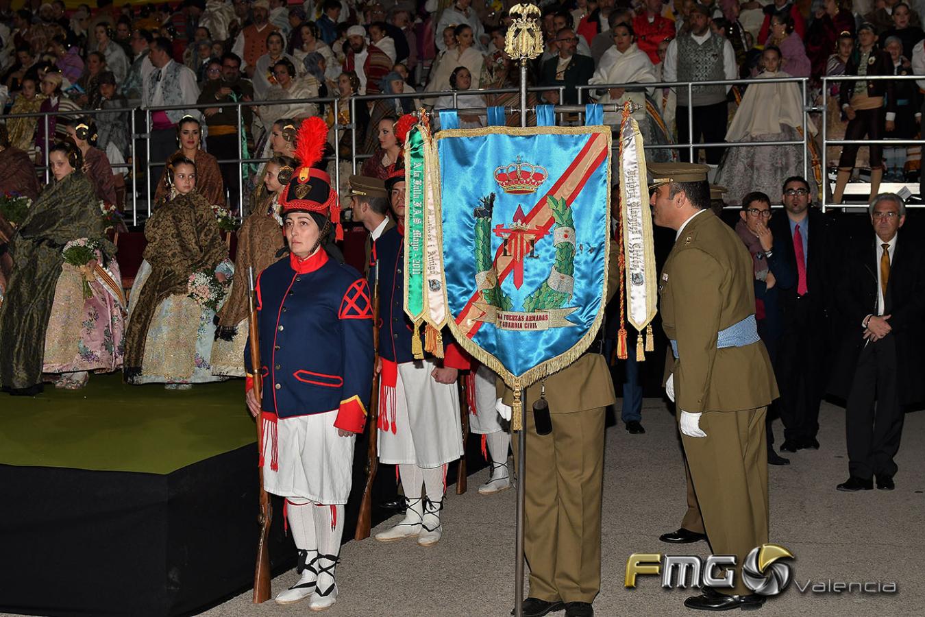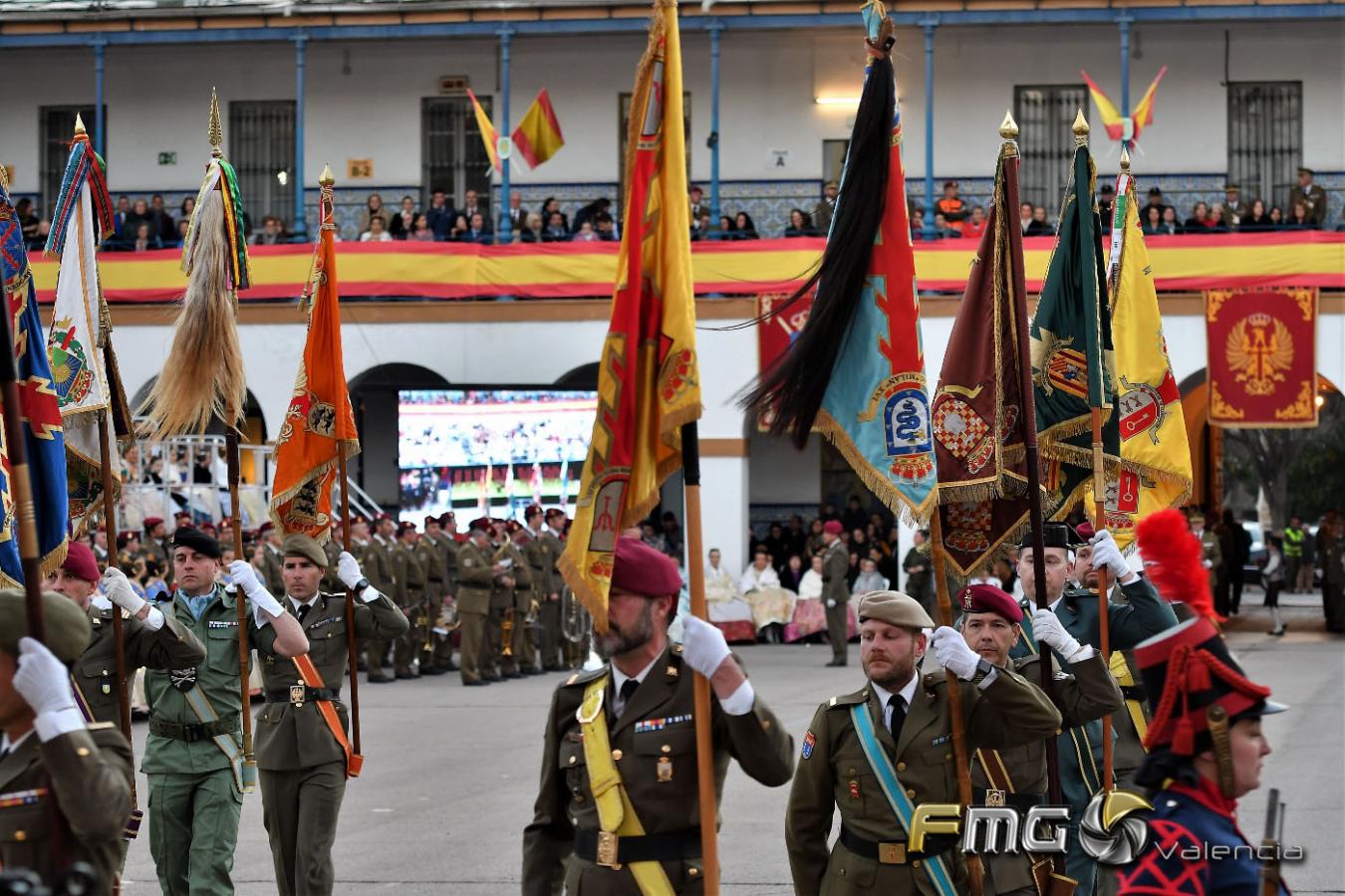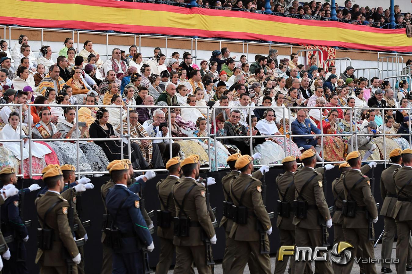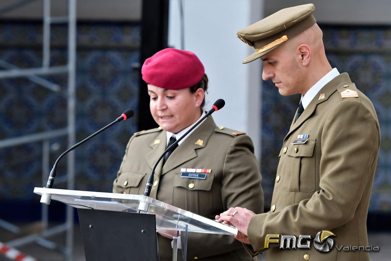 La Fallera Mayor y Fallera Mayor Infantil con sus respectivas Cortes de Honor, fueron recibidas en el patio de armas del acuartelamiento, donde formaron una representación de hombres y mujeres de diferentes unidades del Ejército de Tierra ubicadas en Valencia, además de personal de la Unidad Militar de Emergencias, 6ª Zona de la Guardia Civil, Comandancia de Marina y Ejército del Aire,
