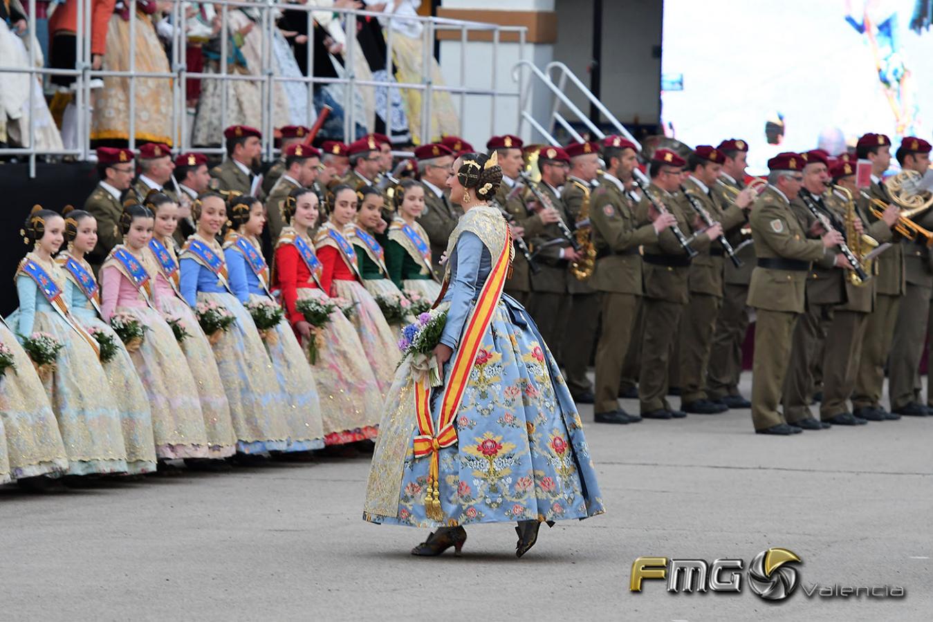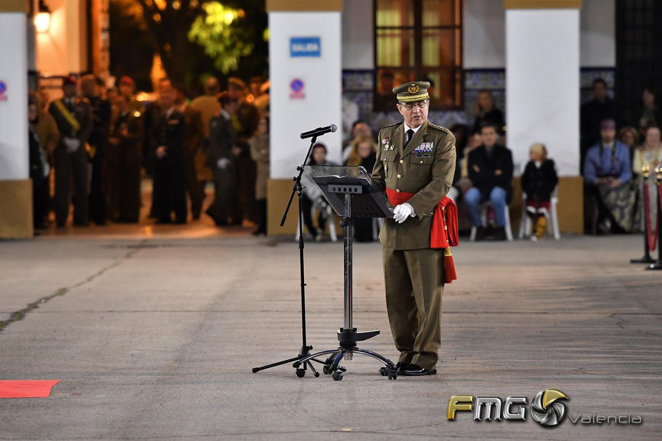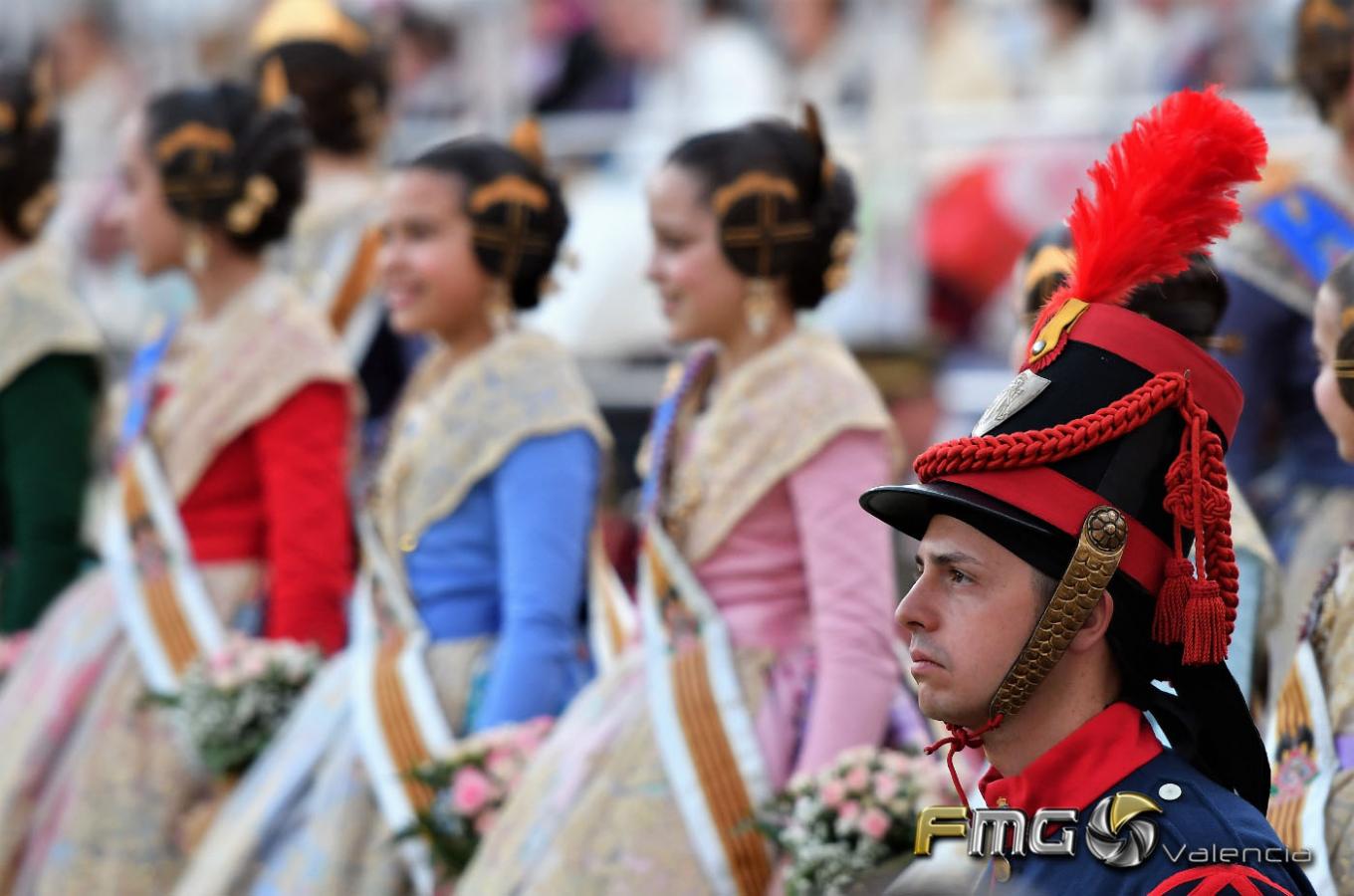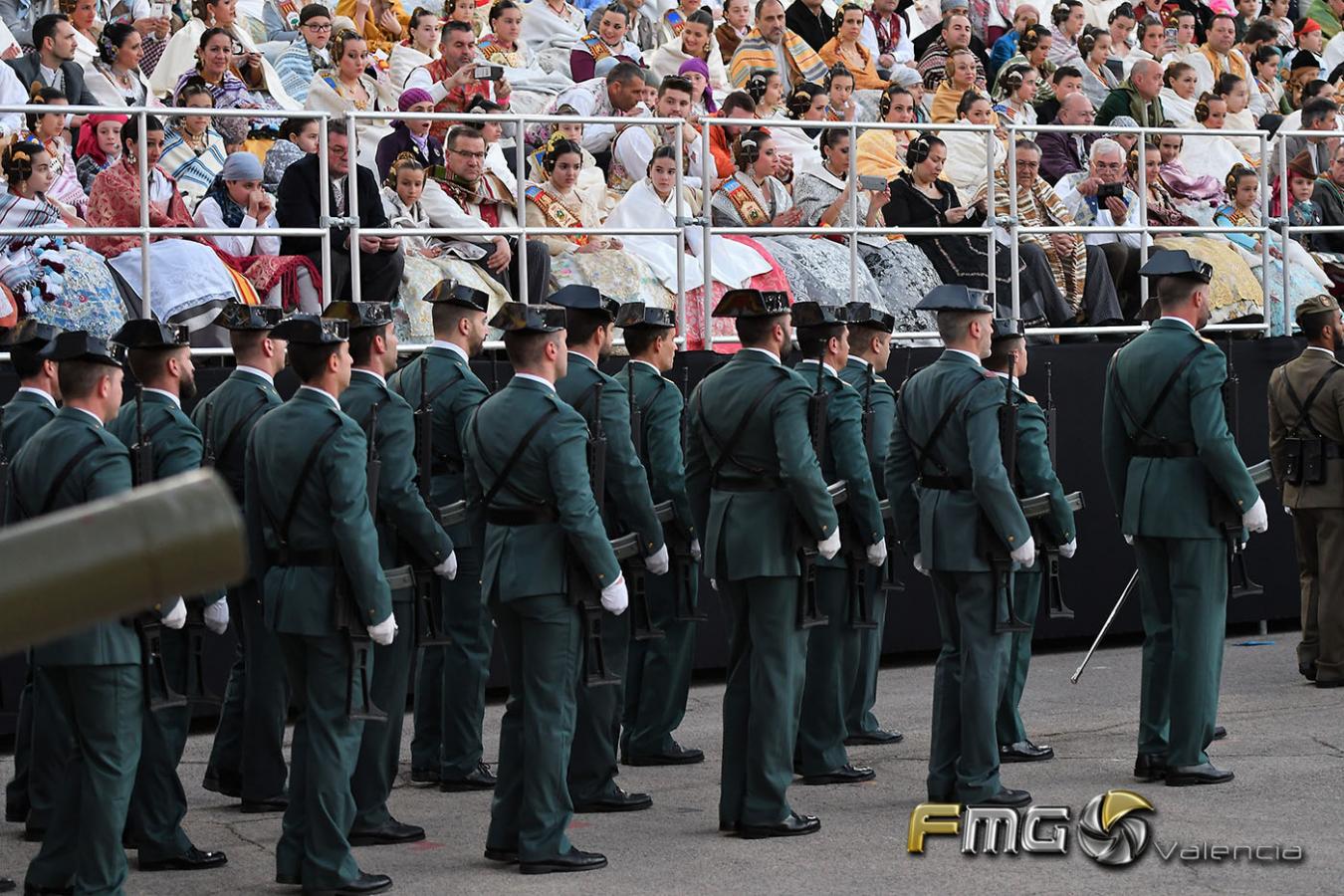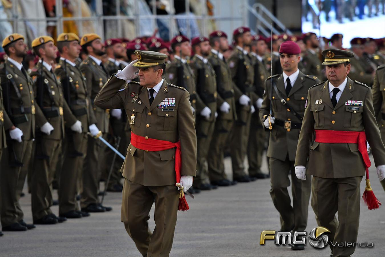 La Fallera Mayor y Fallera Mayor Infantil con sus respectivas Cortes de Honor, fueron recibidas en el patio de armas del acuartelamiento, donde formaron una representación de hombres y mujeres de diferentes unidades del Ejército de Tierra ubicadas en Valencia, además de personal de la Unidad Militar de Emergencias, 6ª Zona de la Guardia Civil, Comandancia de Marina y Ejército del Aire,