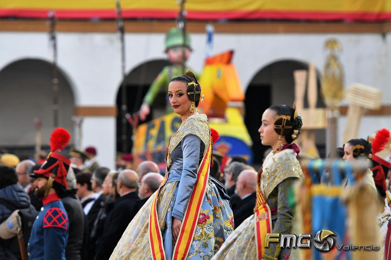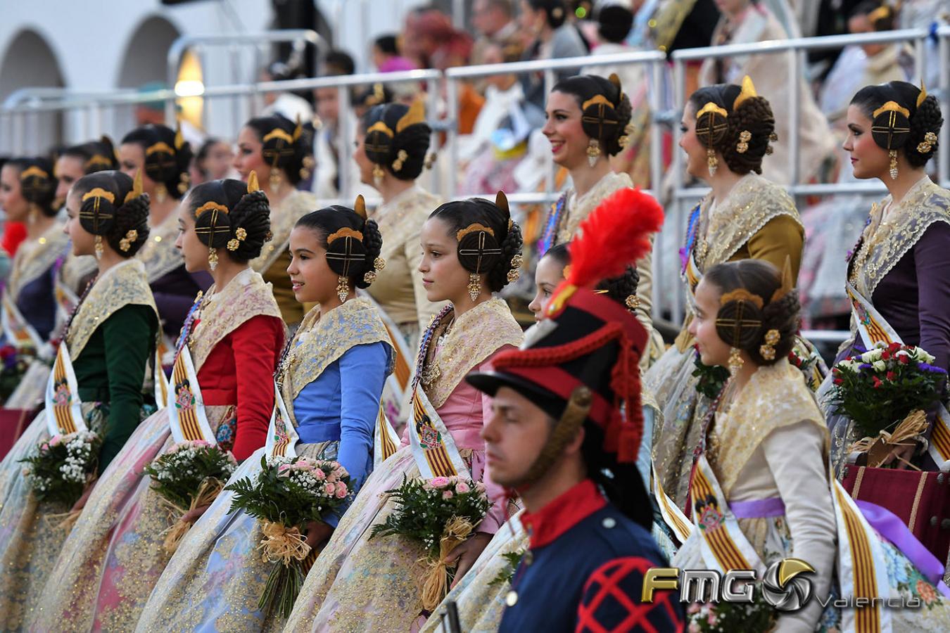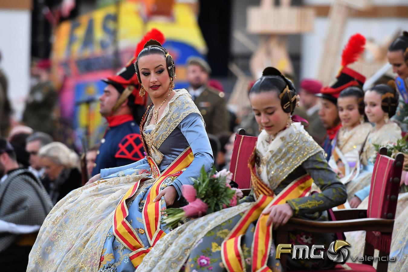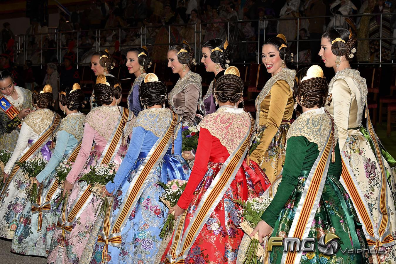 La Fallera Mayor Infantil de Valencia Daniela Gomez de los Ángeles, para este acto llevó un traje inspirado en el S.XVIII una seda con un dibujo exclusivo llamado VALLDIGNA de Compañia Valenciana, en color gris antracita. Por su parte la Fallera Mayor de Valencia eligió un elegante vestido azul confeccionado por José Martínez Polit de En Hilos de Seda. Un trabajo especial de Espolines de Garín para Rocío Gil Uncio que ha lucido un espolín Carpio, más detalles de la indumentaria de las fallera en Indumentat Revista de moda Valenciana