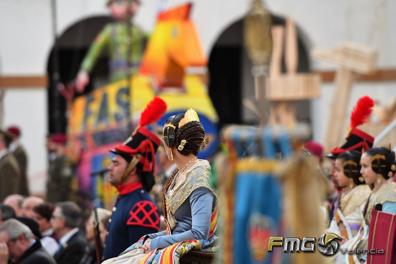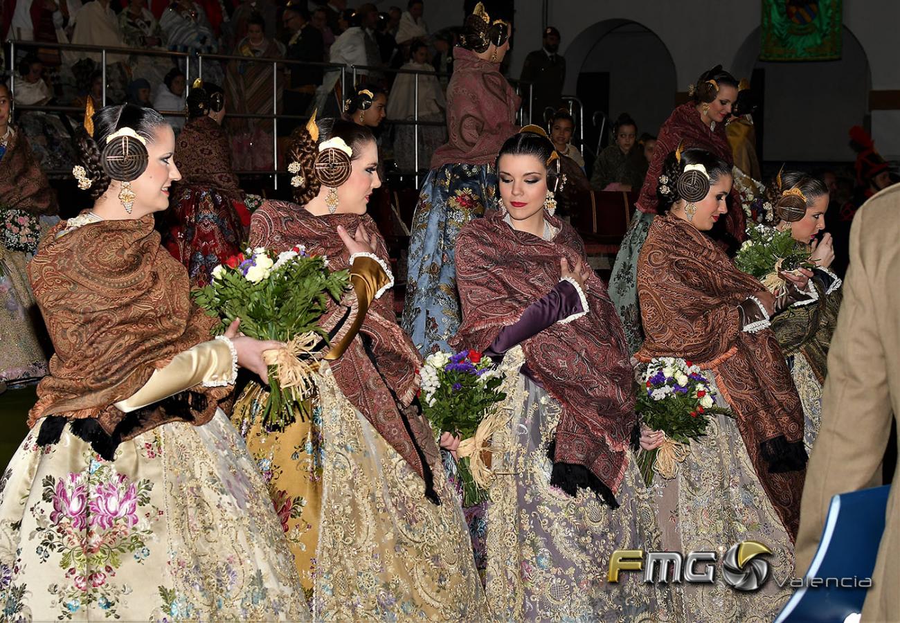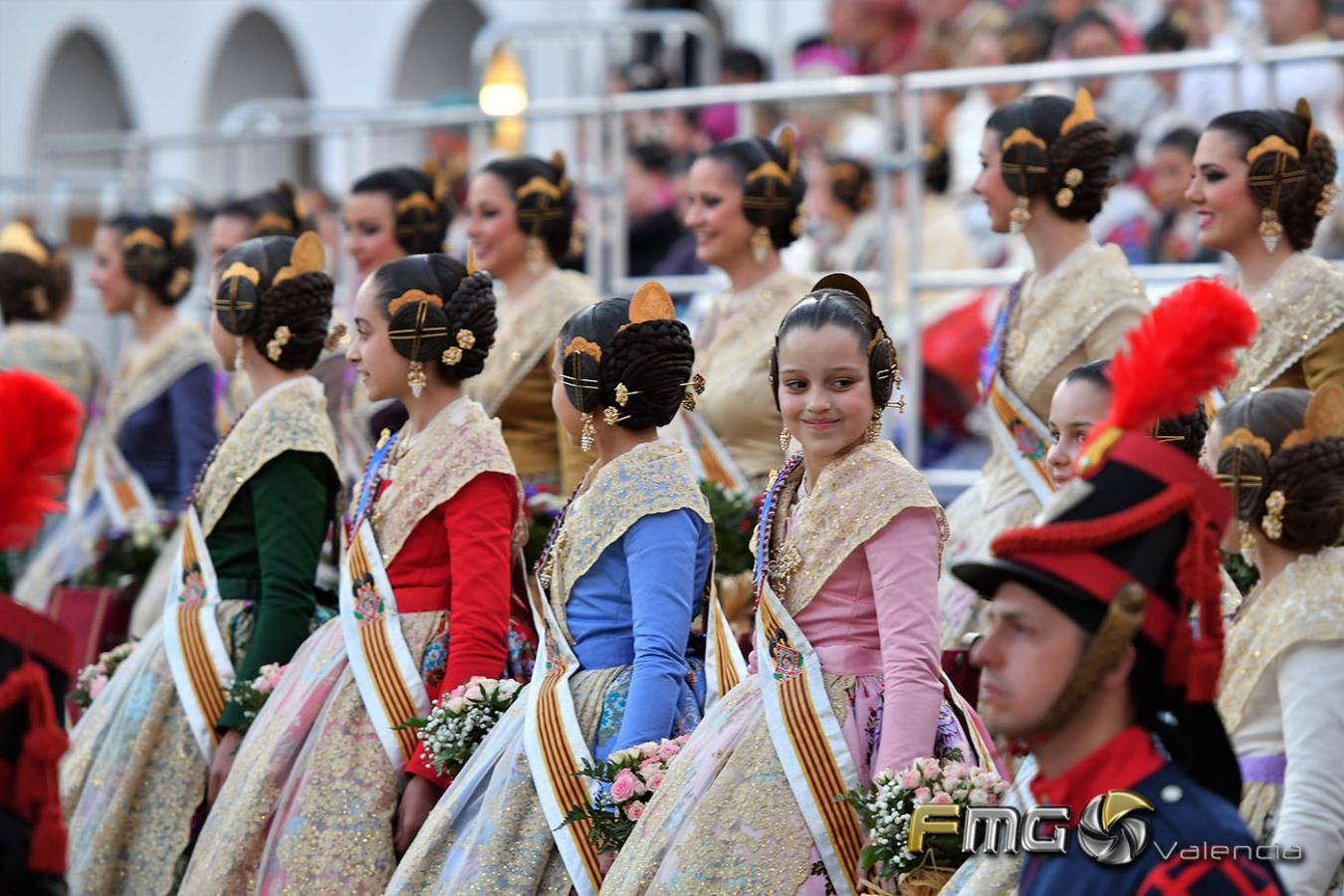 La Fallera Mayor Infantil de Valencia Daniela Gomez de los Ángeles, para este acto llevó un traje inspirado en el S.XVIII una seda con un dibujo exclusivo llamado VALLDIGNA de Compañia Valenciana, en color gris antracita. Por su parte la Fallera Mayor de Valencia eligió un elegante vestido azul confeccionado por José Martínez Polit de En Hilos de Seda. Un trabajo especial de Espolines de Garín para Rocío Gil Uncio que ha lucido un espolín Carpio, más detalles de la indumentaria de las fallera en Indumentat Revista de moda Valenciana