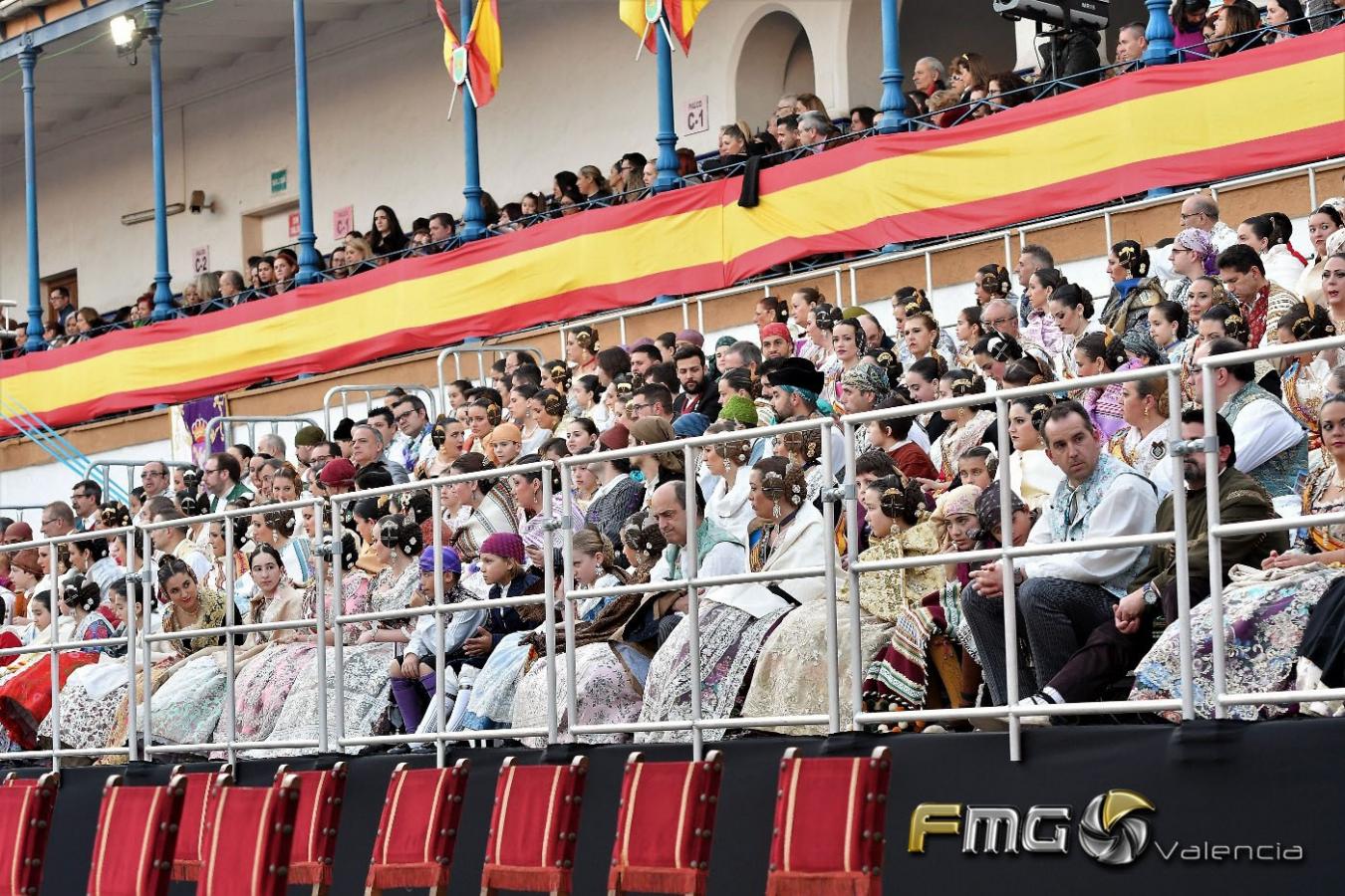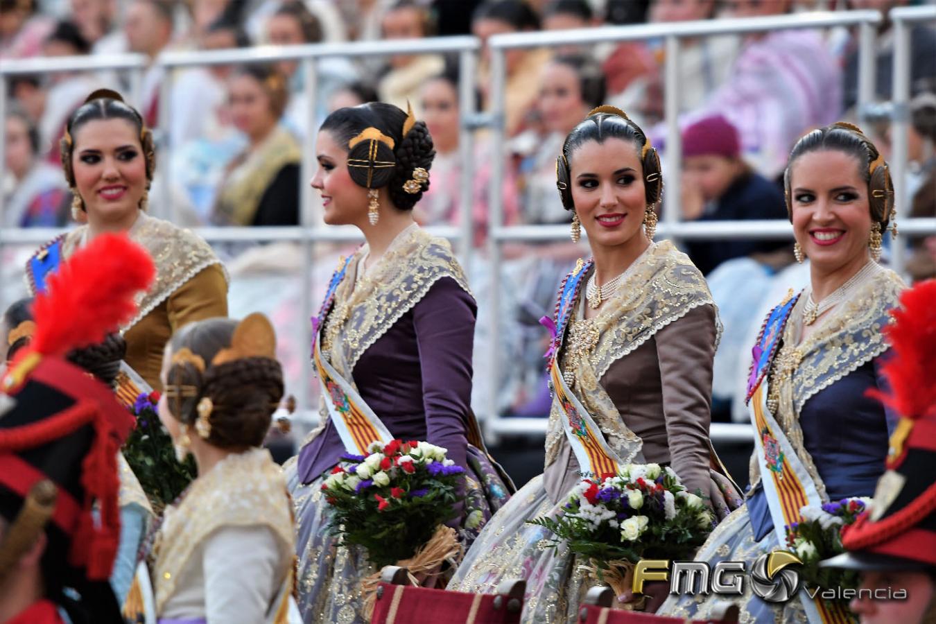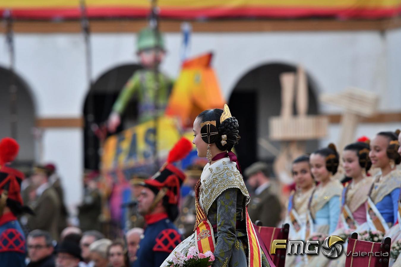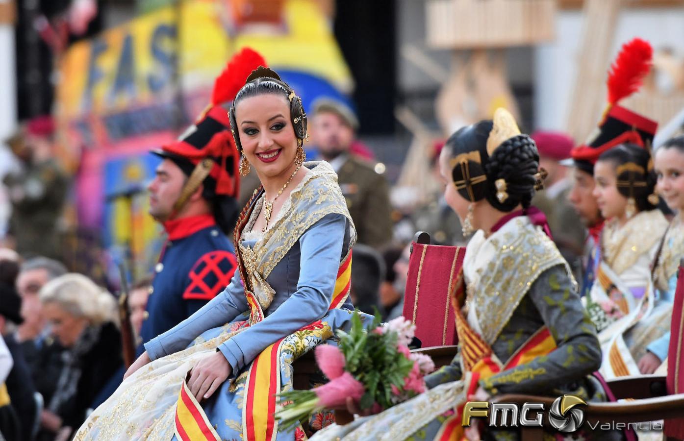 La Fallera Mayor Infantil de Valencia Daniela Gomez de los Ángeles, para este acto llevó un traje inspirado en el S.XVIII una seda con un dibujo exclusivo llamado VALLDIGNA de Compañia Valenciana, en color gris antracita. Por su parte la Fallera Mayor de Valencia eligió un elegante vestido azul confeccionado por José Martínez Polit de En Hilos de Seda. Un trabajo especial de Espolines de Garín para Rocío Gil Uncio que ha lucido un espolín Carpio, más detalles de la indumentaria de las fallera en Indumentat Revista de moda Valenciana