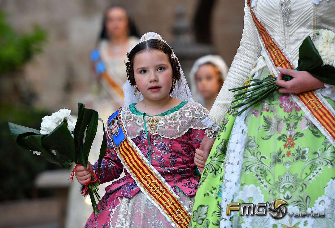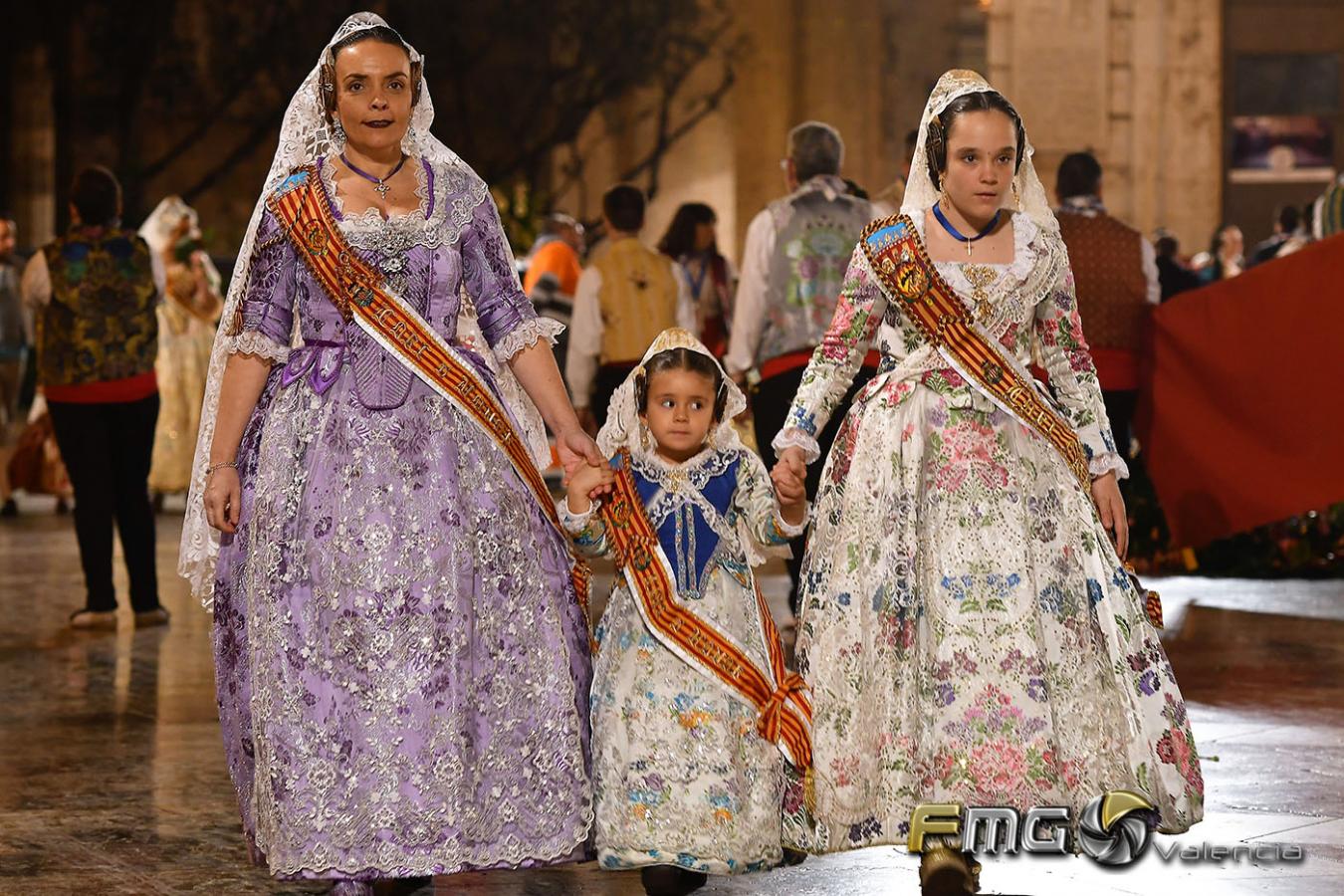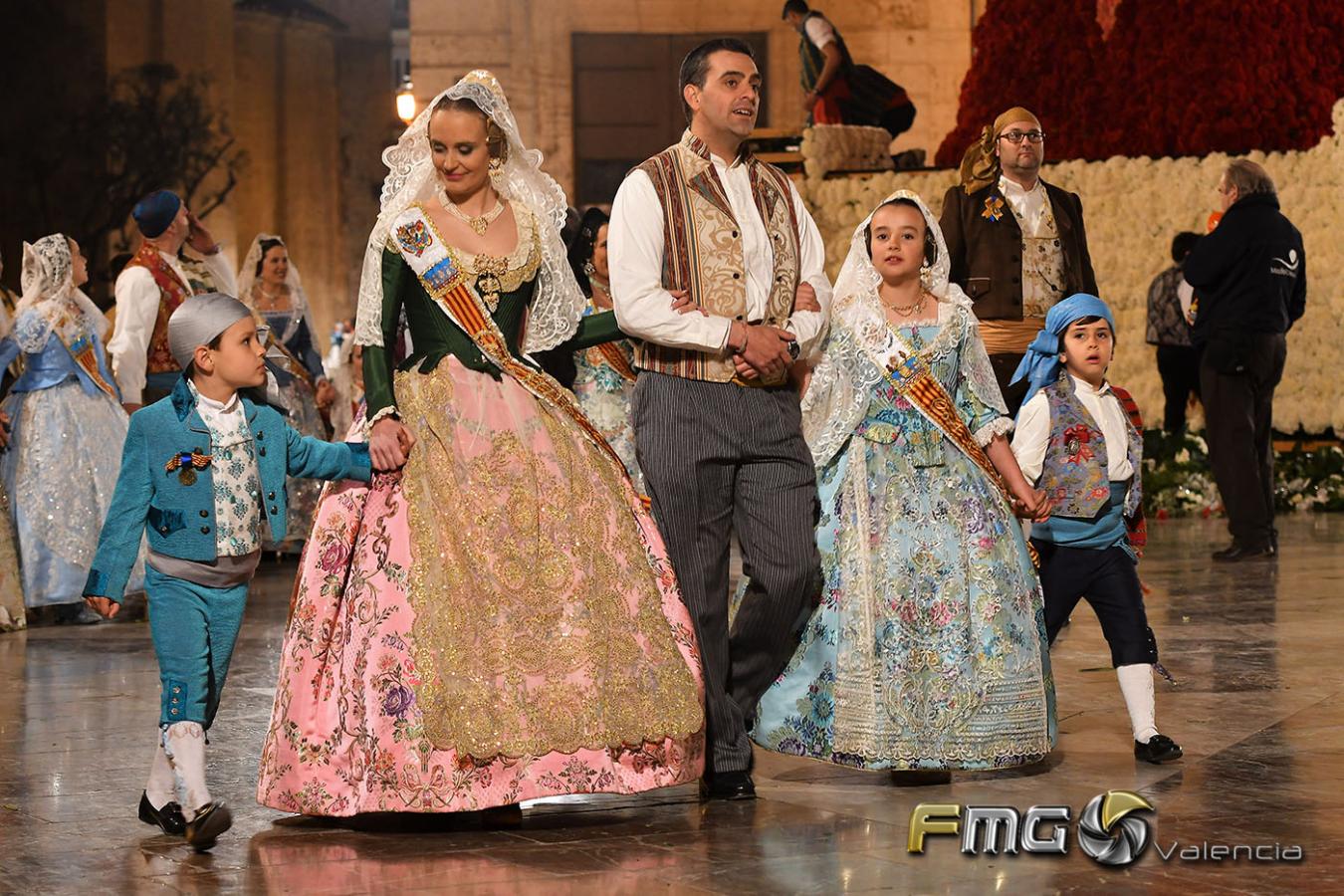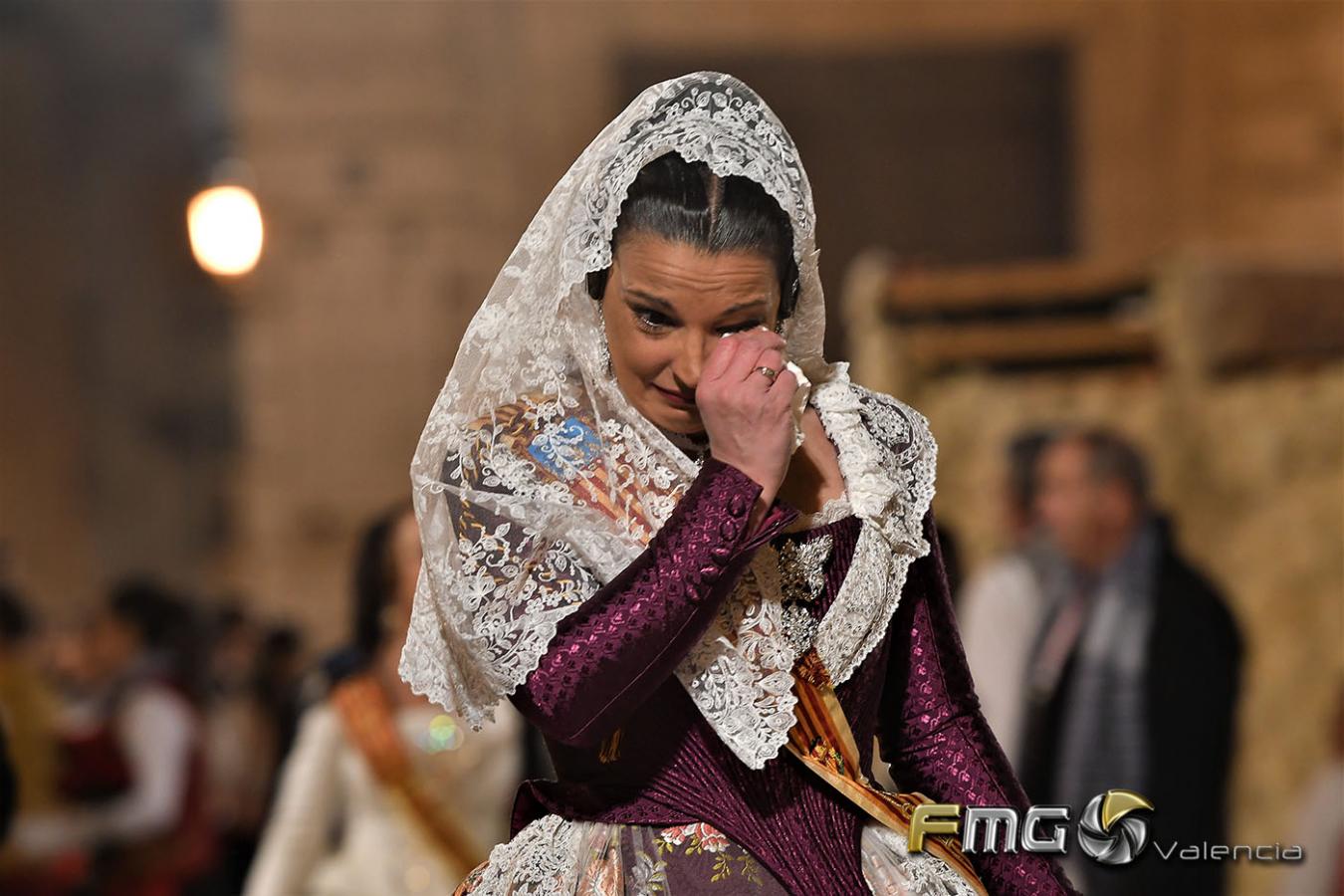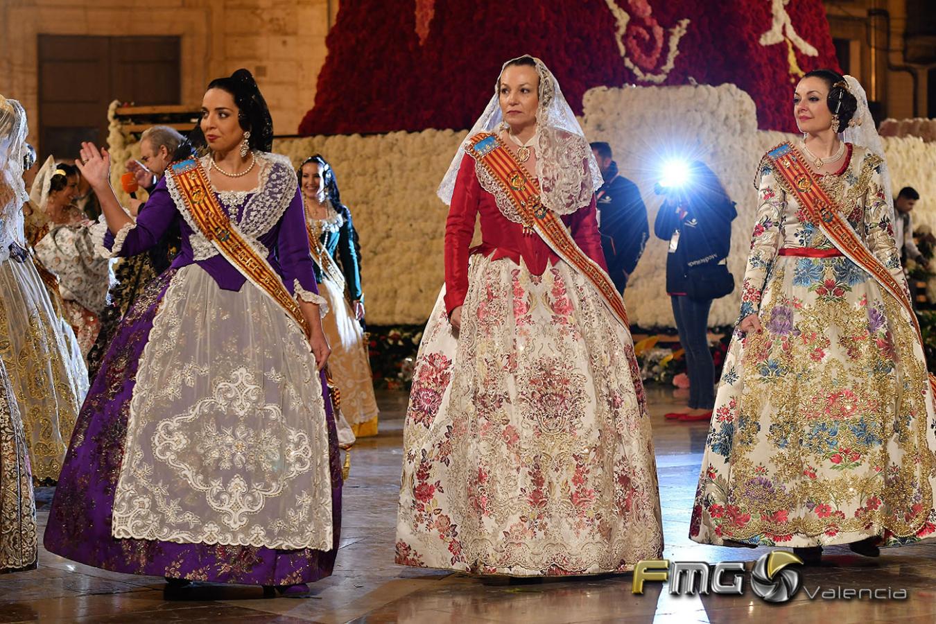 Sobre la 01:30 de la noche hizo su entrada la Fallera Mayor de Valencia Rocío Gil y su Corte de Honor que hicieron la ofrenda a la Mare de Déu con gran emoción durante su recorrido por la Plaza de la Virgen.