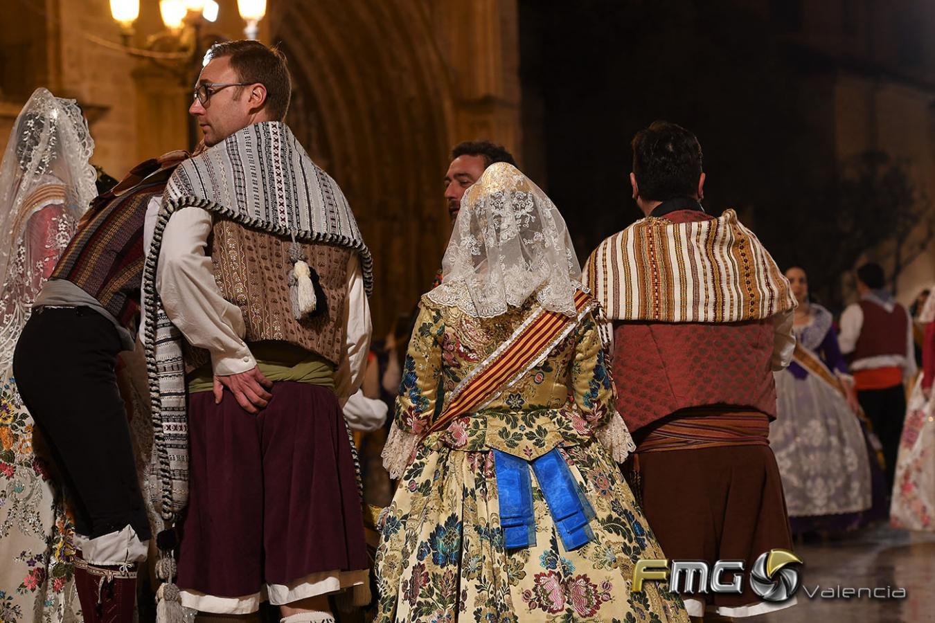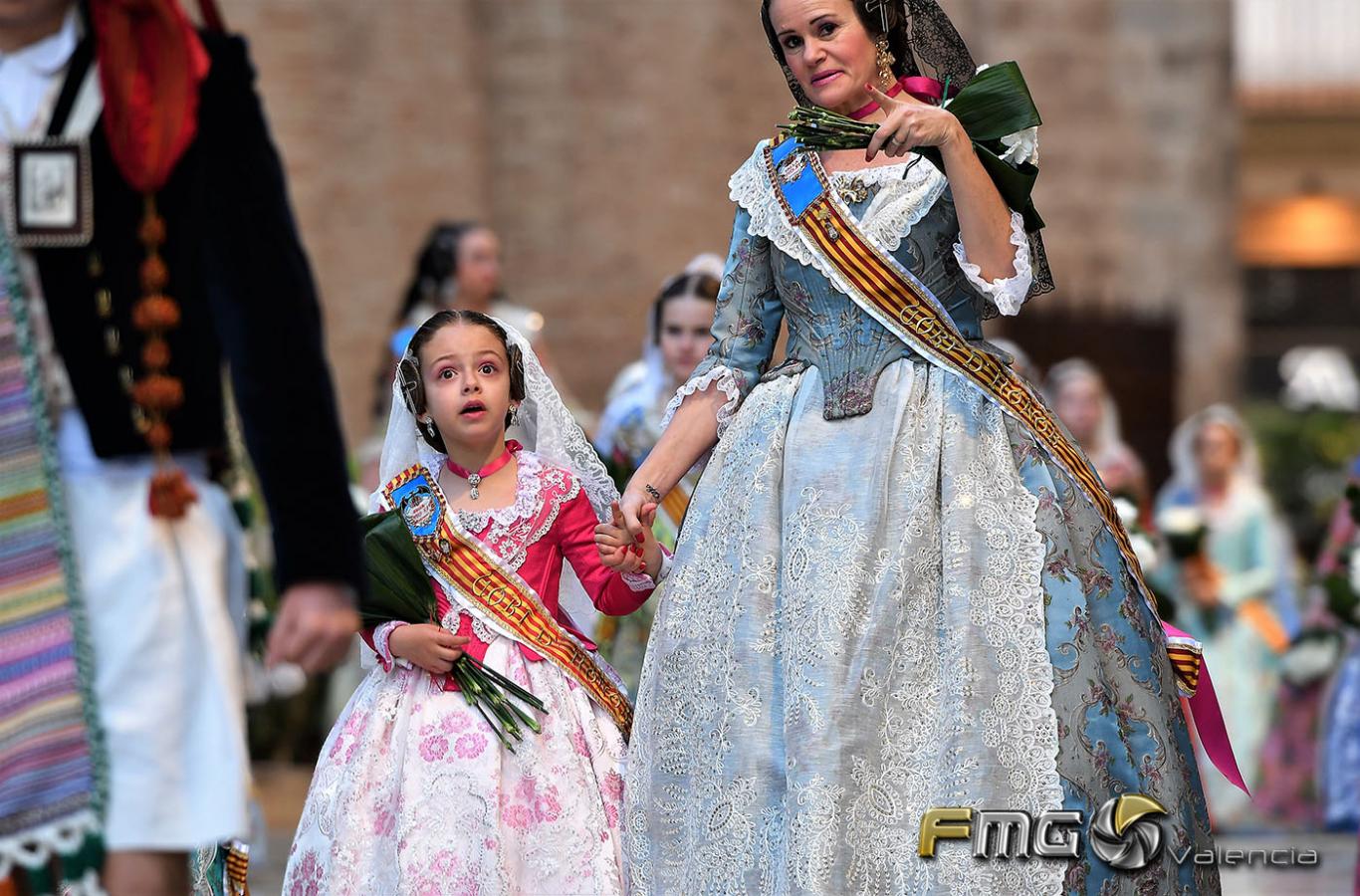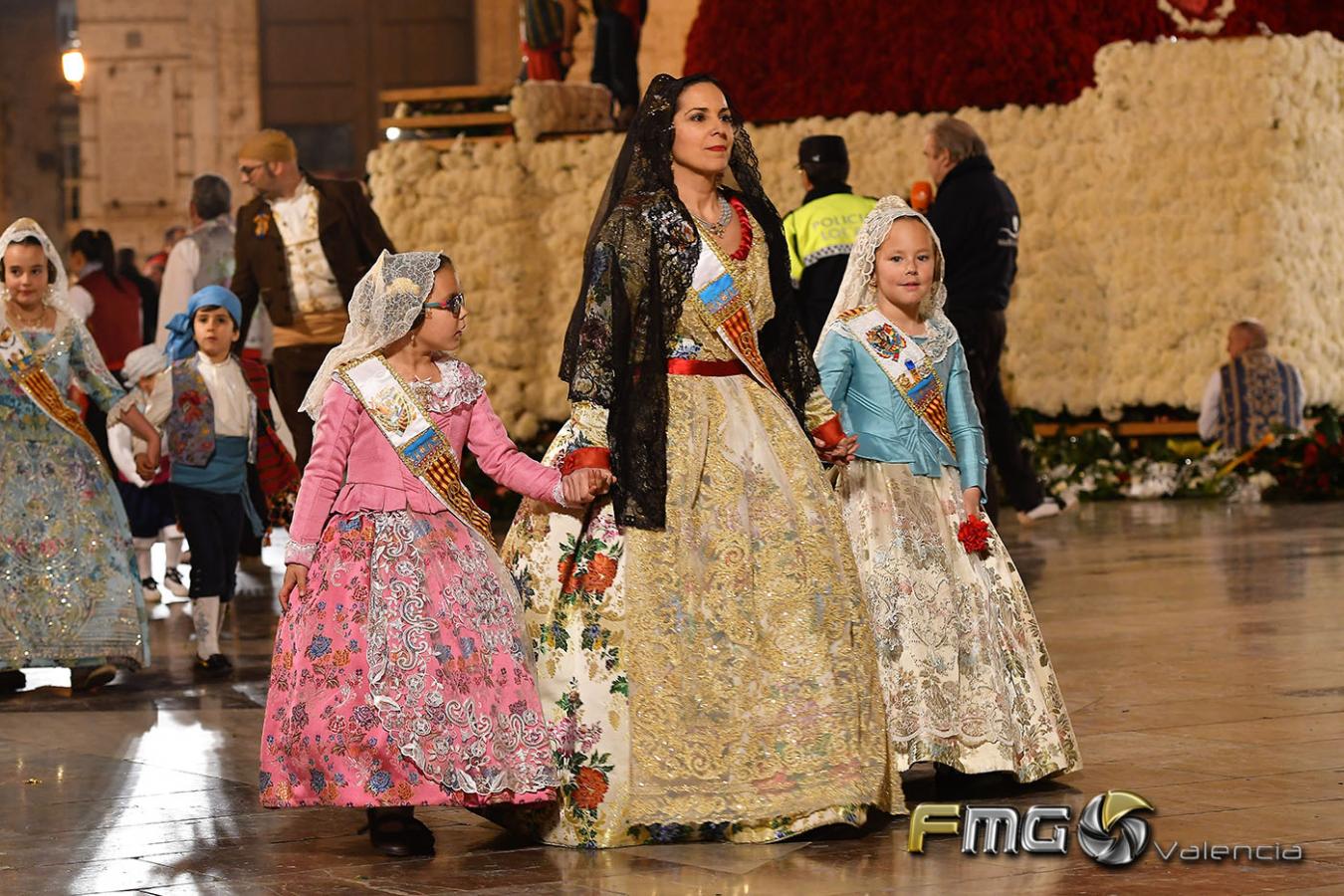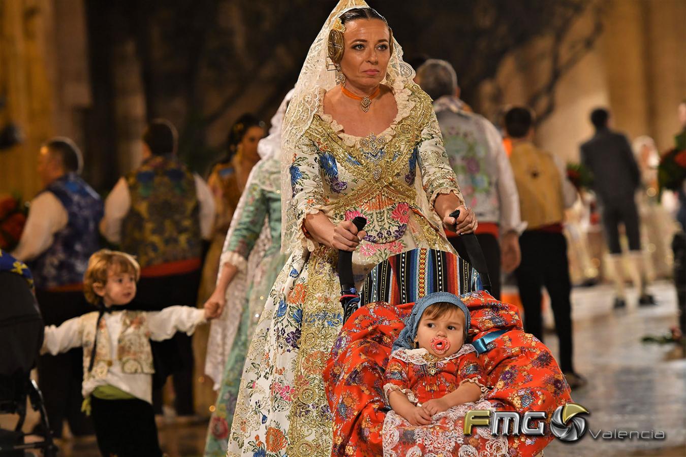 Sobre la 01:30 de la noche hizo su entrada la Fallera Mayor de Valencia Rocío Gil y su Corte de Honor que hicieron la ofrenda a la Mare de Déu con gran emoción durante su recorrido por la Plaza de la Virgen.