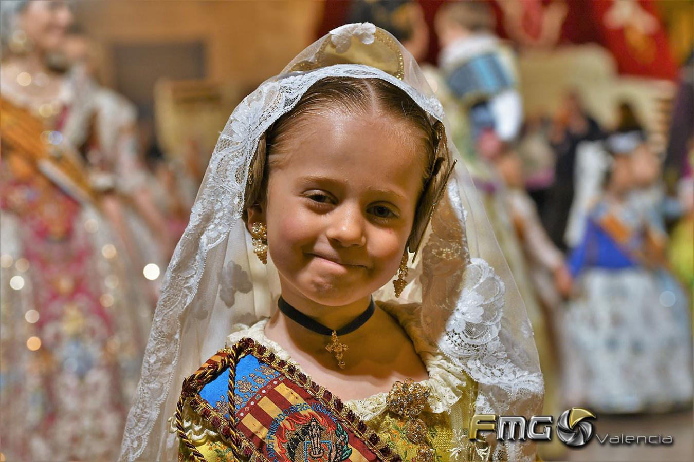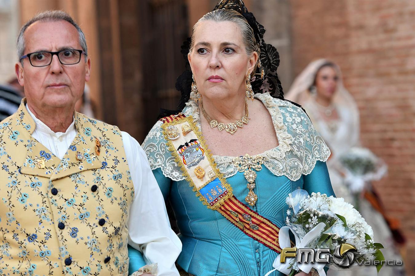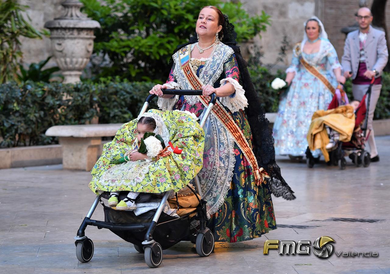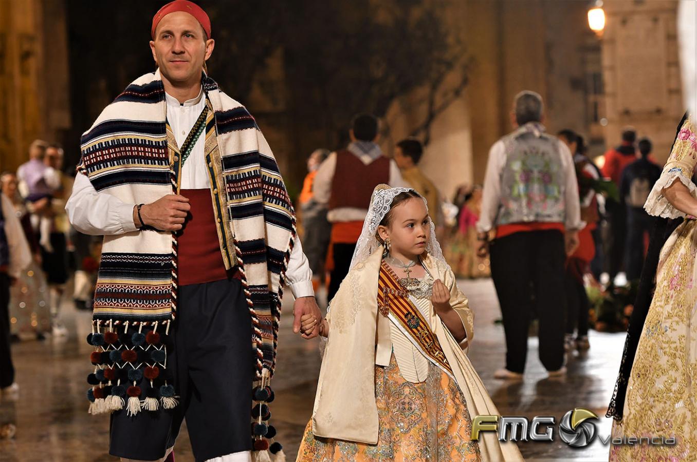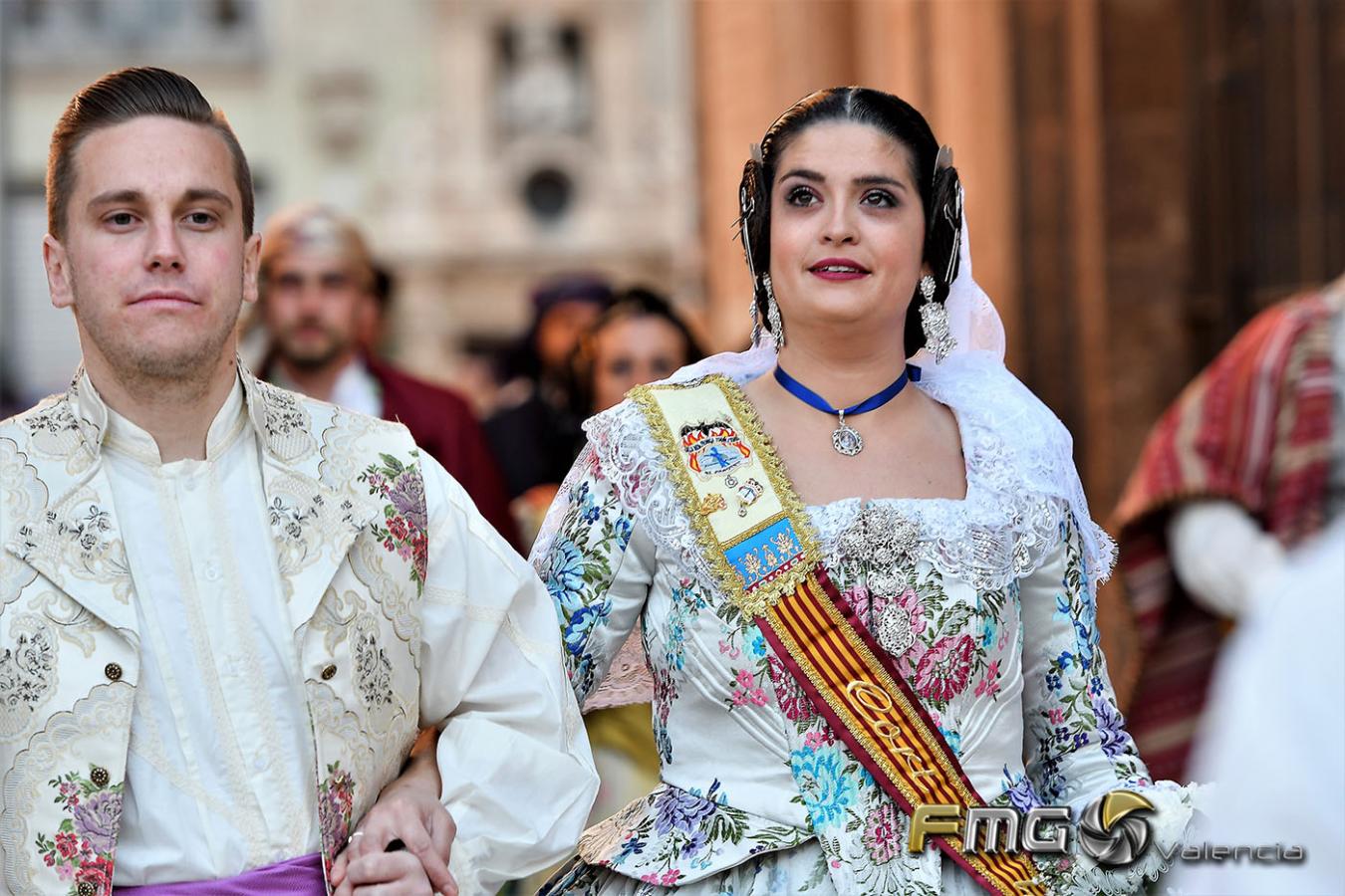 Sobre la 01:30 de la noche hizo su entrada la Fallera Mayor de Valencia Rocío Gil y su Corte de Honor que hicieron la ofrenda a la Mare de Déu con gran emoción durante su recorrido por la Plaza de la Virgen.