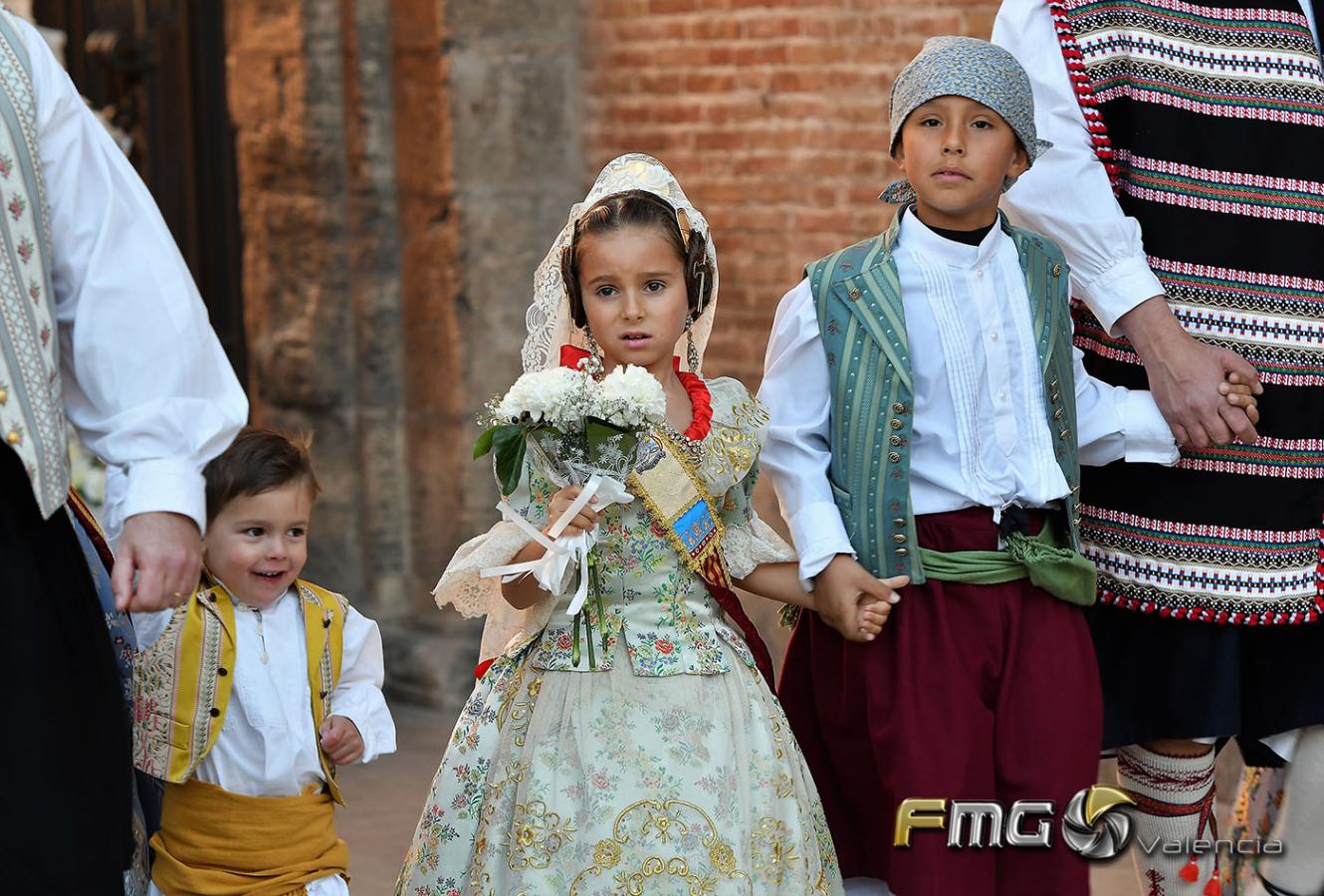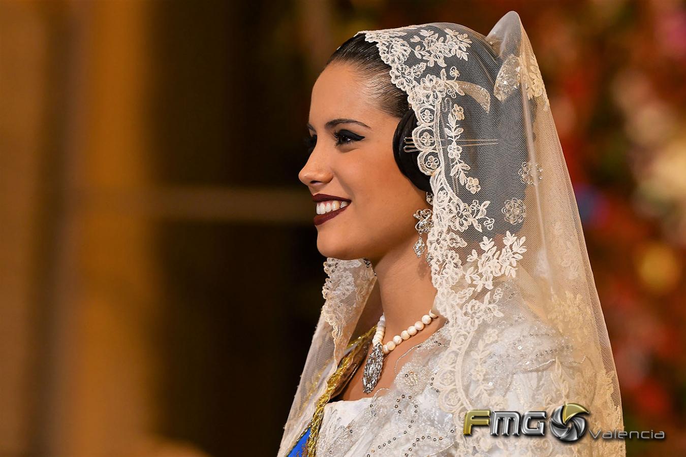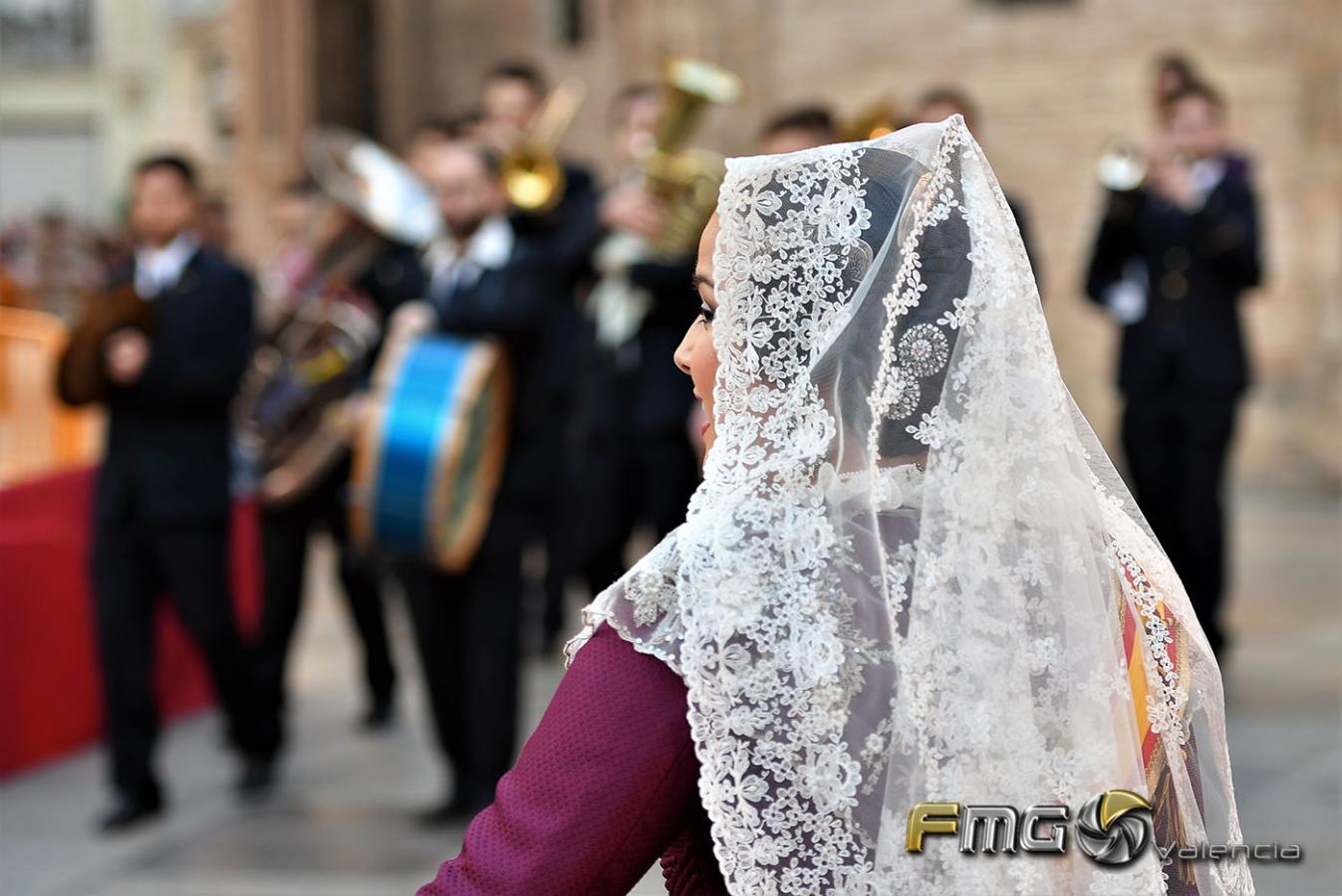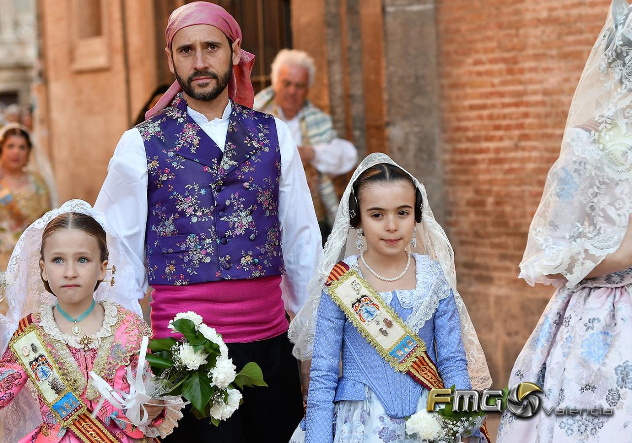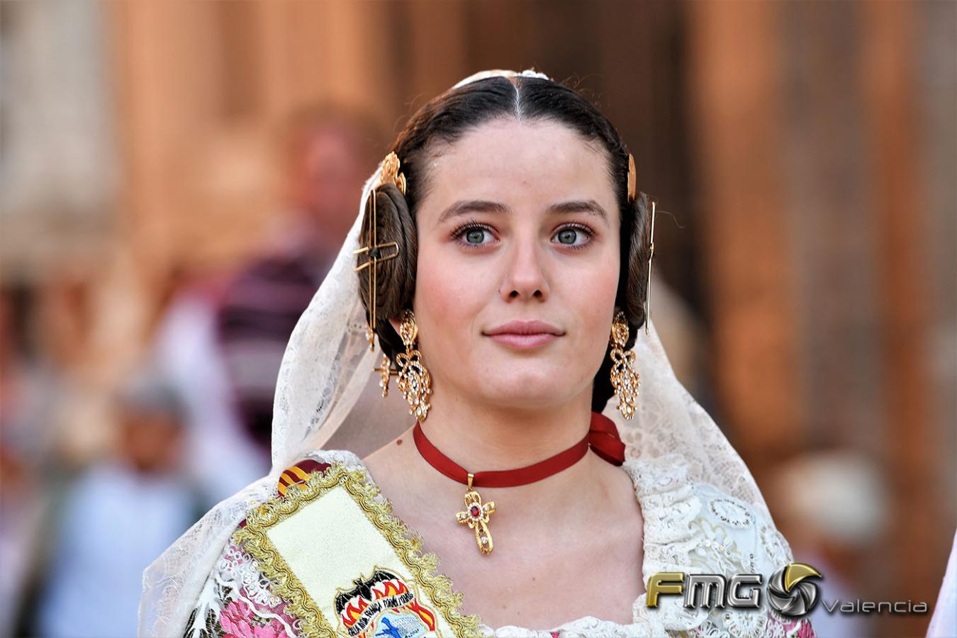 Sobre la 01:30 de la noche hizo su entrada la Fallera Mayor de Valencia Rocío Gil y su Corte de Honor que hicieron la ofrenda a la Mare de Déu con gran emoción durante su recorrido por la Plaza de la Virgen.